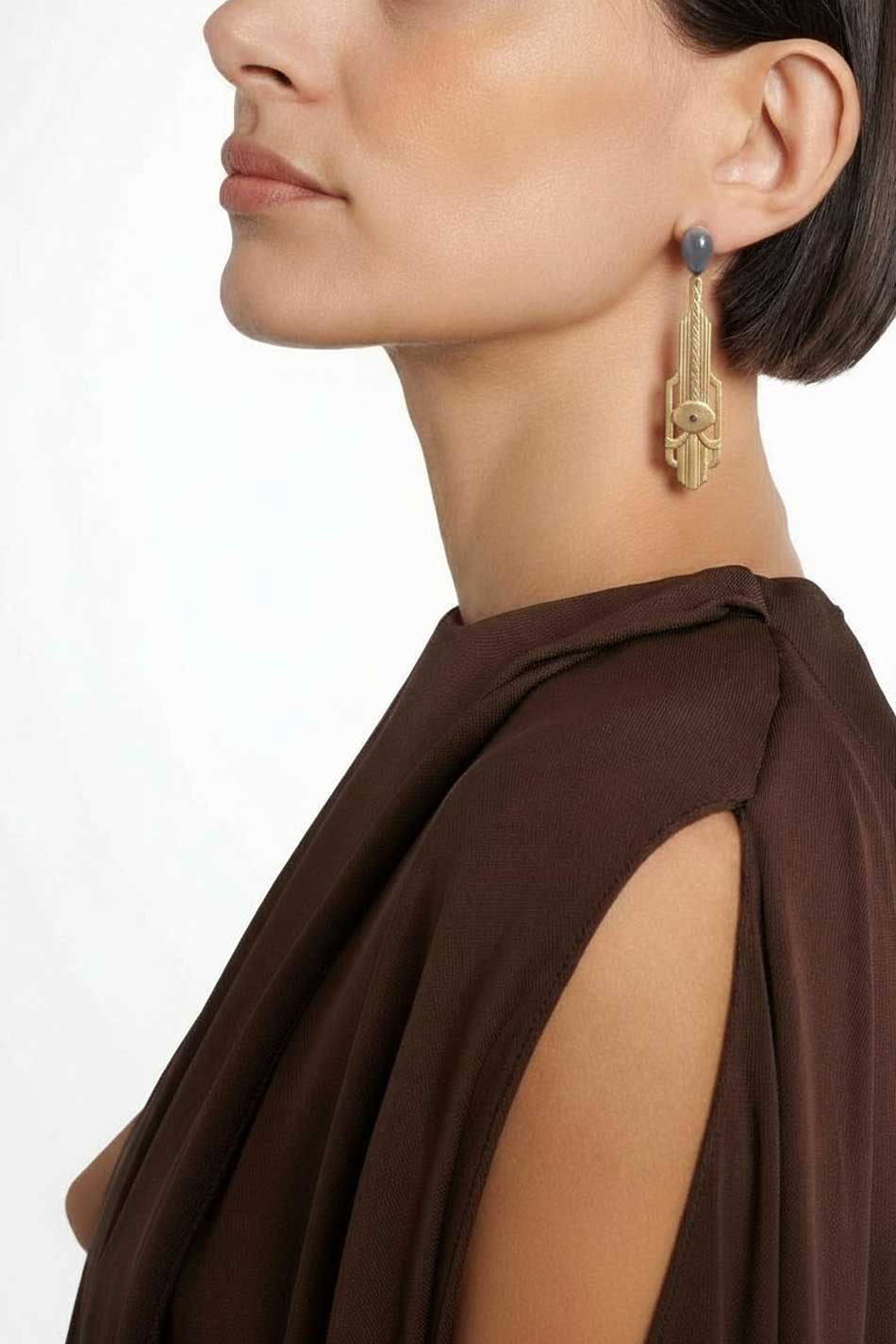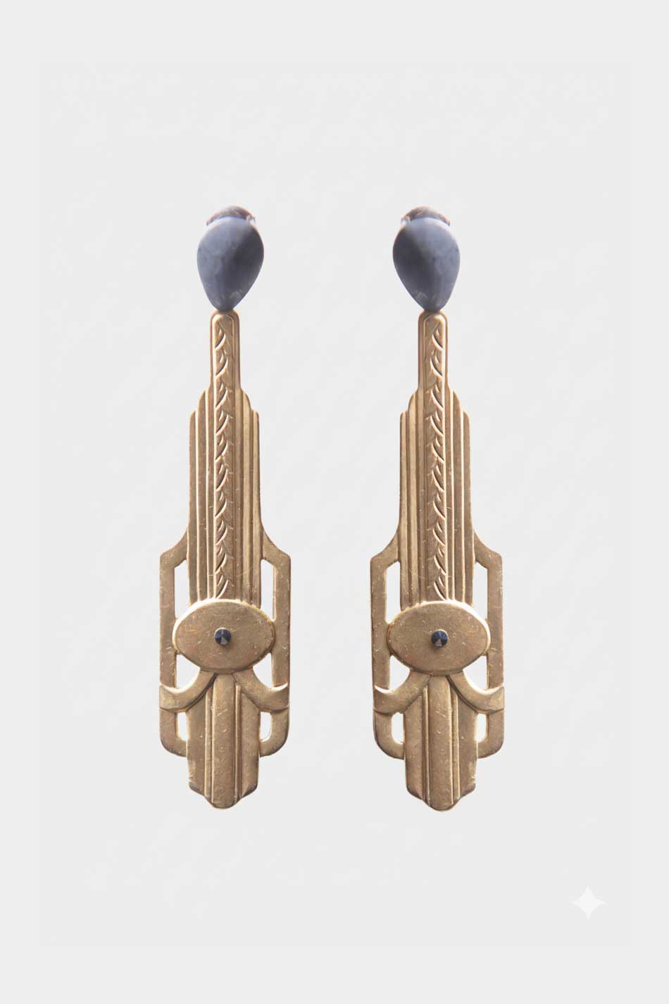 Kolczyki w stylu art deco, geometryczne, nawiązujące zdobieniami do starożytnego Egiptu. Mosiężna forma w złotym kolorze osadzona na srebrnym oksydowanym sztyfcie, ozdobiona małym markazytem. ORYGINALNE!