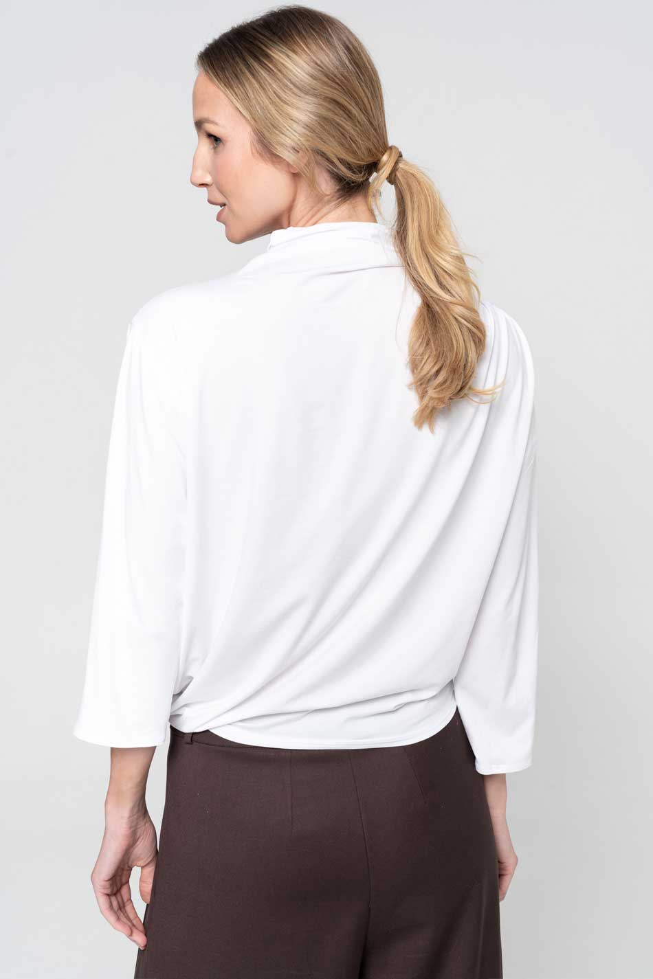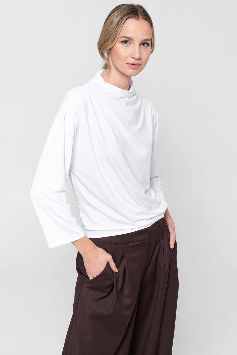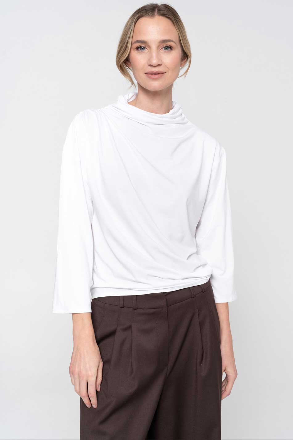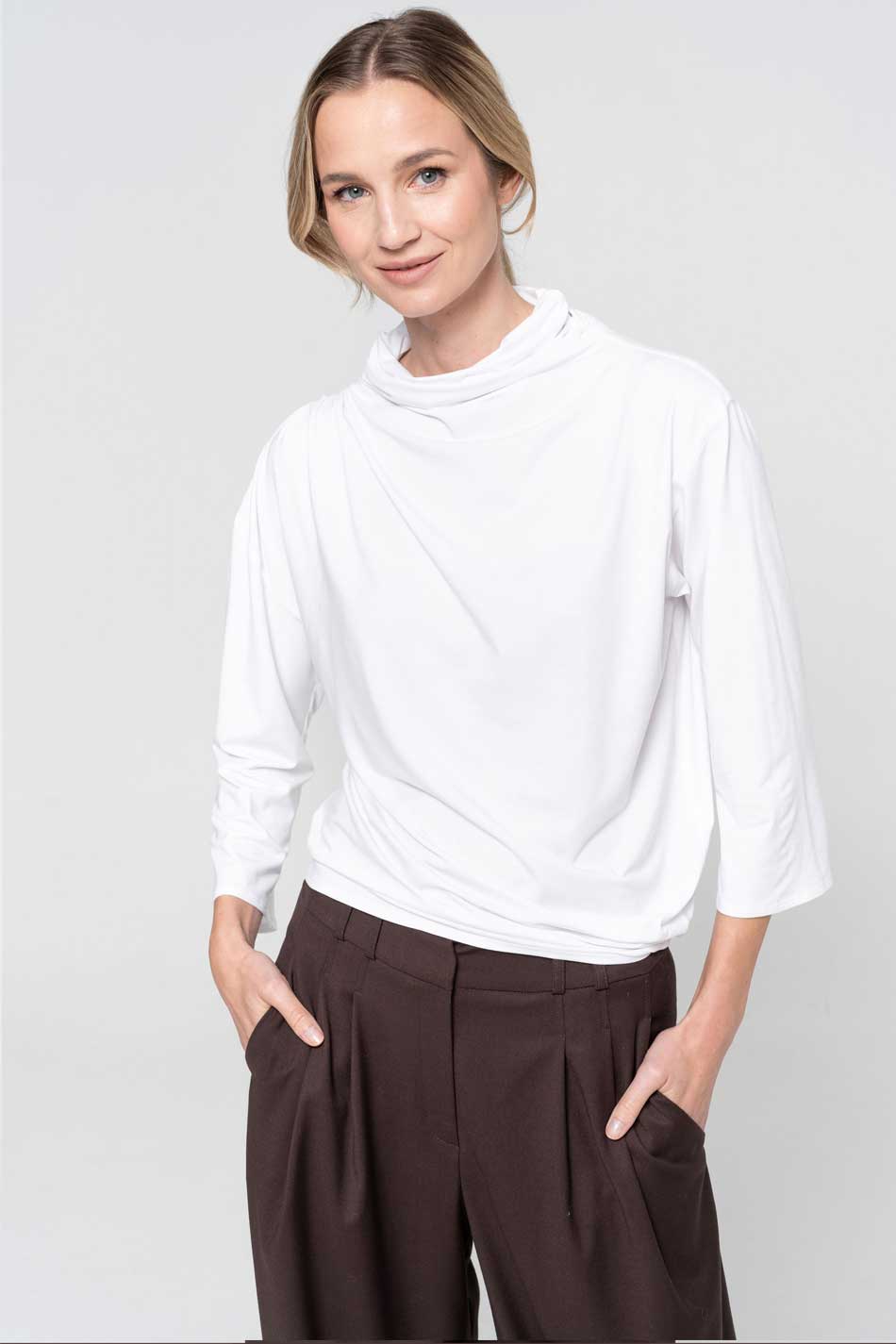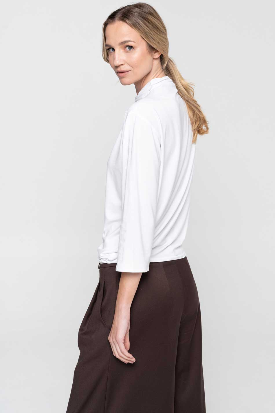 Bluzka No.2/9 biała zachwyca "czystością" koloru i perfekcją formy. Jej półgolf delikatnie otuli szyję, nadając stylizacjom harmonii, a miękkie drapowanie po boku pięknie podkreśli linię talii. Opadające ramiona i rękawy 3/4 tej bluzki stworzą nowoczesny, lekki look, który doskonale wpisze się zarówno w codzienny, jak i okazyjny styl. Naturalna, modalowa dzianina, z której został uszyty ten model, zapewni pełen komfort jego użytkowania, tym bardziej, że dzianina ta nie mechaci się, nie zmienia swojej formy i jest wyjątkowo odporna na uszkodzenia. Bluzka No.2/9 biała idealnie sprawdzi się pod żakietem lub samodzielnie w duecie z elegancką spódnicą czy szerokimi spodniami. "CZYSTA" KLASA!