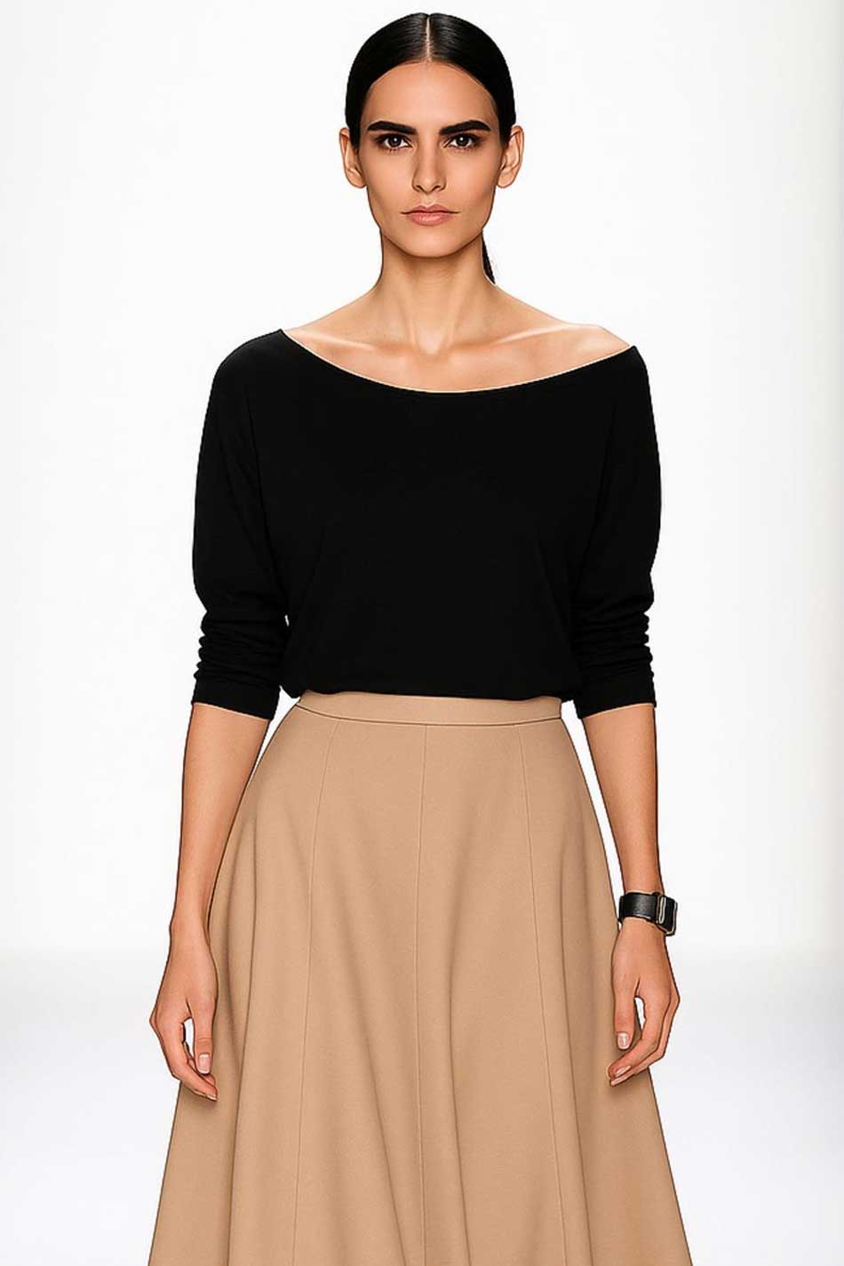 Basicowa bluzka w kolorze czarnym, idealnie sprawdzi się w każdej stylizacja. Prosty, swobodny, niekrępujący ruchów fason z dekoltem w łódkę oraz rękawami z mankietami. Uszyta z doskonałej jakości przewiewnej dzianiny. LIGHT LOOK!