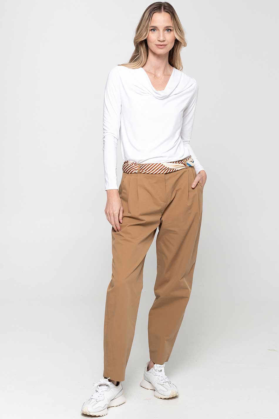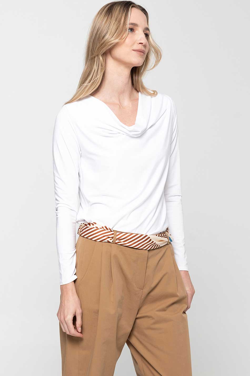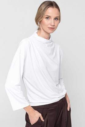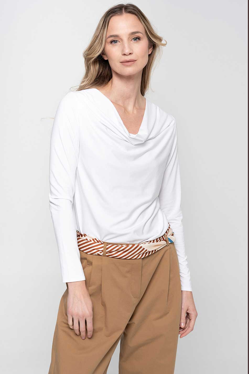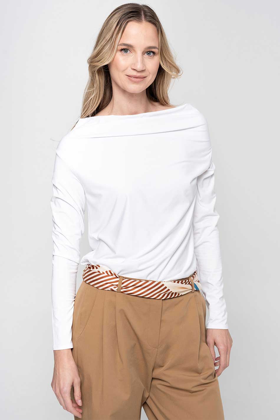 Bluzka woda dwuwarstwowa biała zagwarantuje subtelną elegancję, zarówno na co dzień, jak i od święta. Jej delikatnie opadający dekolt typu „woda” miękko ułoży się wokół szyi, nadając sylwetce lekkości i kobiecego wdzięku. Dopasowany krój tej bluzki podkreśli linię ciała, a długie, opinające rękawy wprowadzą harmonię i wyrafinowany balans między klasyką a nowoczesnością. Model ten uszyty został z dwóch warstw elastycznej dzianiny modalowej, dzięki czemu bluzka ta ma mięsistą strukturę, idealnie kryje i jest trwała. Tkanina ta jest naturalna, oddychająca i odporna na odkształcenia, co sprawia, że bluzka woda dwuwarstwowa biała zachowa swoją formę przez długi czas. Biel tego modelu wprowadzi do stylizacji elegancką czystość i świeżość i doskonale zaprezentuje się on zarówno z klasycznymi spodniami, czy spódnicami, jak i pod marynarką w bardziej formalnych zestawach. PERFEKCJA!