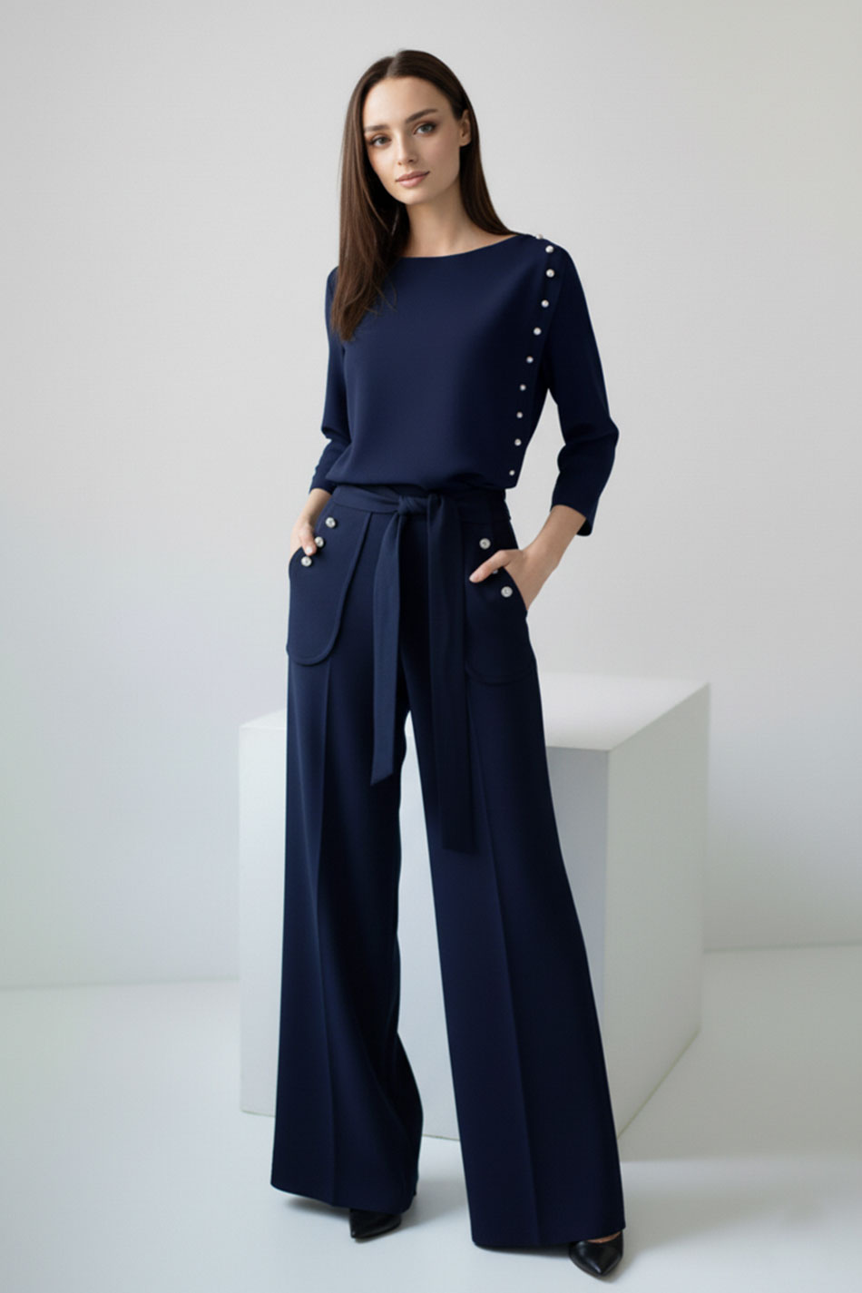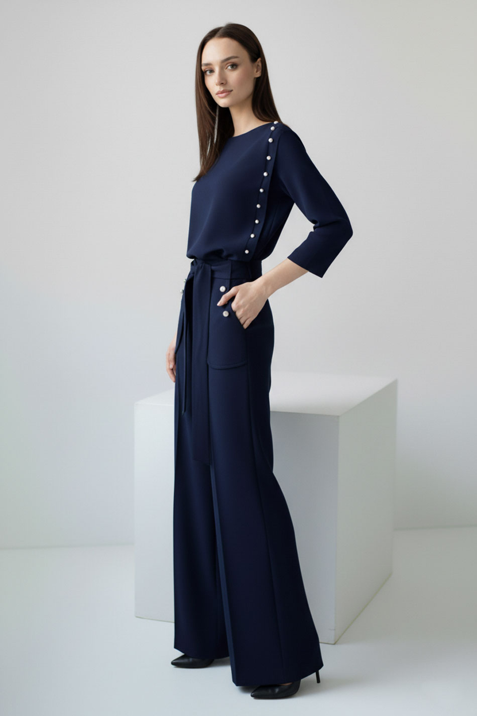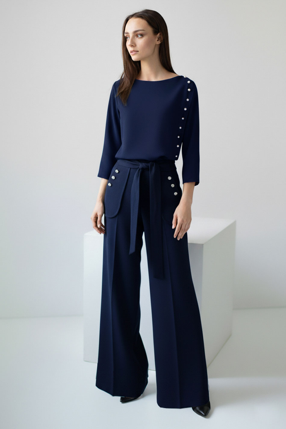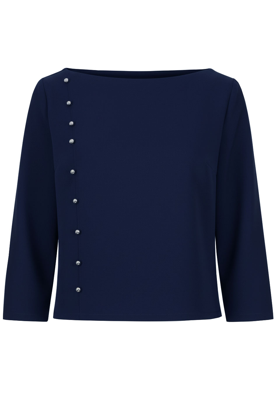 Piękna, krótka bluzka uszyta z nie gniotącej się tkaniny w kolorze ciemno niebieskim/ granatowym, z rękawem ¾. Uroku dodaje plisa z boku imitująca zapięcie z drobnymi, srebrnymi guzikami - kółeczkami idącymi od ramienia do dół bluzki. Zapinana z tyłu na zamek kryty. Świetnie będzie wyglądać do spódnicy z wysokim stanem lub spodniami w stylu dzwony w tym samym lub innym kolorze od VerityHunt. Możliwość odszycia bluzki w innym rozmiarze i kolorze na zamówienie indywidualne. WYGODA I ELEGANCJA!