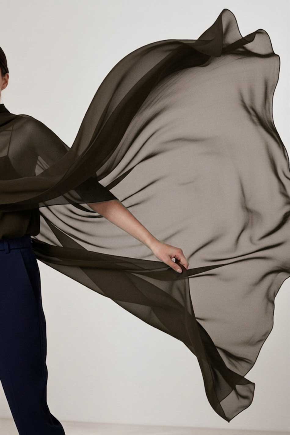 Szyfon jedwabny, to niezwykle lekka i zwiewna tkanina o delikatnie półtransparentnej strukturze, która subtelnie otula sylwetkę. Dzięki swojej miękkości i płynności pięknie się układa, tworząc efekt lekkości i naturalnej elegancji niczym delikatna mgiełka.