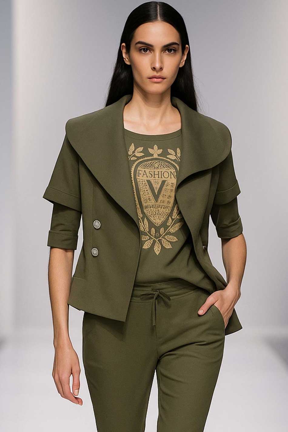 Oryginalny, krótki frak o ciekawym kroju z dużym, wykładanym szalowym kołnierzem, krótkim rękawkiem, ozdobnymi guzikami. Dopasowany w pasie, krótszy z przodu, dłuższy z tyłu, zapięcie – pasek z klamerką na magnes, bez podszewki, wszystkie szwy wewnętrzne odszyte lamówką. To nowoczesna propozycja dla odważnych kobiet. Idealnie pasuje do luźnych, sportowych spodni. WYRÓŻNIJ SIĘ!