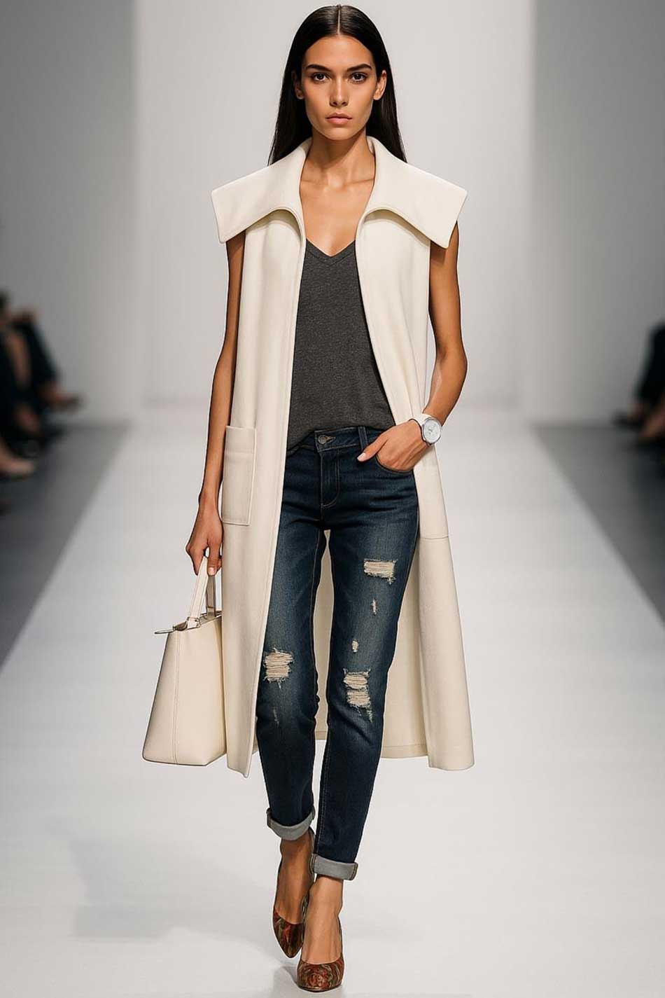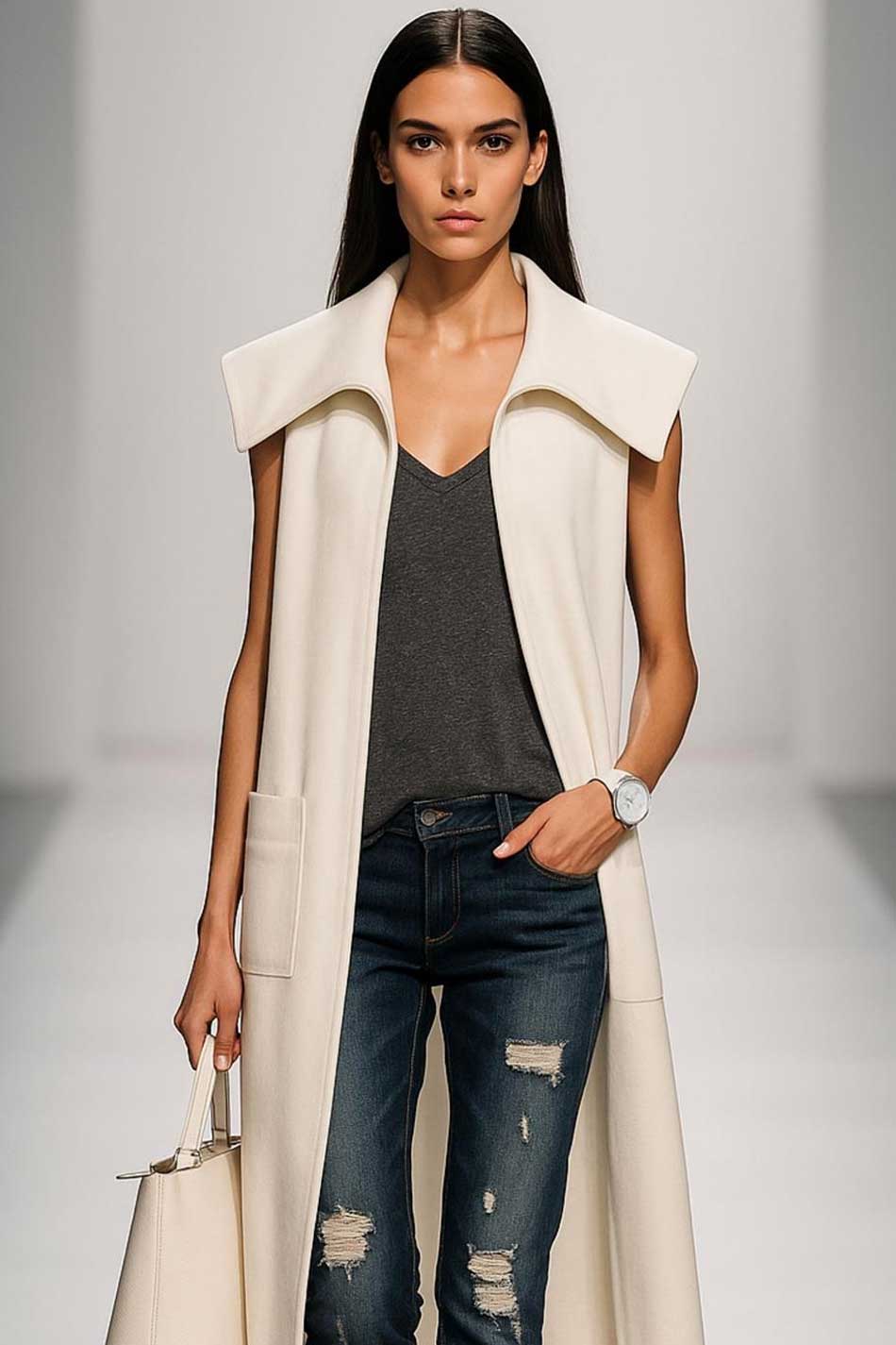 Kamizelka z dużym wykładanym kołnierzem, uszyta z z wysokiej jakości wiskozy w kolorze ecru. Długość midi, bez dodatkowych zapięć, zakładane przody, dłuższy tył, z naszywanymi kieszeniami. Kamizelka pięknie wydłuża ciało i prezentuje się fantastycznie zarówno w zestawieniu z sukienką, jak i ze spodniami. DOPEŁNIA KAŻDY LOOK!