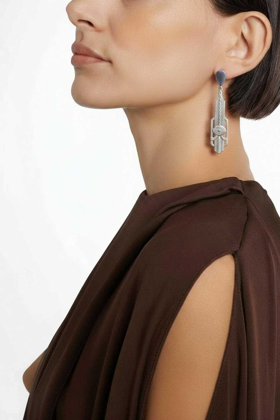 Kolczyki w stylu art deco, geometryczne, nawiązujące zdobieniami do starożytnego Egiptu. Mosiężna forma w srebrnym kolorze osadzona na srebrnym oksydowanym sztyfcie, ozdobiona małym markazytem. ATRAKCYJNE!