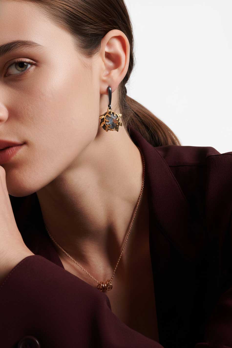 Takich kolczyków nie znajdziesz nigdzie indziej! Mosiężny wieniec laurowy w kolorze złotym oplatający szarą kulkę larvikitu, to coś ultra unikatowego i niezwykłego! Tych kolczyków NIE DA SIĘ PRZEOCZYĆ!