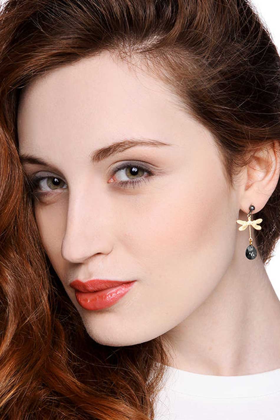 Piękne, złote kolczyki stylizowane motywem ważki, bogate w detale oraz ozdobione dodatkowo kryształkiem Swarovskiego w kolorze czarnym. Całość zawieszony na drobnym sztyfcie. ZJAWISKOWE!