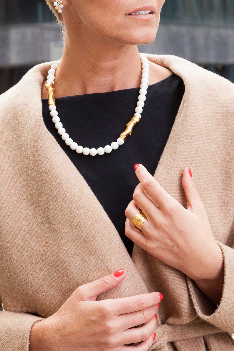 Jedyny w swoim rodzaju, bardzo elegancki naszyjnik wykonany z czarnych korali i złoconych gałązek fig. Biżuteria ta w cudowny sposób uzupełni wiele stylizacji, nawet na wyjątkowe okazje i nada im niezwykłego wyrazu. ZJAWISKOWY LOOK!