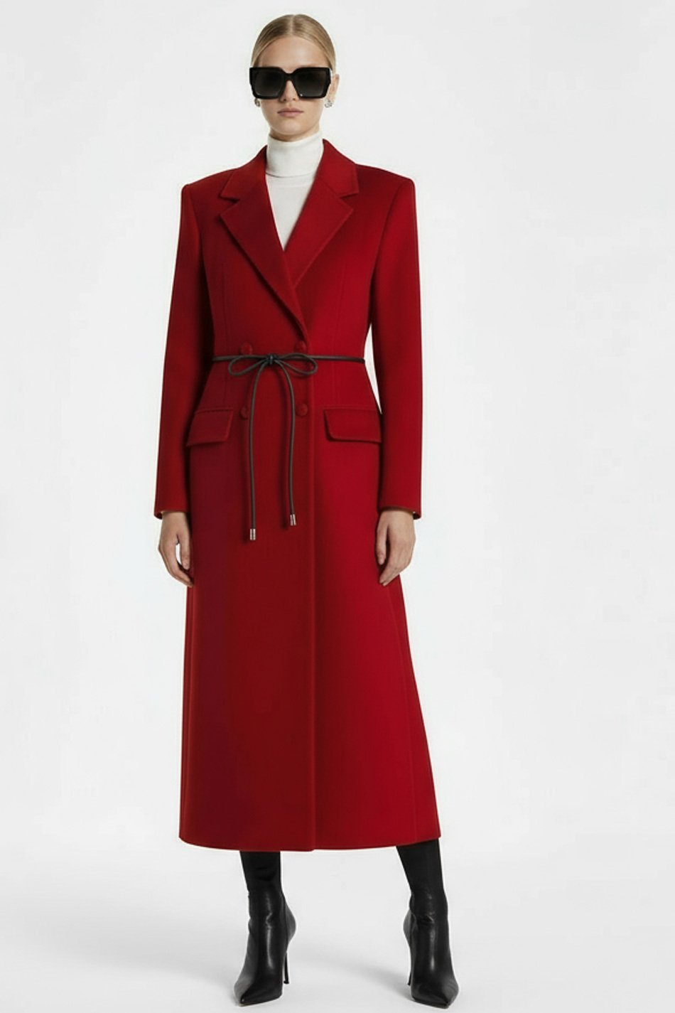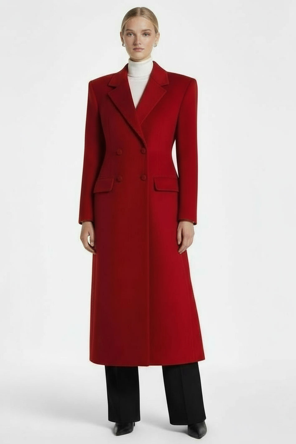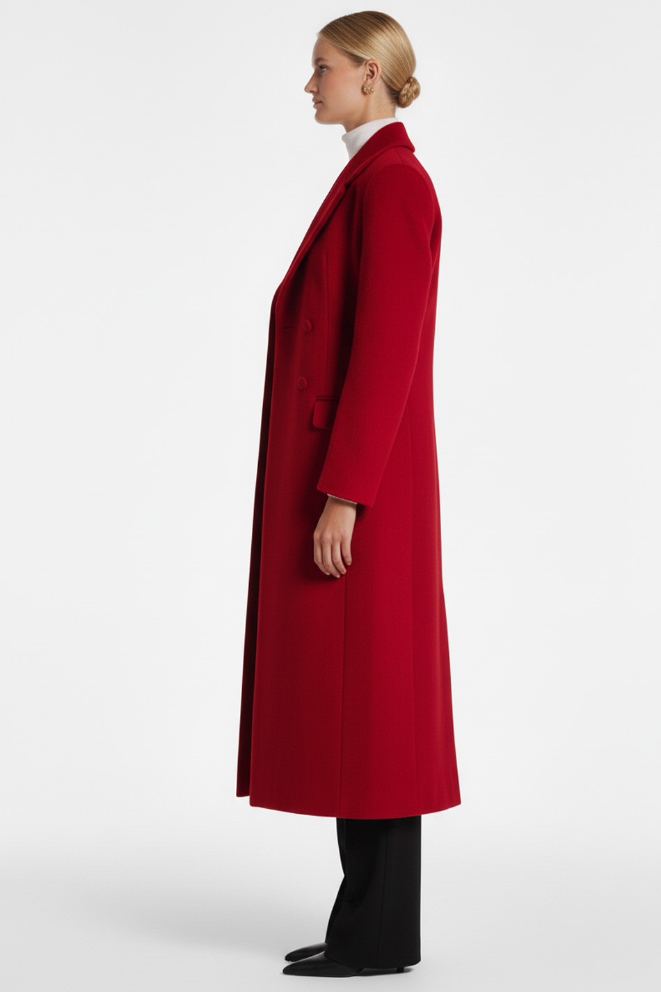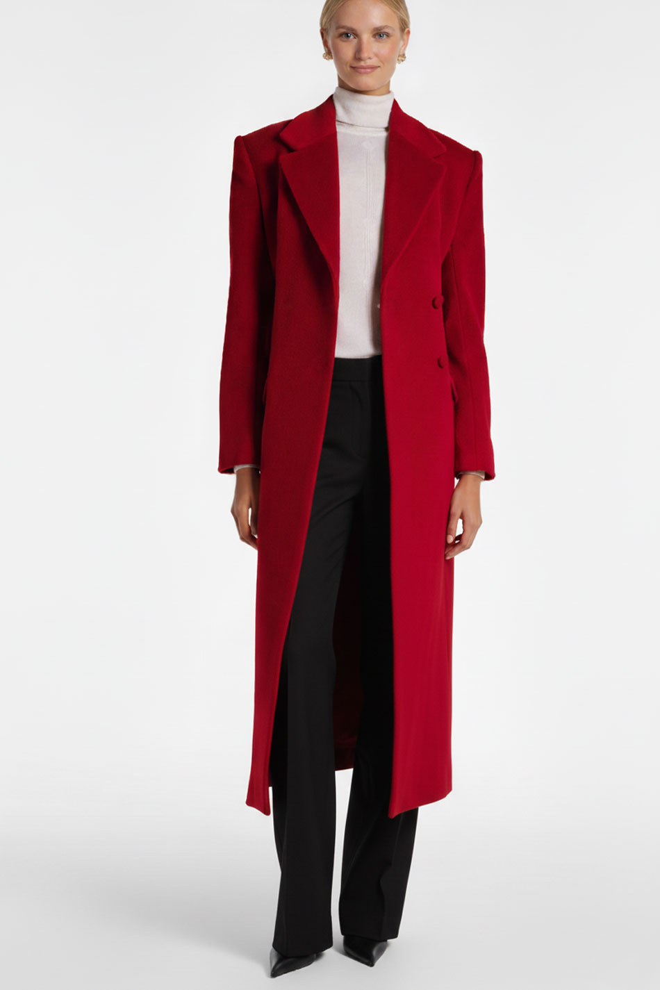 Piękny, elegancki, dopasowany, dwurzędowy, ponadczasowy płaszcz uszyty ze 100% czerwonej wełny. Dopasowany w talii (zaszewki modelujące z przodu i z tyłu), dwurzędowy, zapinany na oblekane tkaniną guziki. Z tyłu rozporek, na wiskozowej podszewce. Pięknie wymodelowane, lekko poszerzone, usztywnione ramiona. Kieszenie wpuszczane z patką z przodu płaszcza, kołnierz z klapami zapinanymi w serek. Minimalistyczny elegancje, wyrazisty kolor – robi wrażenie. Możesz nosić do spodni, do sukienki, możesz też przewiązać pasek w talii. Elegancki, ciepły, ponadczasowy! KLASA SAMA W SOBIE!