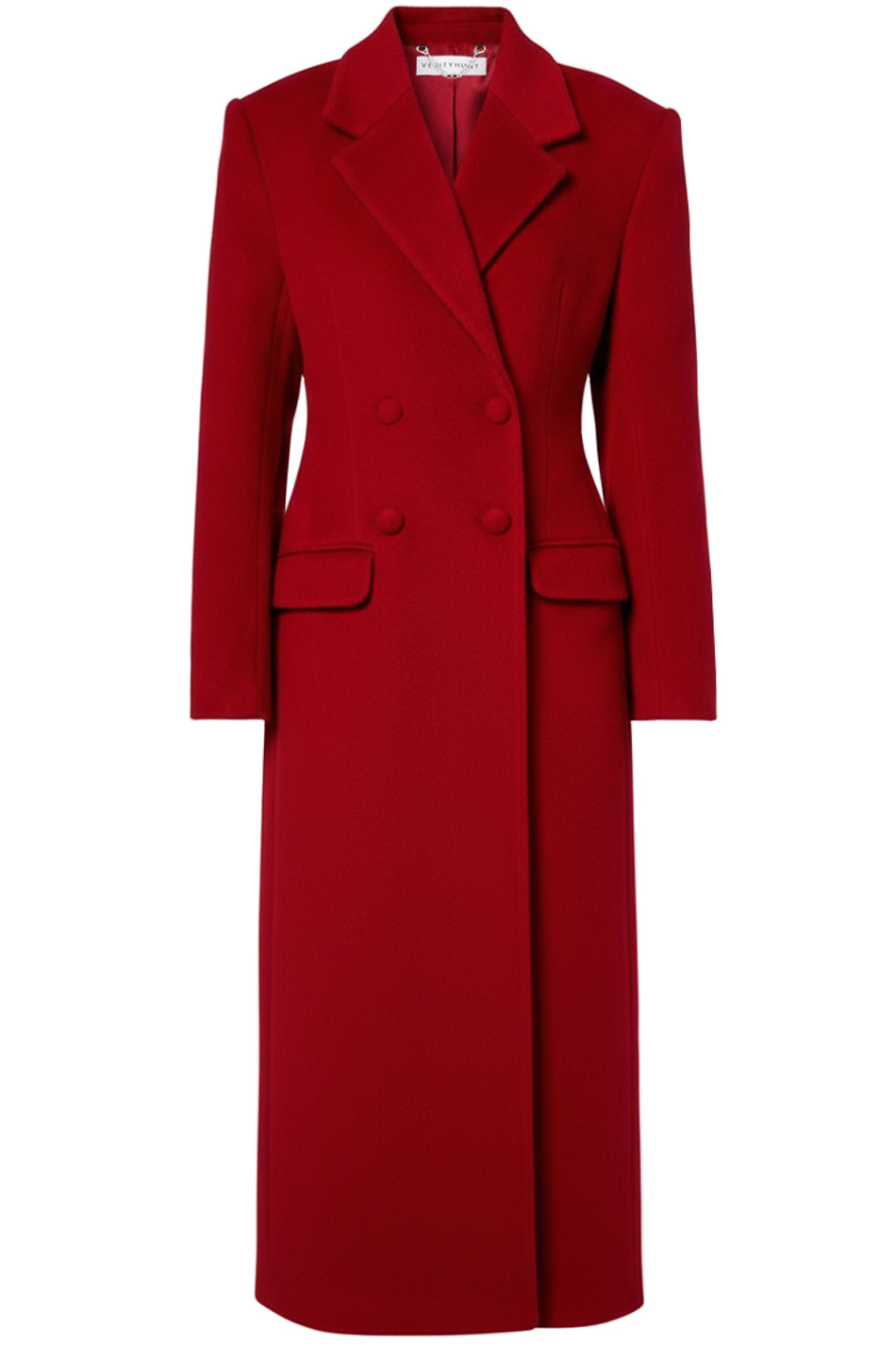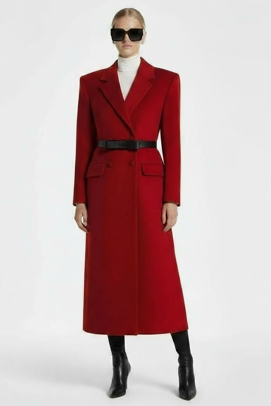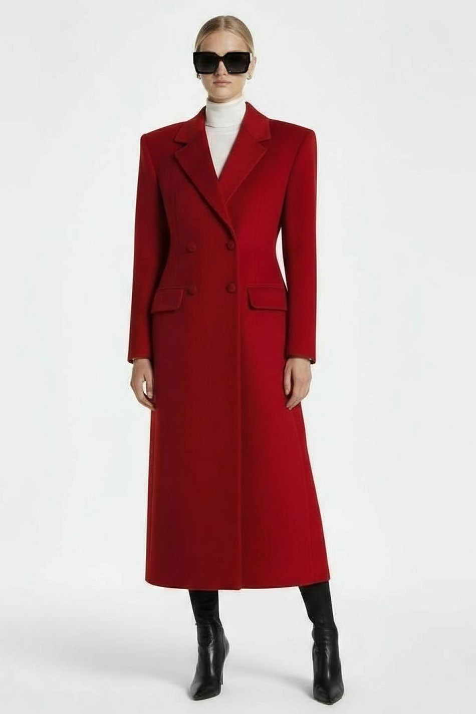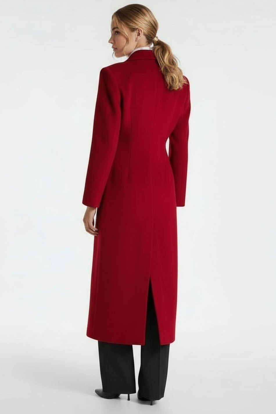 Piękny, elegancki, dopasowany, dwurzędowy, ponadczasowy płaszcz uszyty ze 100% czerwonej wełny. Dopasowany w talii (zaszewki modelujące z przodu i z tyłu), dwurzędowy, zapinany na oblekane tkaniną guziki. Z tyłu rozporek, na wiskozowej podszewce. Pięknie wymodelowane, lekko poszerzone, usztywnione ramiona. Kieszenie wpuszczane z patką z przodu płaszcza, kołnierz z klapami zapinanymi w serek. Minimalistyczny elegancje, wyrazisty kolor – robi wrażenie. Możesz nosić do spodni, do sukienki, możesz też przewiązać pasek w talii. Elegancki, ciepły, ponadczasowy! KLASA SAMA W SOBIE!