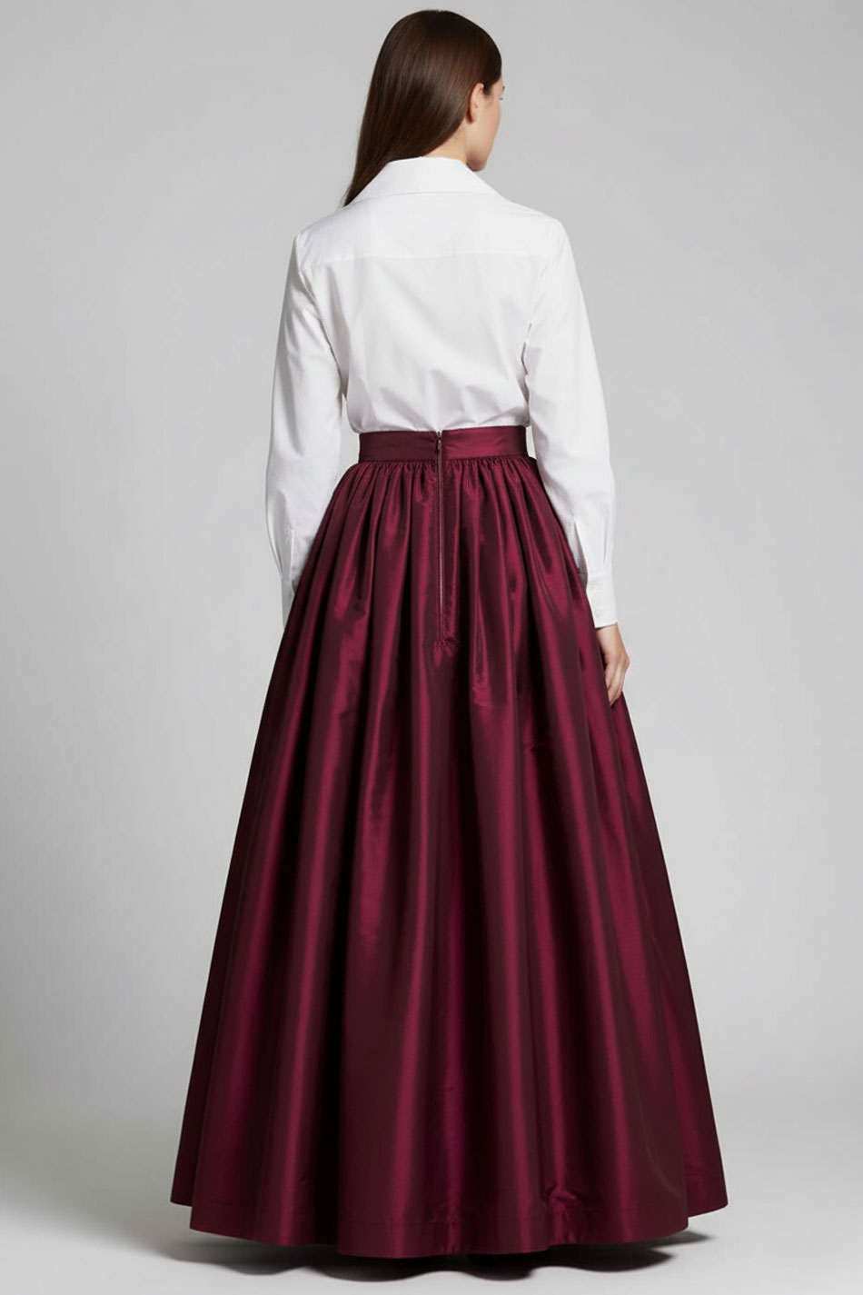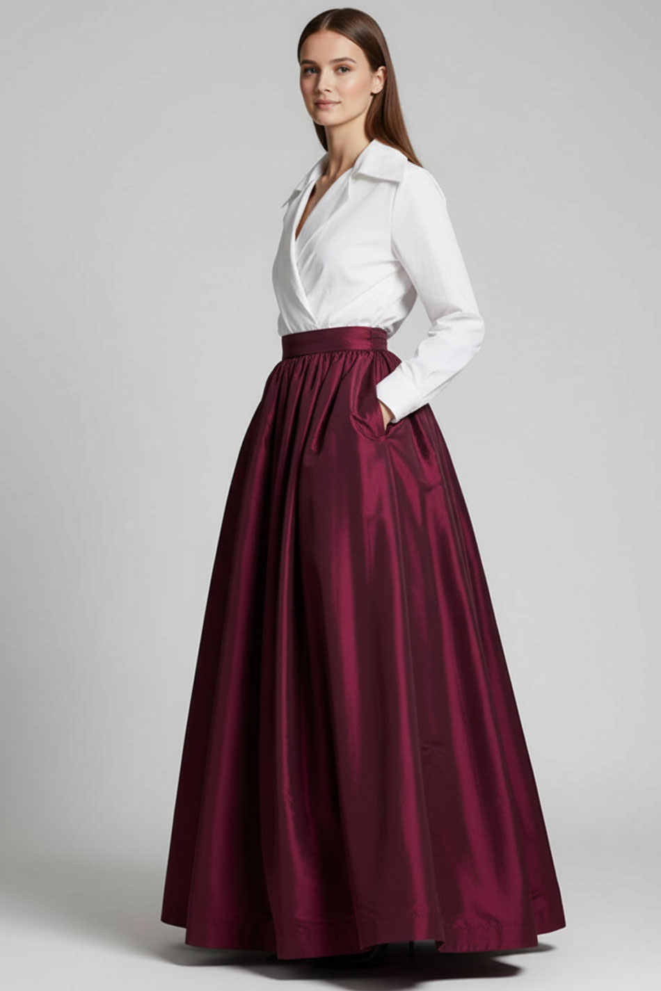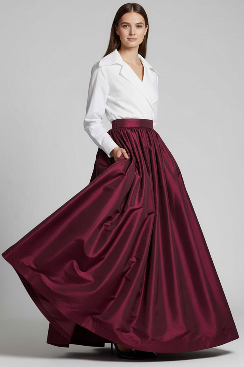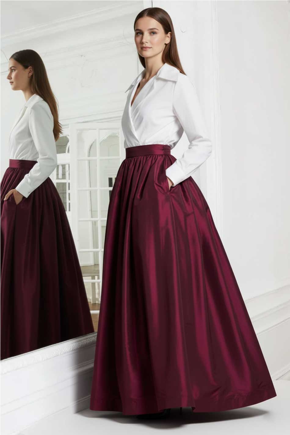 Piękna, długa, wieczorowa spódnica uszyta z tafty w kolorze bordowym/ burgundowym. Spódnica rozkloszowana, mocno marszczona w talii. Dodatkowo do spódnicy dwa paski: jeden szerokości około 6 cm, drugi szeroki do związania szerokiej, obszernej kokardy. Kieszenie w szwach bocznych. Do spódnicy doszyta halka z podszewki, którą można założyć pod spódnicę. Spódnica zapinana z tyłu na zamek kryty. Idealna na wiele okazji, z elegancką bluzką, topem, krótkim żakietem sprawdzi się podczas wszelkich formalnych i wieczorowych spotkań, a z prostym topem, krótką kurtką idealna do codziennych stylizacji. IDEALNA!