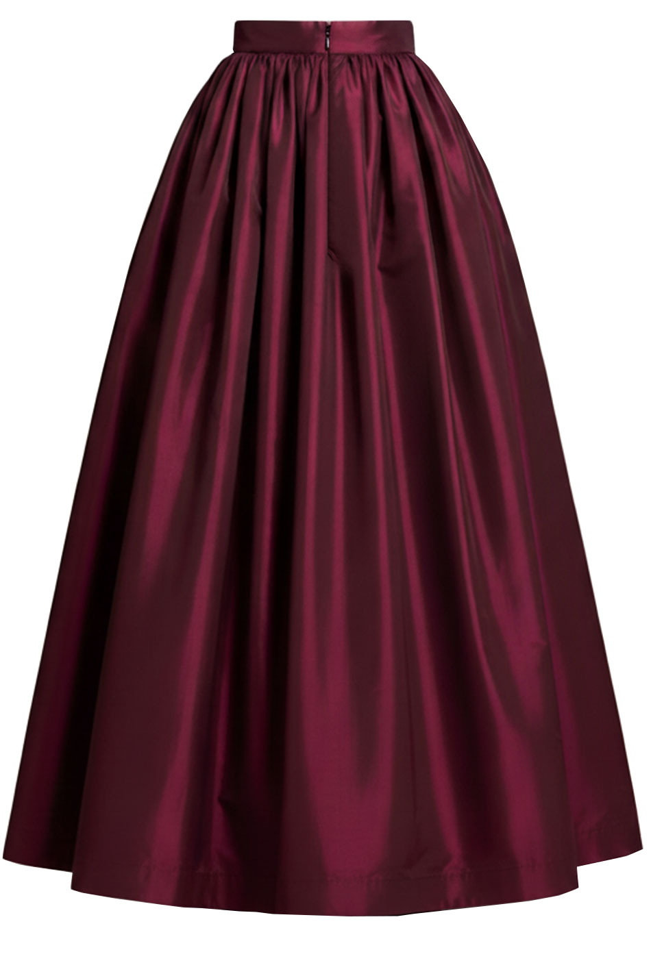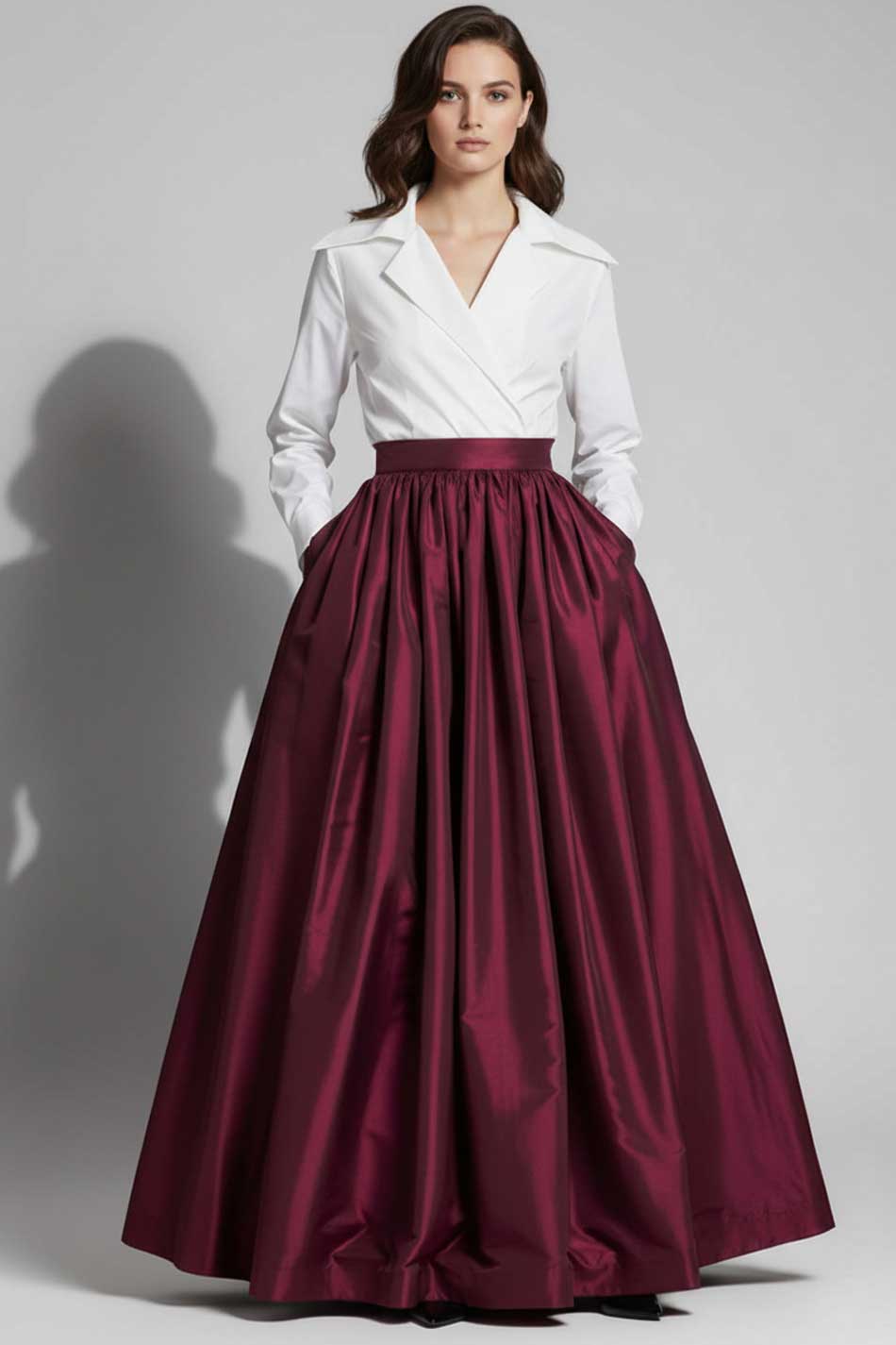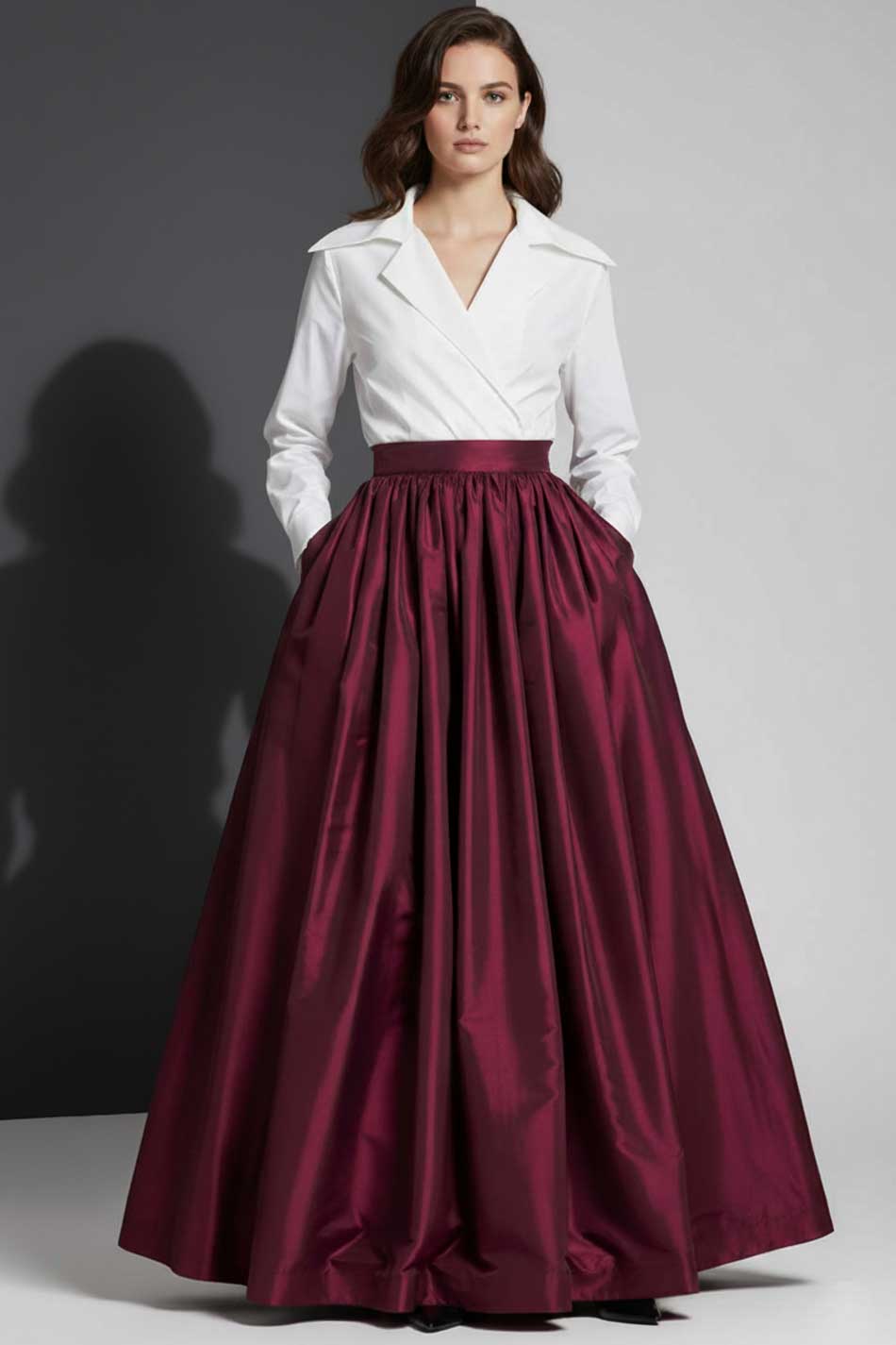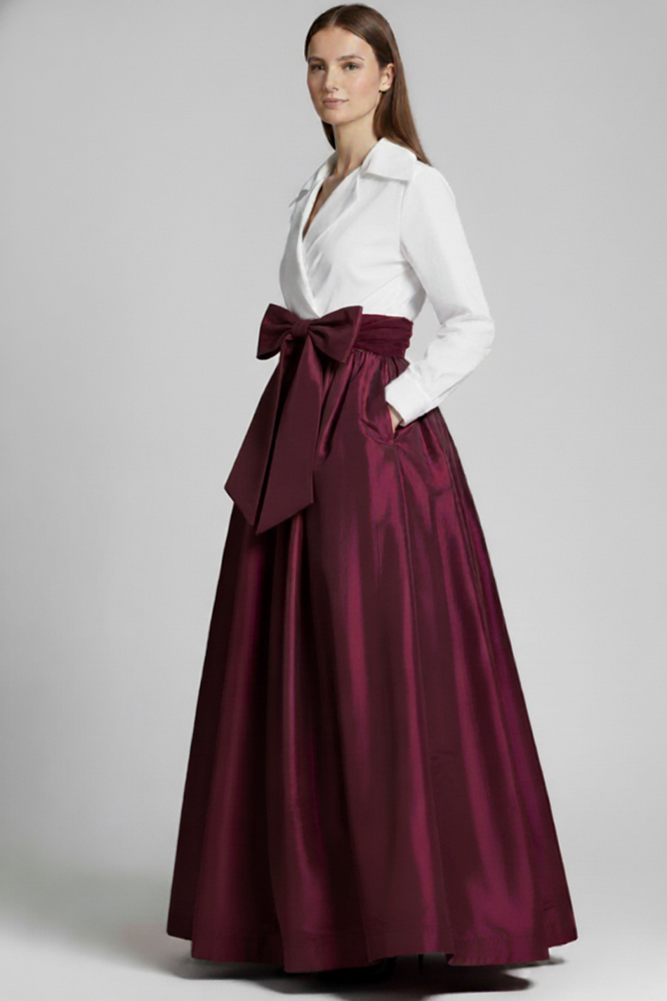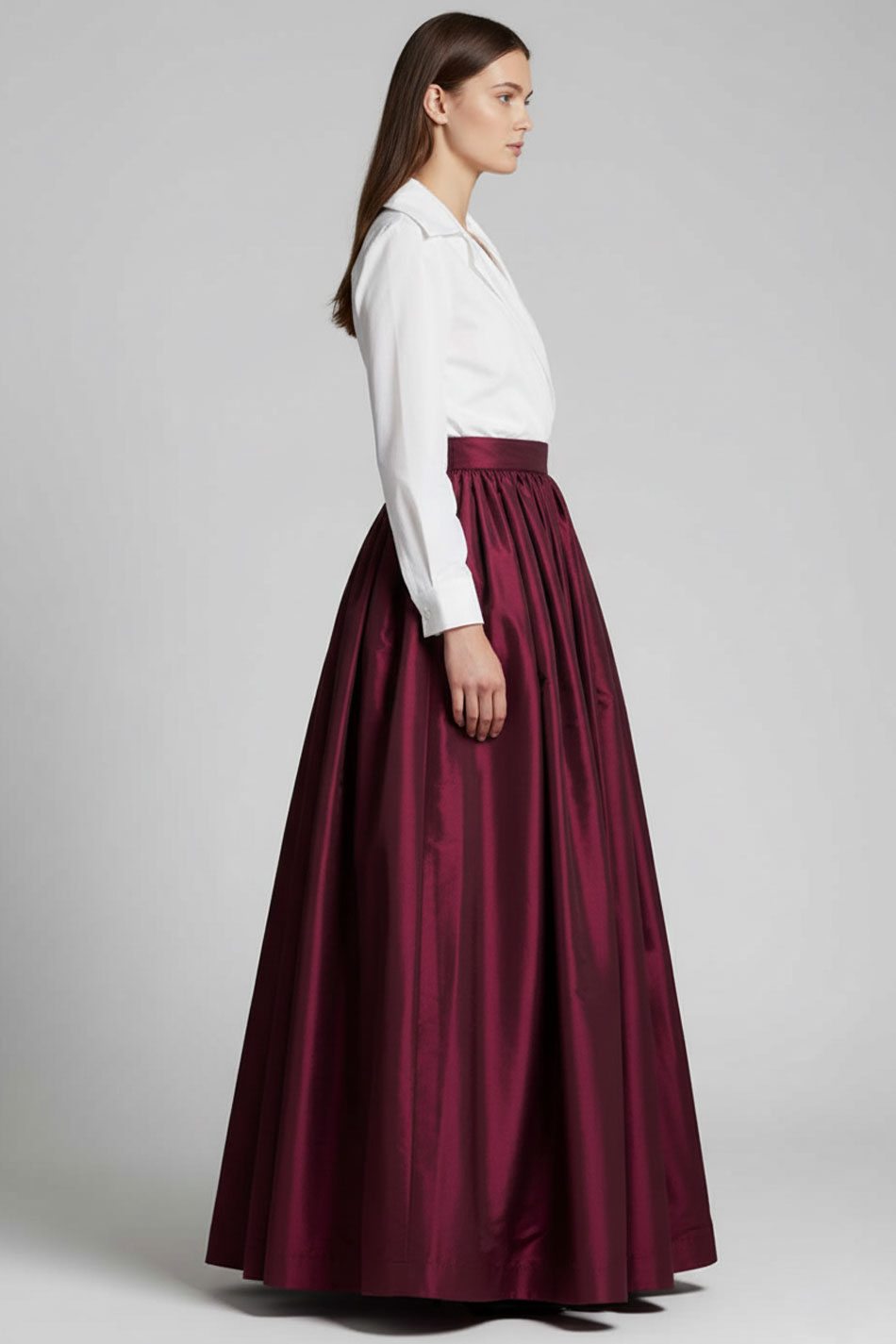 Piękna, długa, wieczorowa spódnica uszyta z tafty w kolorze bordowym/ burgundowym. Spódnica rozkloszowana, mocno marszczona w talii. Dodatkowo do spódnicy dwa paski: jeden szerokości około 6 cm, drugi szeroki do związania szerokiej, obszernej kokardy. Kieszenie w szwach bocznych. Do spódnicy doszyta halka z podszewki, którą można założyć pod spódnicę. Spódnica zapinana z tyłu na zamek kryty. Idealna na wiele okazji, z elegancką bluzką, topem, krótkim żakietem sprawdzi się podczas wszelkich formalnych i wieczorowych spotkań, a z prostym topem, krótką kurtką idealna do codziennych stylizacji. IDEALNA!