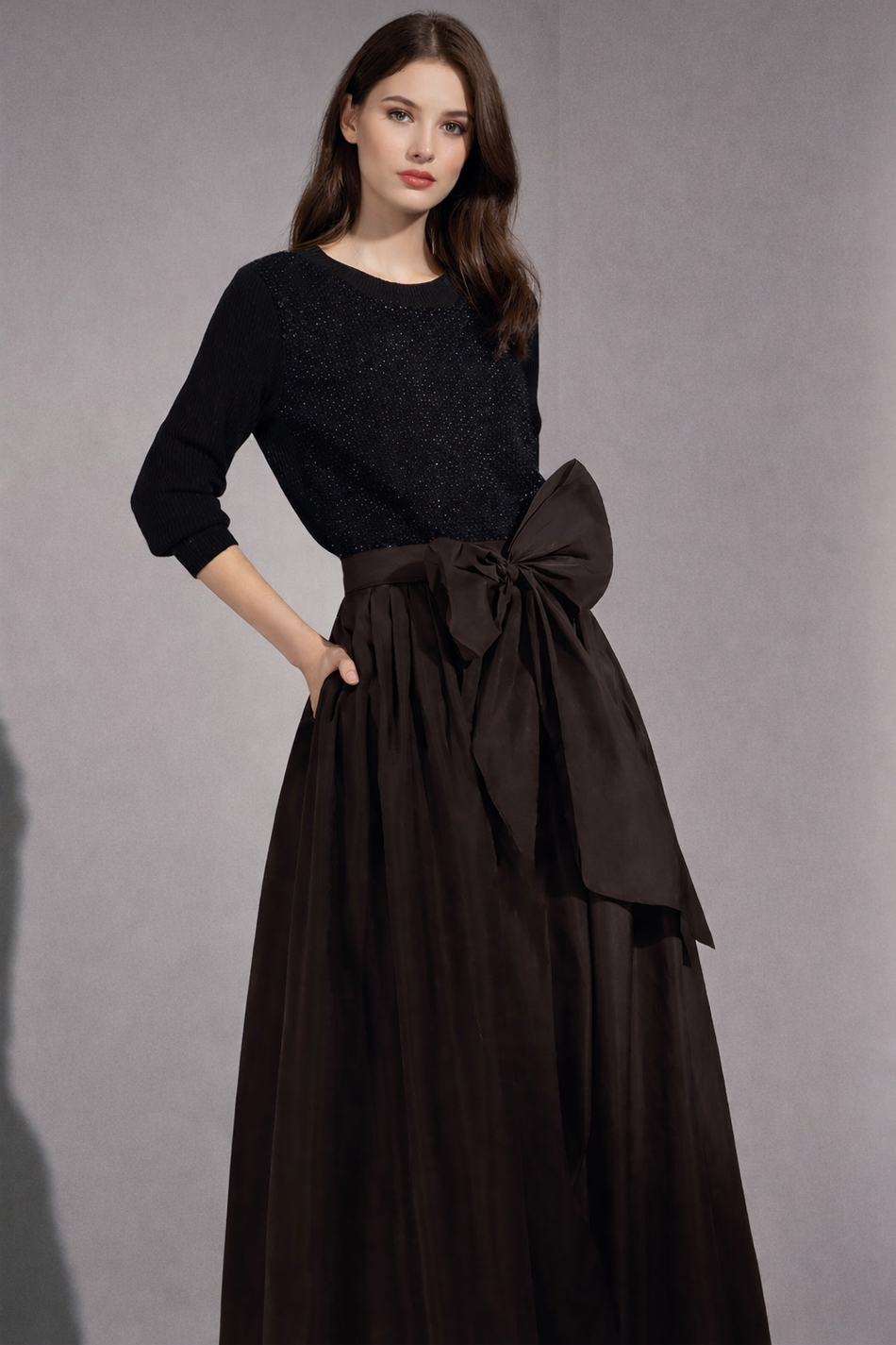 Piękna, długa, wieczorowa spódnica uszyta z tafty w kolorze brązowym. Spódnica rozkloszowana, z mocno marszczona w talii. Dodatkowo do spódnicy pasek do związania w talii na kokardę. Kieszenie w szwach bocznych. Do spódnicy doszyta wiskozowa halka z podszewki, którą można założyć pod spódnicę. Spódnica zapinana z tyłu na zamek kryty. Idealna na wiele okazji, z elegancką bluzką, topem, krótkim żakietem sprawdzi się podczas wszelkich formalnych i wieczorowych spotkań, a z prostym topem, krótką kurtką idealna do codziennych stylizacji. IDEALNA!