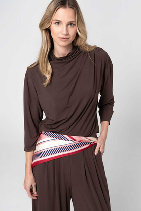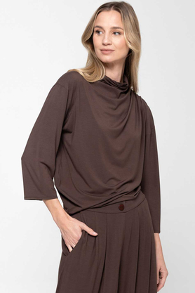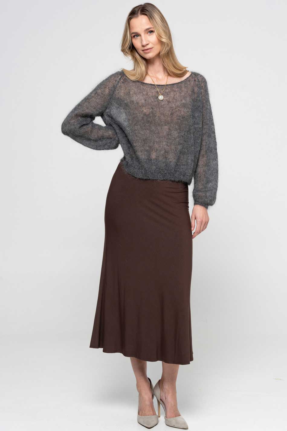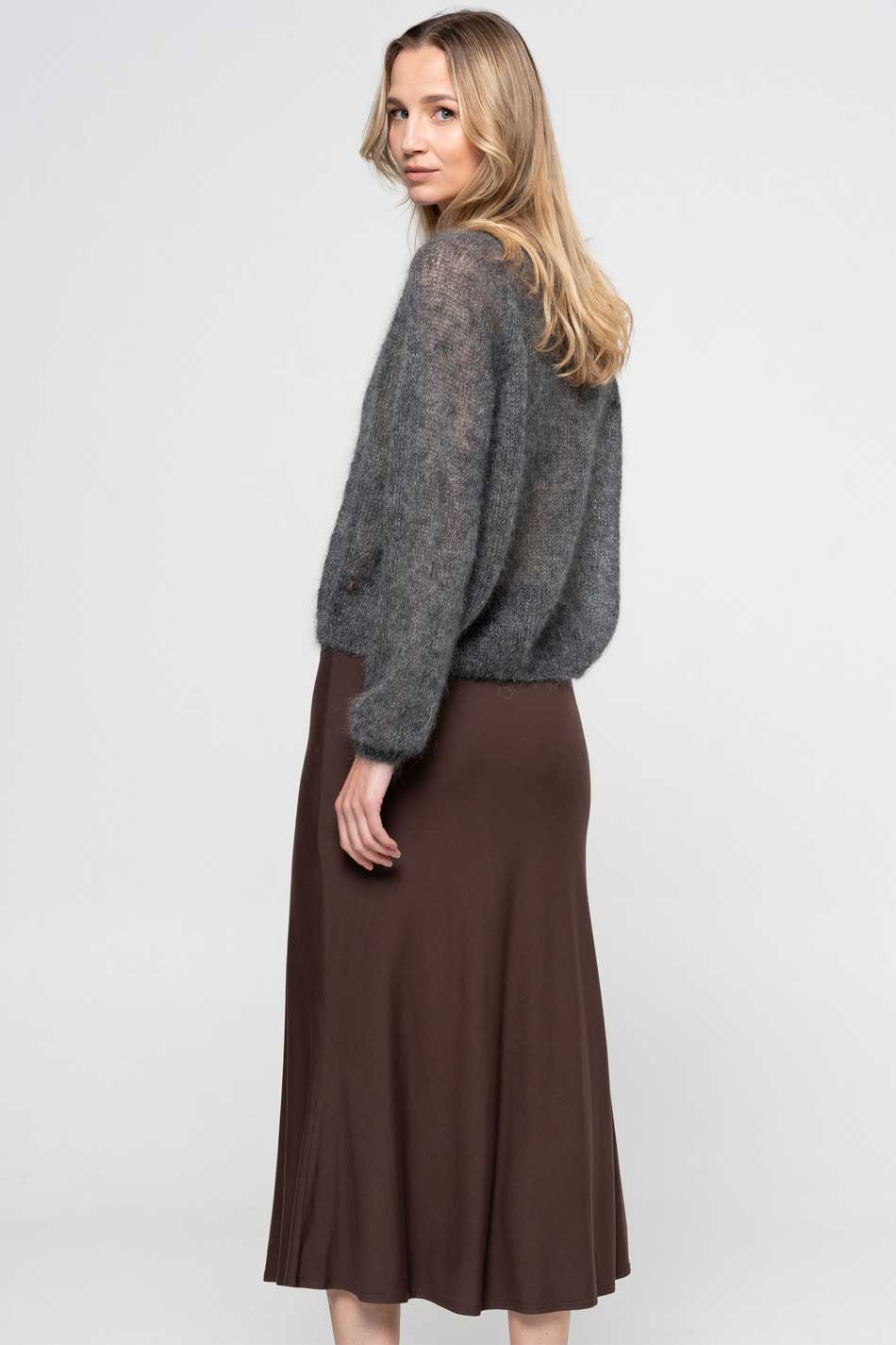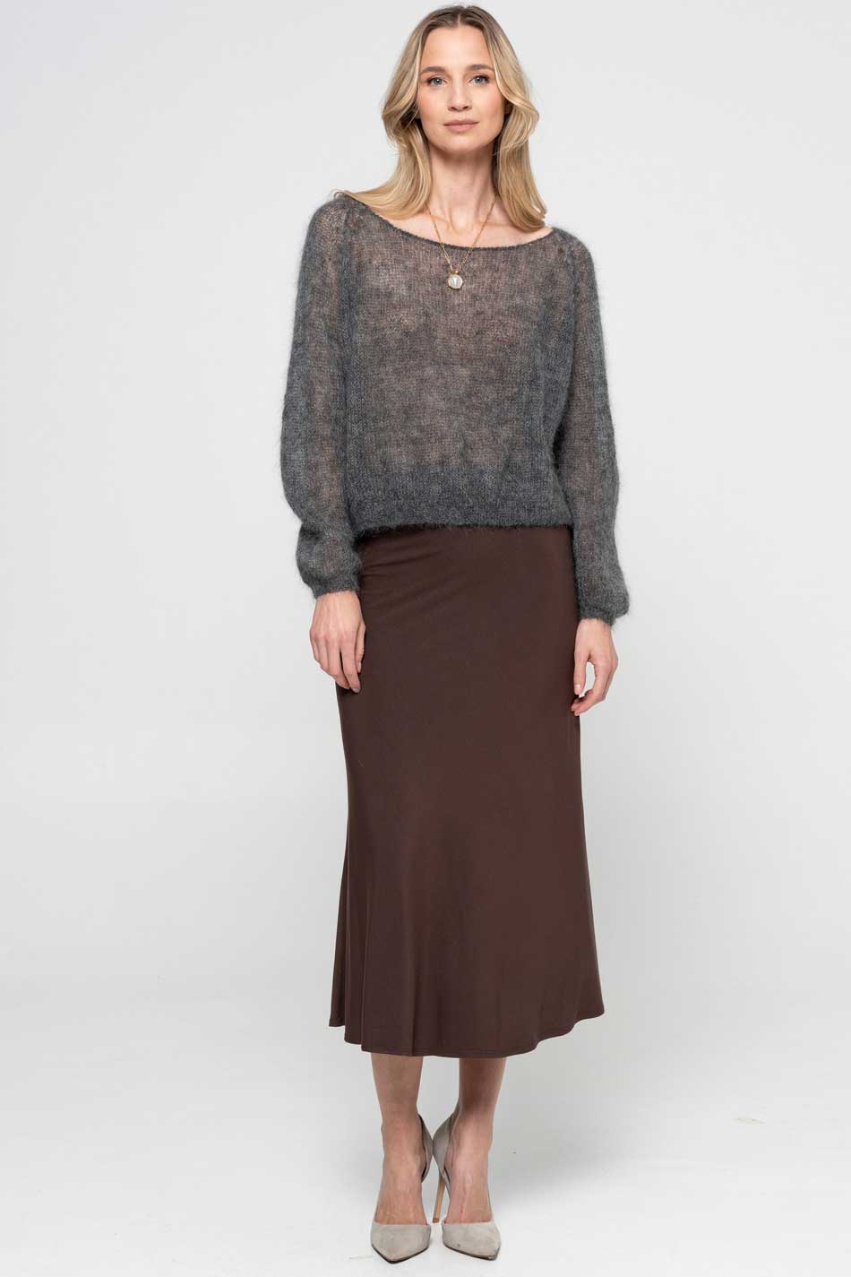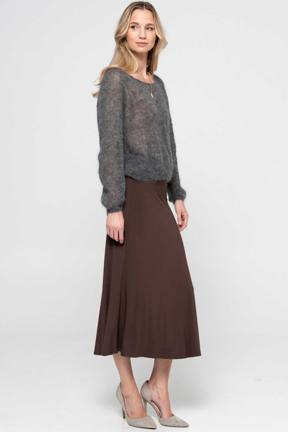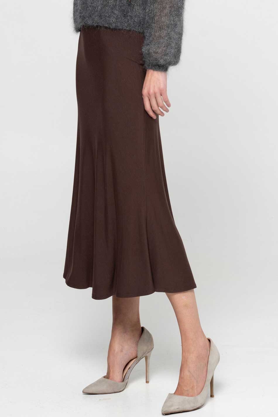 Spódnica dwuwarstwowa za skosu brązowa marki Marita Bobko zachwyca elegancją ukrytą w prostocie i subtelną grą tkaniny. Jej krój - "po skosie", pięknie podkreśli sylwetkę, nadając jej lekkości. Dwuwarstwowa konstrukcja tej spódnicy sprawi, że będzie ona miękko opływała ciało, będzie bardziej kryjąca i bardzo wygodna w noszeniu. Model ten uszyty został z wysokiej jakości, naturalnej, elastycznej, przyjaznej dla skóry, trwałej oraz odpornej na uszkodzenia dzianiny modalowej, która zapewni komfort i swobodę nawet przez cały dzień, nie zmechaci się, nie rozciągnie i zachowa swoją formę także po wielu praniach. Spódnica dwuwarstwowa za skosu brązowa sprawdzi się na wiele okazji - na przykład w połączeniu z oversizową bluzką stworzy stylowy, codzienny look, a zestawiona z delikatnym, jedwabnym swetrem odsłoni kobiecą, elegancką stronę. MISTRZOWSKA!