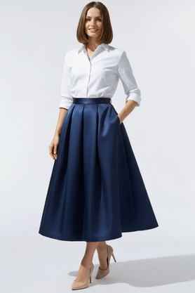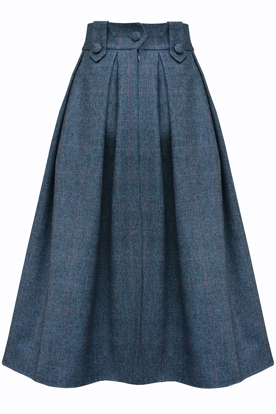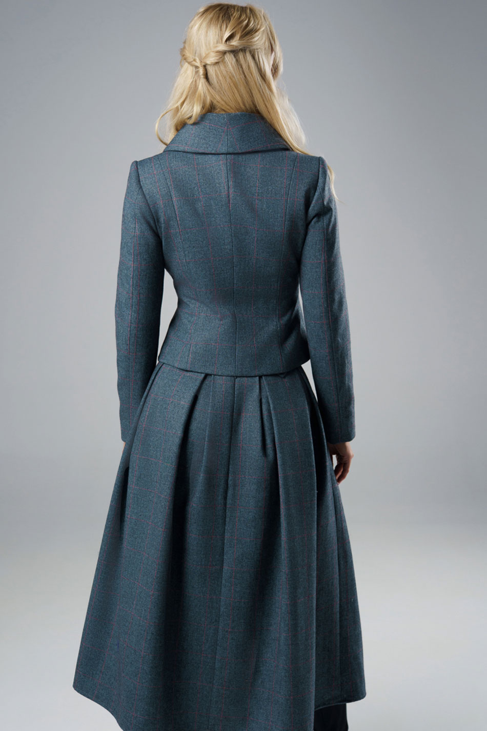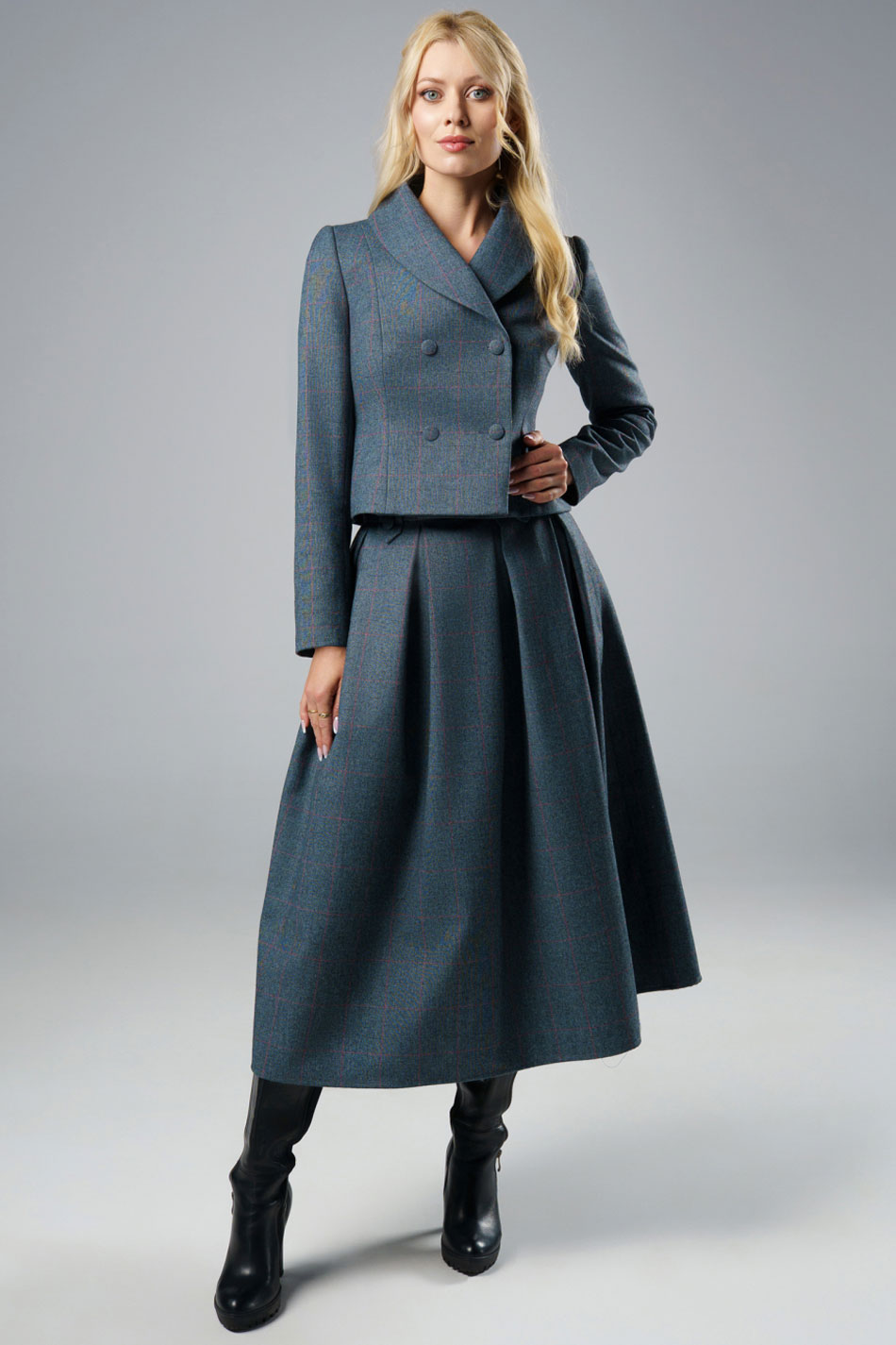 Spódnica Miriam od Kasi Zapały to kwintesencja klasy i ponadczasowej elegancji. Została uszyta z wysokogatunkowej, angielskiej wełny 100% o dużej gramaturze, która pięknie układa się na sylwetce. Tkanina w melanżowym, szaro-niebieskim odcieniu z delikatną czerwoną kratką nadaje jej wyjątkowego charakteru. Model ma trapezowy krój z zakładkami z przodu i z tyłu, wysoką talię oraz kieszenie w szwach bocznych. Ozdobne, oblekane guziki na szlufkach i kryty zamek z tyłu podkreślają dbałość o detale. Wnętrze spódnicy wykończono wiskozową podszewką, co zapewnia wygodę i idealne układanie materiału. Spódnica Miriam to doskonały wybór dla kobiet ceniących wyrafinowany, kobiecy styl. Świetnie sprawdzi się zarówno w eleganckich zestawieniach z koszulą i szpilkami, jak i w bardziej casualowej wersji – z dopasowanym swetrem i botkami. 100% WEŁNY!