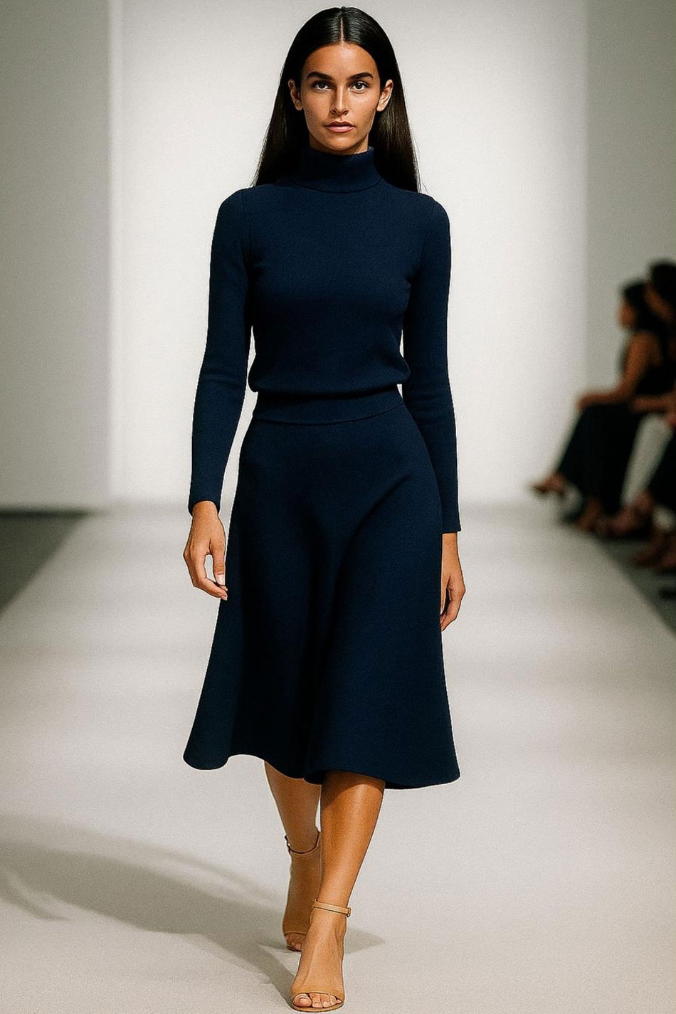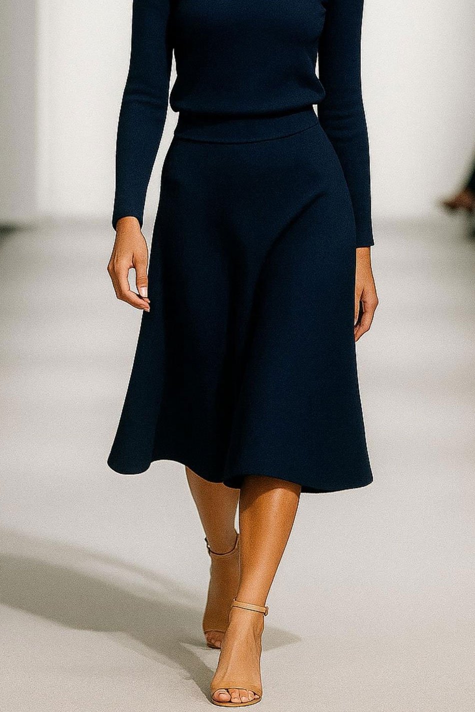 Spódnica trapezowa midi granatowa to połączenie elegancji i nowoczesnej prostoty w wydaniu, które nigdy nie wyjdzie z mody. Model ten ma subtelnie rozszerzany krój, który pięknie ułoży się na sylwetce, podkreślając talię i delikatnie otulając biodra. Uszyta z naturalnej, przewiewnej dzianiny o przyjemnej w dotyku strukturze, spódnica trapezowa midi granatowa zapewni komfort noszenia nawet przez cały dzień. Szeroki pasek w talii nadaje tej spódnicy wyrazistego charakteru, a głęboki, granatowy odcień sprawia, że świetnie skomponuje się ona zarówno z białą koszulą, jak i jasnym topem czy dopasowanym golfem. Model ten z łatwością odnajdzie się w codziennych stylizacjach, ale też zyska elegancki charakter w połączeniu z żakietem i szpilkami. NOWOCZESNA KLASYKA!