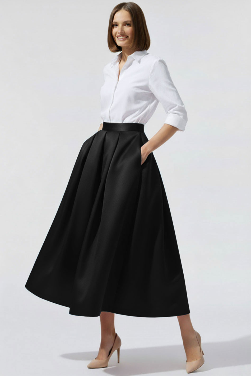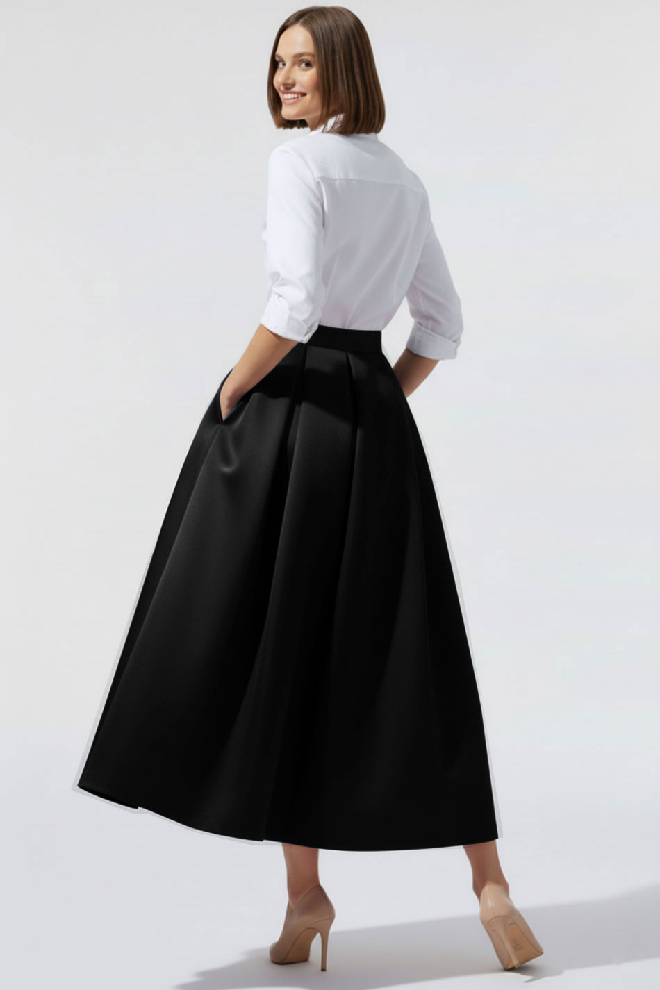 Zachwycająca spódnica midi wykonana z satynowej tkaniny o subtelnym, perłowym połysku w czarnym kolorze. Dzięki efektownym zakładkom z przodu i z tyłu, spódnica zyskuje piękną objętość i niepowtarzalny charakter. Komfort noszenia podnoszą praktyczne kieszenie ukryte w bocznych szwach. Model zapinany jest z tyłu na kryty zamek i wykończony podszewką, co zapewnia elegancki wygląd oraz wygodę. Ta spódnica to doskonała propozycja na różne okazje. W połączeniu z elegancką koszulą, szykownym topem czy krótkim żakietem będzie idealnym wyborem na formalne spotkania, bankiety czy wieczorne wyjścia. Natomiast zestawiona z prostym t-shirtem, krótką kurtką czy skórzaną ramoneską świetnie sprawdzi się w codziennych stylizacjach. Jej uniwersalny fason i intensywny kolor sprawiają, że każda stylizacja nabiera wyjątkowego blasku. Ta spódnica to prawdziwy must-have w garderobie każdej miłośniczki wyrazistych kolorów i kobiecych fasonów. Niezależnie od okazji – zawsze prezentuje się stylowo i robi wrażenie. PIĘKNA!