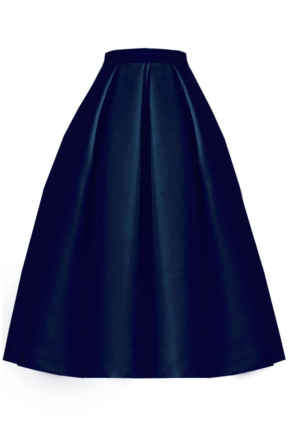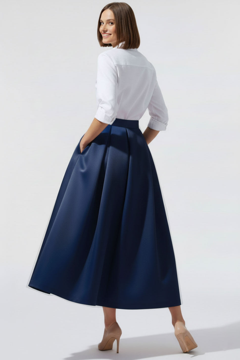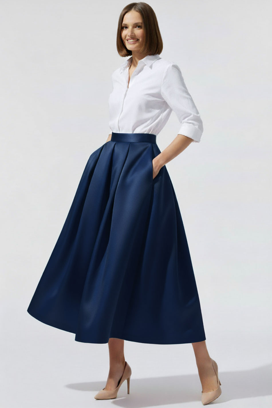Zachwycająca spódnica midi wykonana z satynowej tkaniny o subtelnym, perłowym połysku w granatowym kolorze. Dzięki efektownym zakładkom z przodu i z tyłu, spódnica zyskuje piękną objętość i niepowtarzalny charakter. Komfort noszenia podnoszą praktyczne kieszenie ukryte w bocznych szwach. Model zapinany jest z tyłu na kryty zamek i w całości wykończony podszewką, co zapewnia elegancki wygląd oraz wygodę. Ta spódnica to doskonała propozycja na różne okazje. W połączeniu z elegancką koszulą, szykownym topem czy krótkim żakietem będzie idealnym wyborem na formalne spotkania, bankiety czy wieczorne wyjścia. Natomiast zestawiona z prostym t-shirtem, krótką kurtką czy skórzaną ramoneską świetnie sprawdzi się w codziennych stylizacjach. Jej uniwersalny fason i intensywny kolor sprawiają, że każda stylizacja nabiera wyjątkowego blasku. Ta spódnica to prawdziwy must-have w garderobie każdej miłośniczki wyrazistych kolorów i kobiecych fasonów. Niezależnie od okazji – zawsze prezentuje się stylowo i robi wrażenie. PIĘKNA!