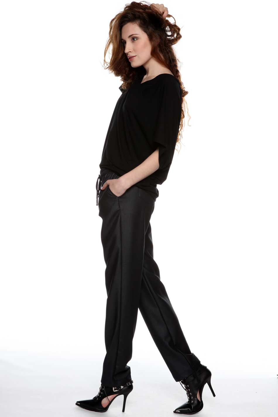 Uszyte z rewelacyjnej, nie gniecącej się tkaniny, spodnie w ciemno granatowym odcieniu z lekkim połyskiem, które założysz absolutnie do wszystkiego! Nie ważne czy jesteś fanką elegankich czy sportowych stylizacji - doskonale będą prezentowły się w towarzystkie koszuli oraz szpilek, a także tenisówek i luźnego t-shirtu. Gumka w pasie z wciągniętym dodatkowo sznurkiem, gwarantuje komfort noszenia plus regulację objętości. Charakteru spodnią dodają lekko zwężane ku dołowi nogawki, dwie kieszonki zarówno z przodu jak i z tyłu, a także atrapa rozporka. PIĘKNE, UNIWERSALNE I WYGODNE!