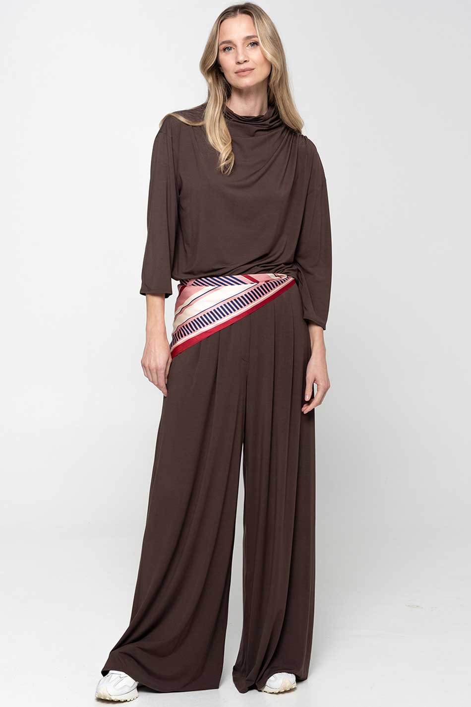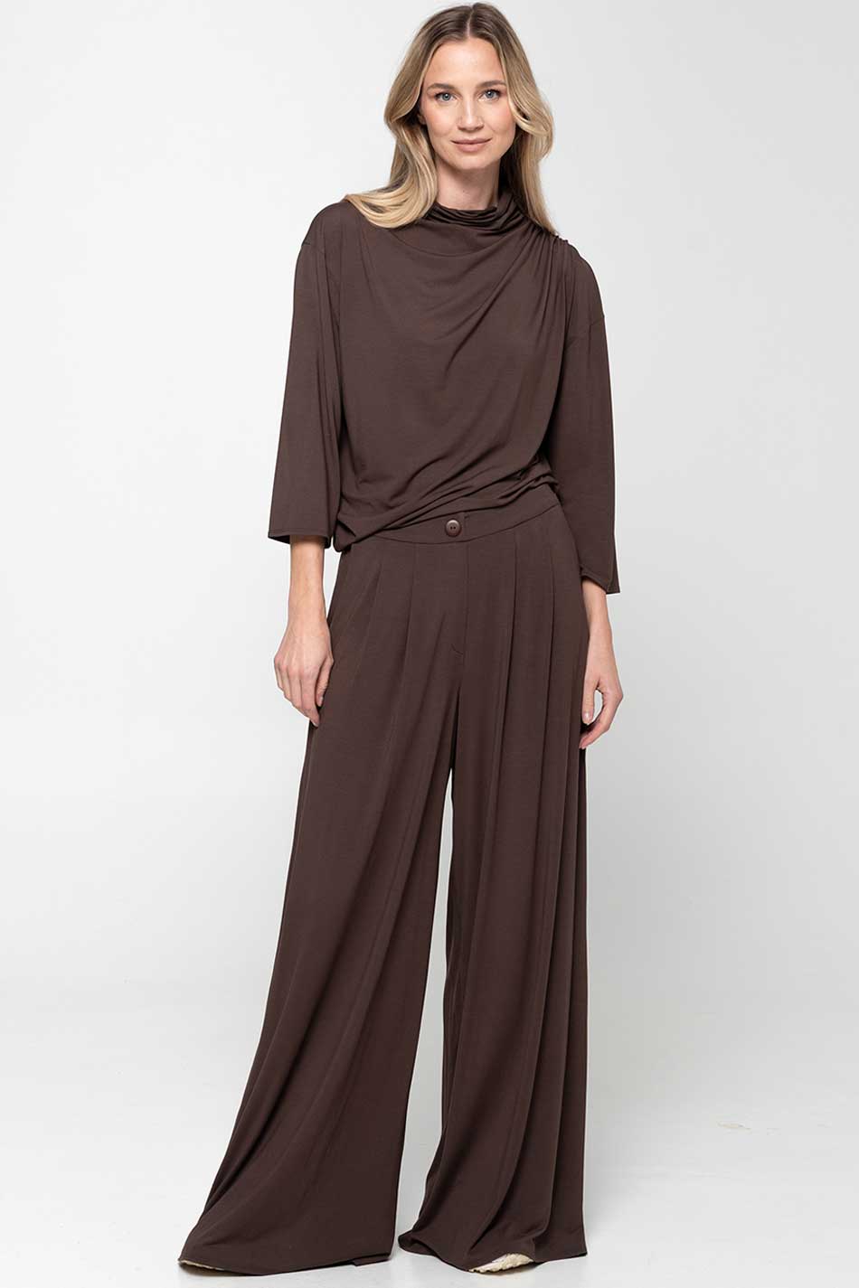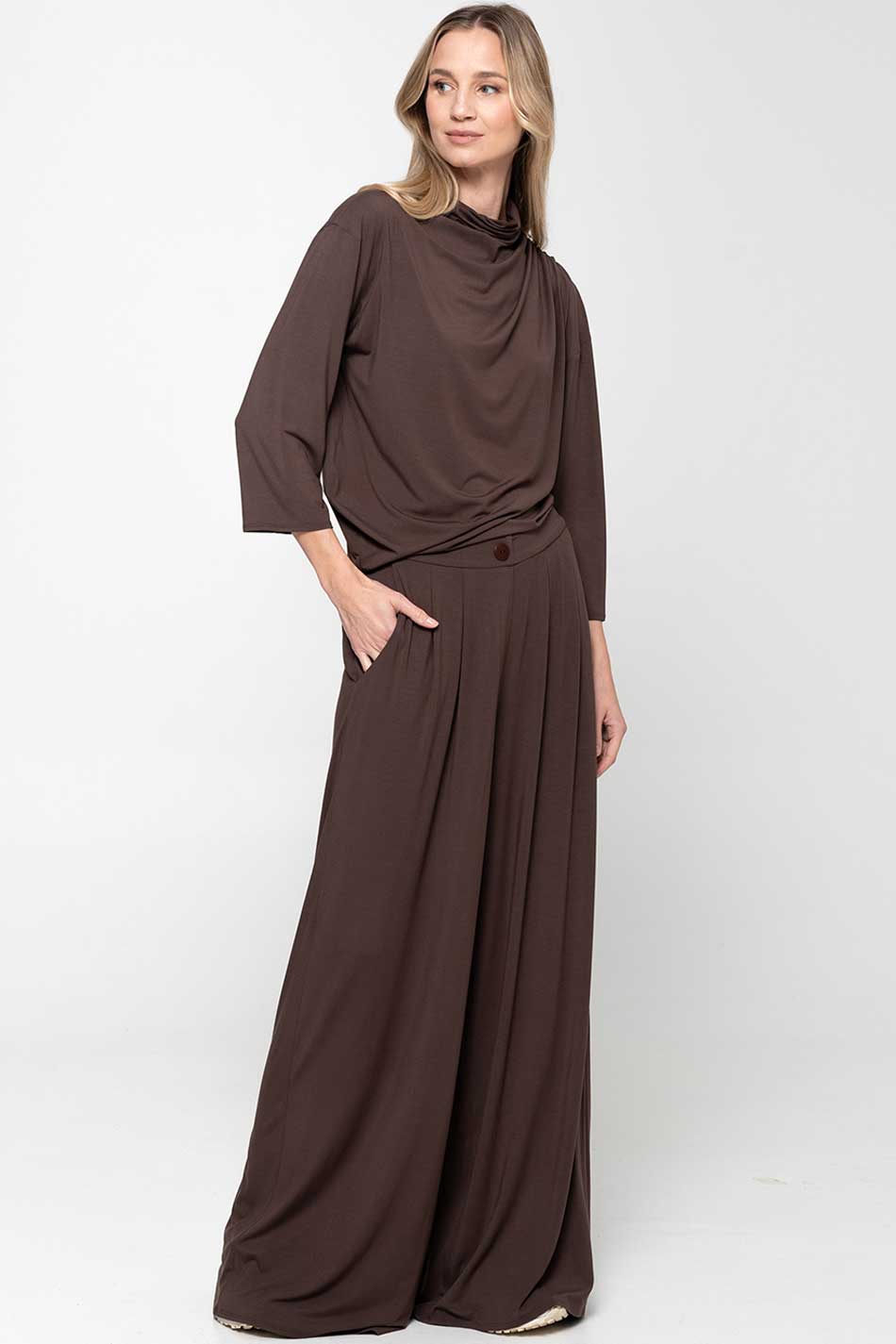 Spodnie szerokie modalowe brązowe to połączenie elegancji, wygody i nowoczesnego minimalizmu. Spodnie te wykonane zostały z wysokiej jakości dzianiny modalowej i zachwycają miękkością i naturalnym, przyjemnym w dotyku wykończeniem. Tkanina ta jest wyjątkowo trwała, odporna na mechacenie i odkształcanie, dzięki czemu spodnie szerokie modalowe brązowe zachowają swój nienaganny wygląd nawet po wielu praniach. Elastyczna guma w pasie tych spodni dopasuje się do sylwetki, zapewniając pełen komfort noszenia i swobodę ruchów, a ich szerokie nogawki nadadzą lekkości i elegancji każdej stylizacji. Fason ten doskonale sprawdzi się zarówno w stylizacjach codziennych, jak i bardziej wyrafinowanych. Spodnie szerokie modalowe brązowe to model, który podkreśli luz i styl, pozostając przy tym niezwykle wygodny, ponadczasowy i uniwersalny, bo będzie doskonale leżał na różnych typach sylwetki. IDEALNE!