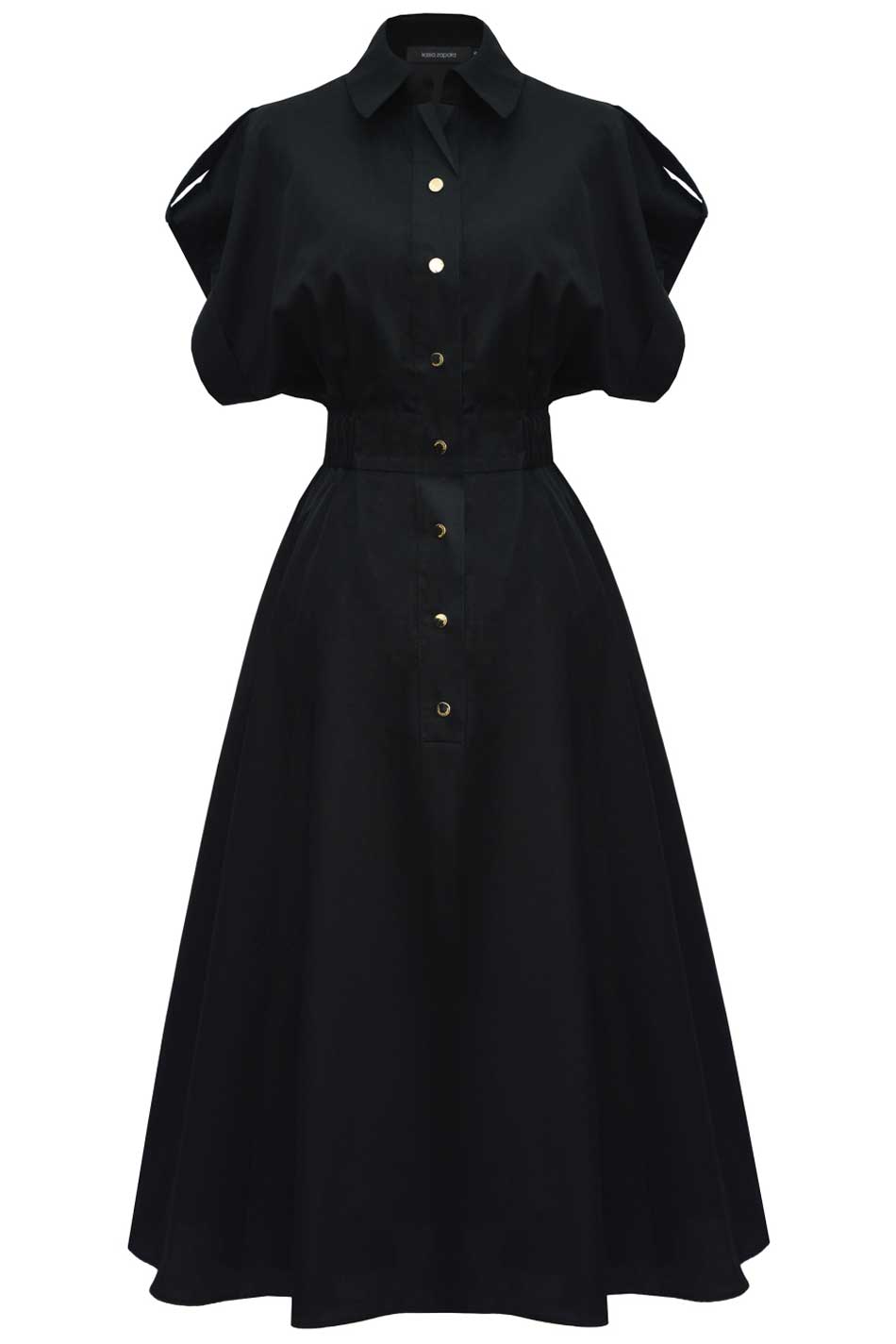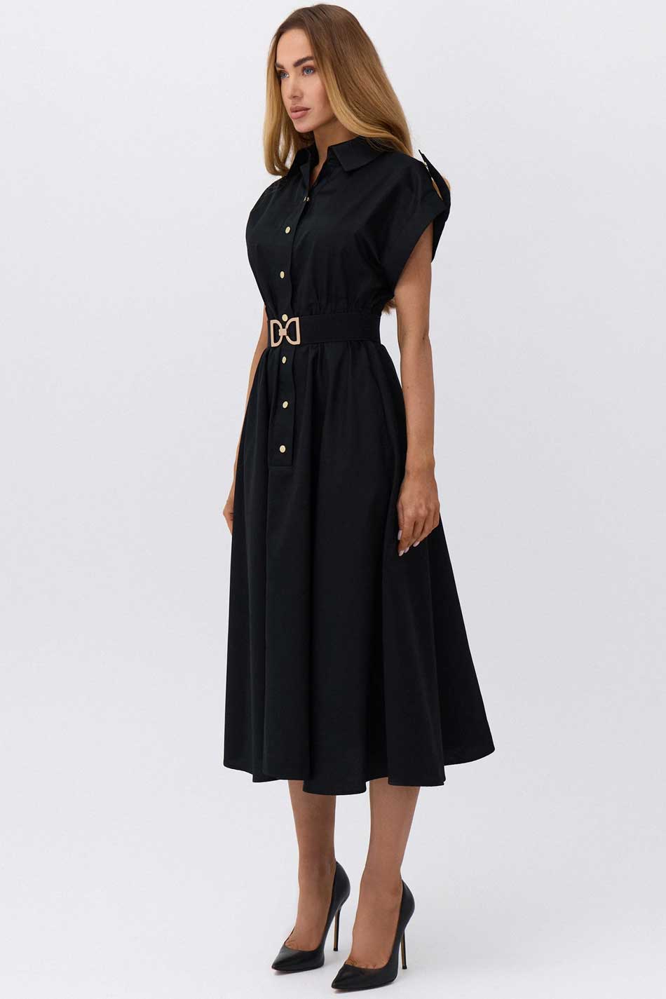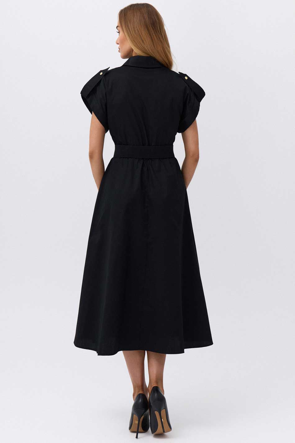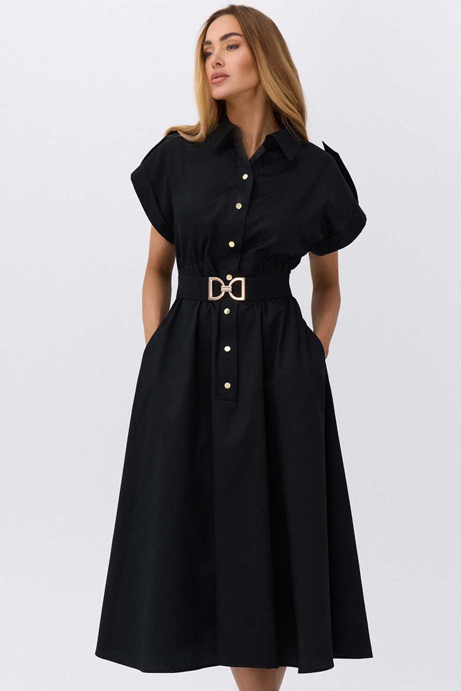 Sukienka Delfina czarna to elegancka szmizjerka w nowoczesnym wydaniu, która łączy wygodę z dopracowanymi detalami. Sukienka ta wykonana została w 100% z bawełny, dzięki czemu zapewnia komfort noszenia, przewiewność i naturalne dopasowanie do sylwetki. Klasyczny kołnierzyk nadaje jej ponadczasowego charakteru, a krótkie rękawy, z patkami, ozdobionymi złotymi, logowanymi napami, wprowadzają subtelny, biżuteryjny akcent. Model ten zapinany jest na złote metalowe napy, które stanowią spójny element dekoracyjny. W talii tej kreacji zastosowano elastyczną gumę, dzięki czemu sukienka Delfina czarna pięknie podkreśli proporcje sylwetki i dopasuje się do ciała. Dodatkowymi atutami tego projektu są: praktyczne kieszenie oraz uniwersalna długość midi, które sprawiają, że sukienka Delfina czarna doskonale sprawdzi się zarówno w stylizacjach codziennych, jak i w bardziej eleganckich. SUPER!