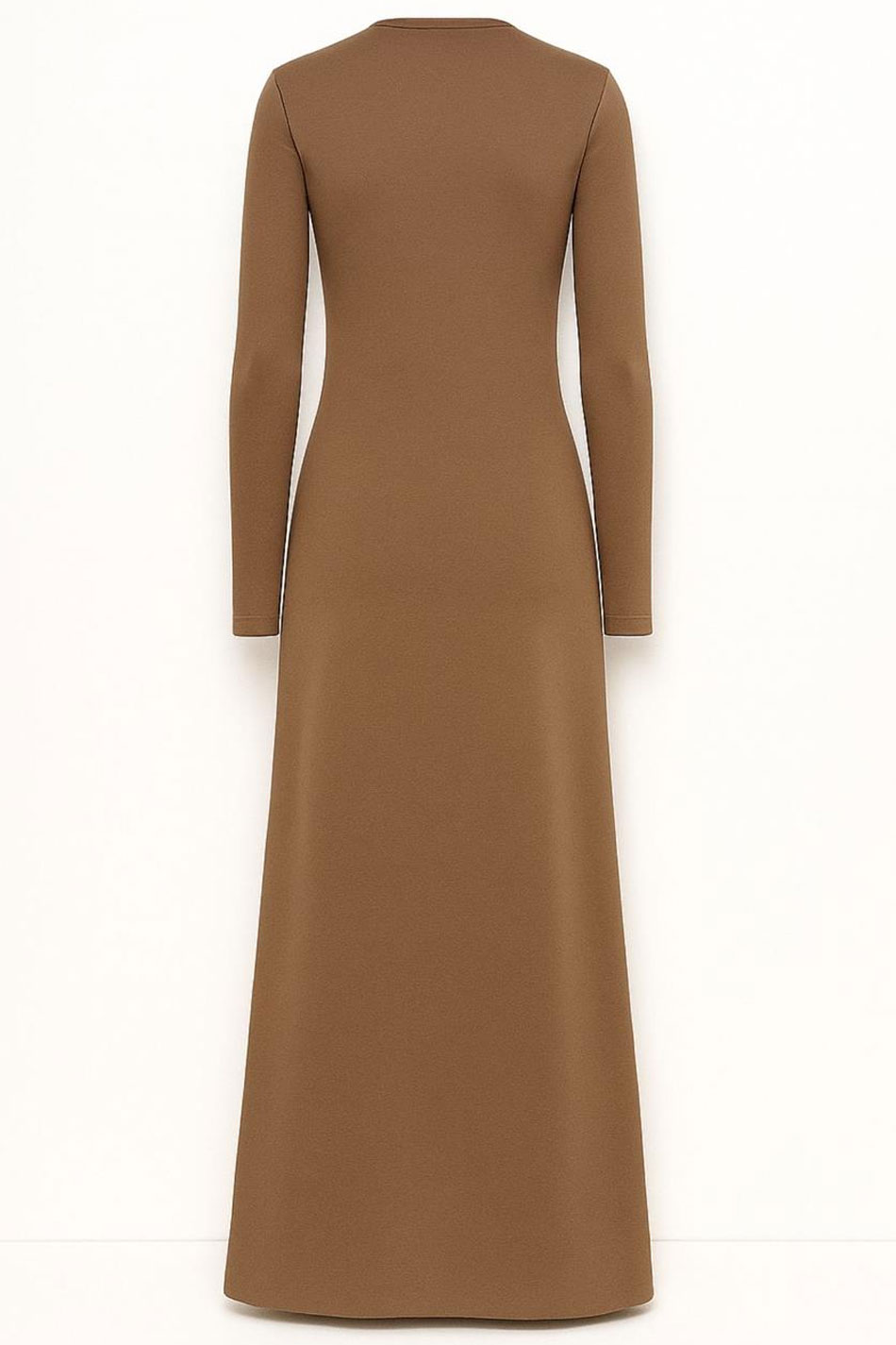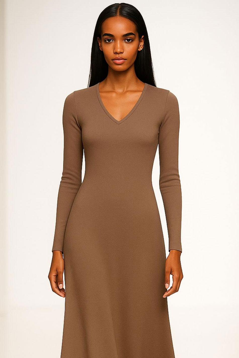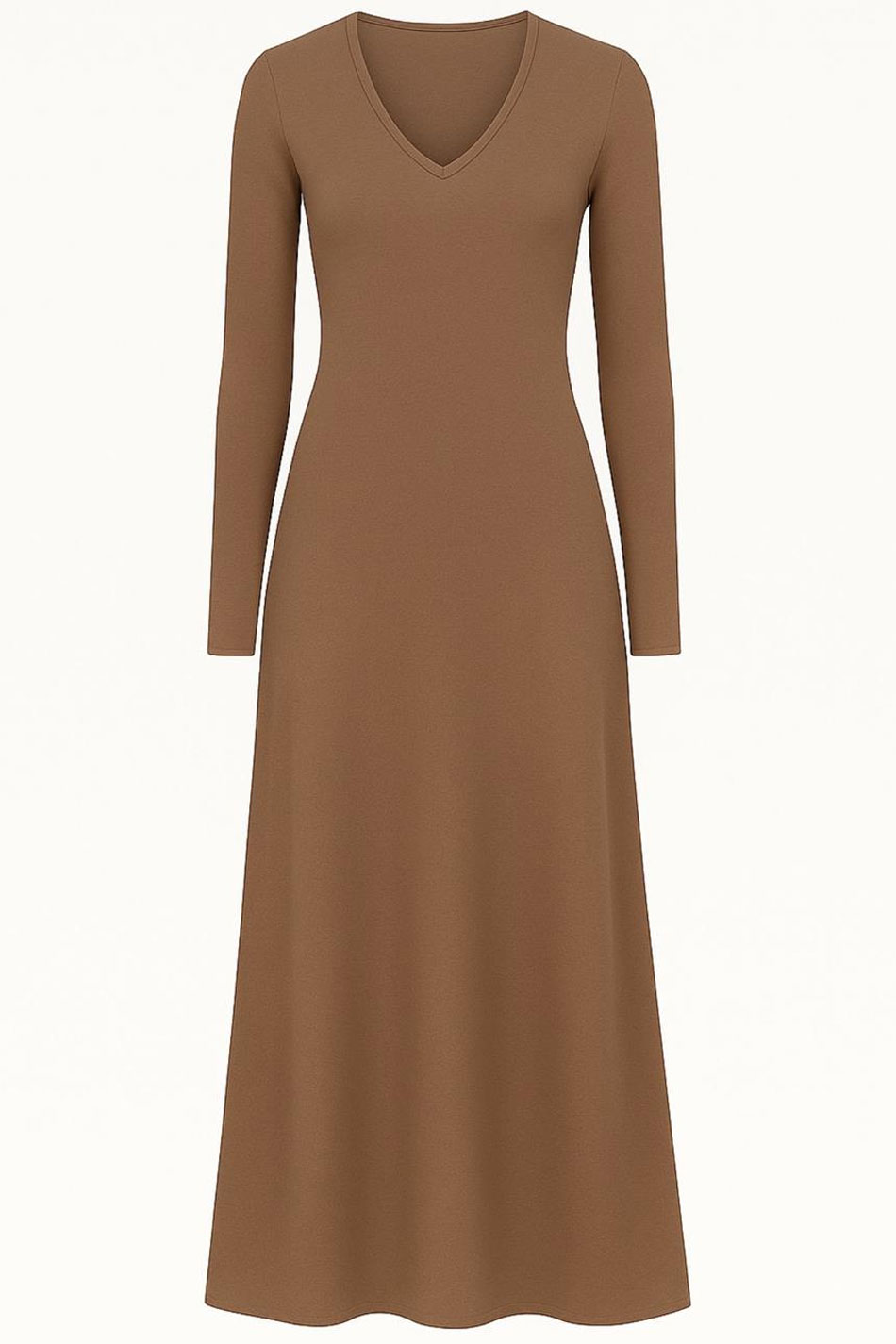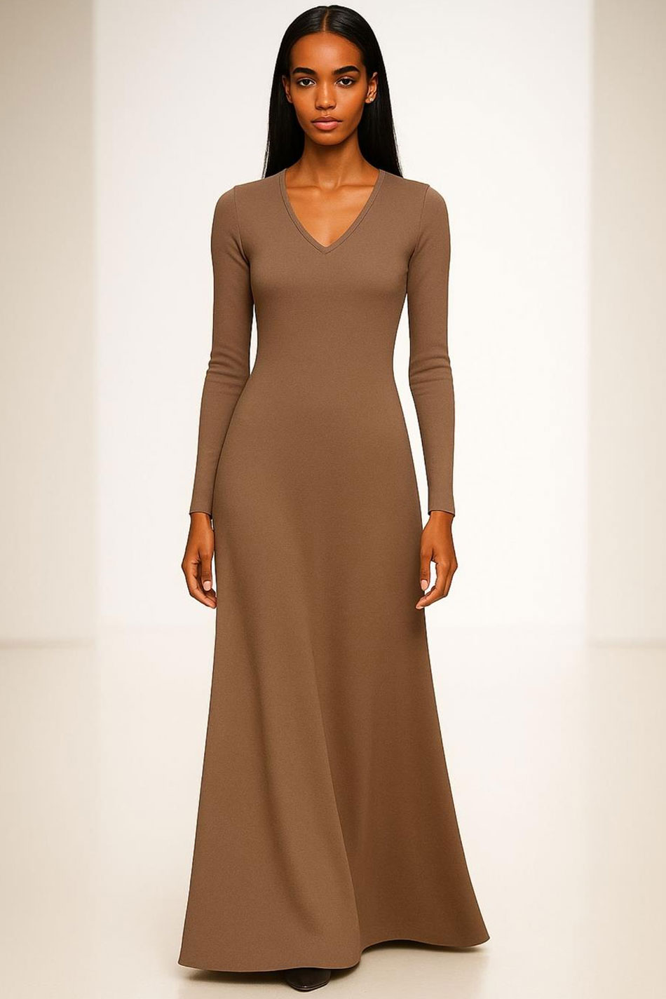 Sukienka długa dekolt serek długi rękaw cappuccino zachwyca ciepłym, harmonijnym odcieniem i doskonałym krojem. Subtelnie dopasowana w talii i biodrach i delikatnie poszerzana ku dołowi, kreacja ta pięknie podkreśli proporcje sylwetki. Dekolt w serek tej sukienki doda każdej stylizacji kobiecego wdzięku, a jej długie rękawy, szlachetnej prostoty. Wysokiej jakości, miękka, naturalna dzianina o średniej grubości, z której uszyty został ten model, zagwarantuje komfort noszenia tej sukienki i doskonałe jej dopasowanie. Sukienka długa dekolt serek długi rękaw cappuccino to model idealny do stworzenia klasycznej, stonowanej stylizacji z nutą nowoczesności. WYJĄTKOWE PIĘKNO NA WYJĄTKOWE DNI!