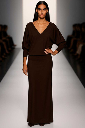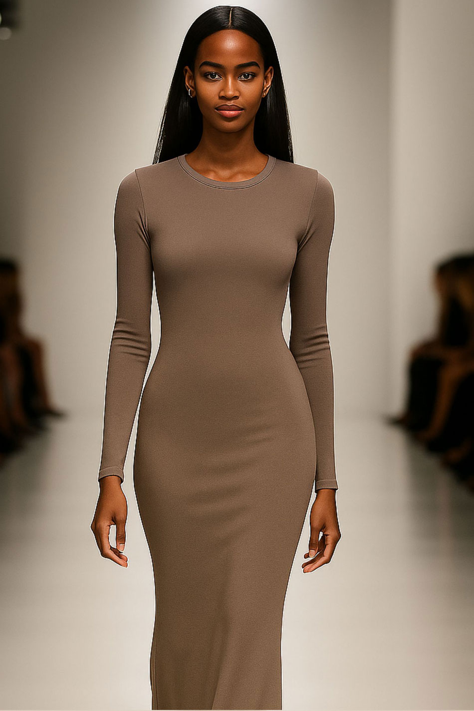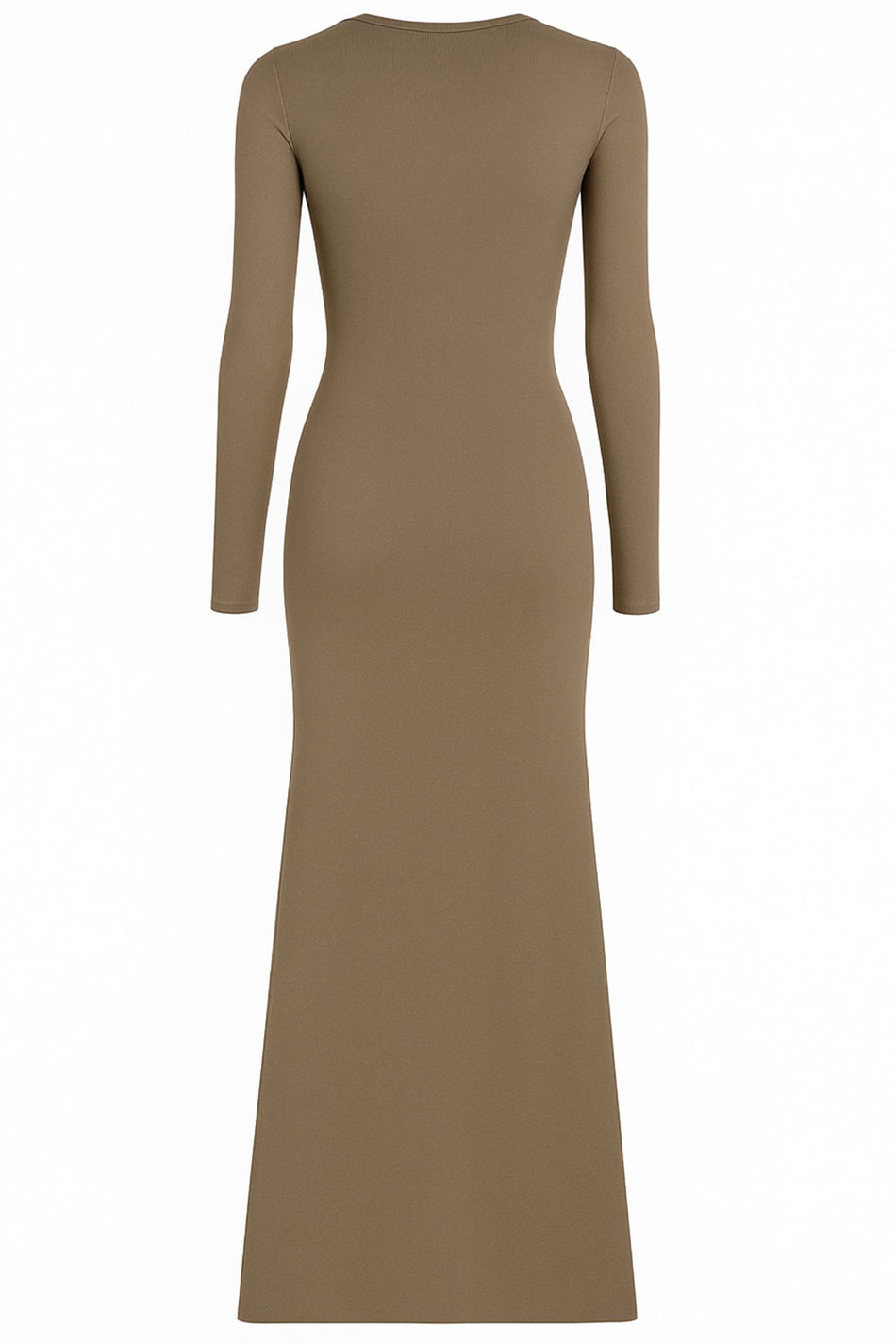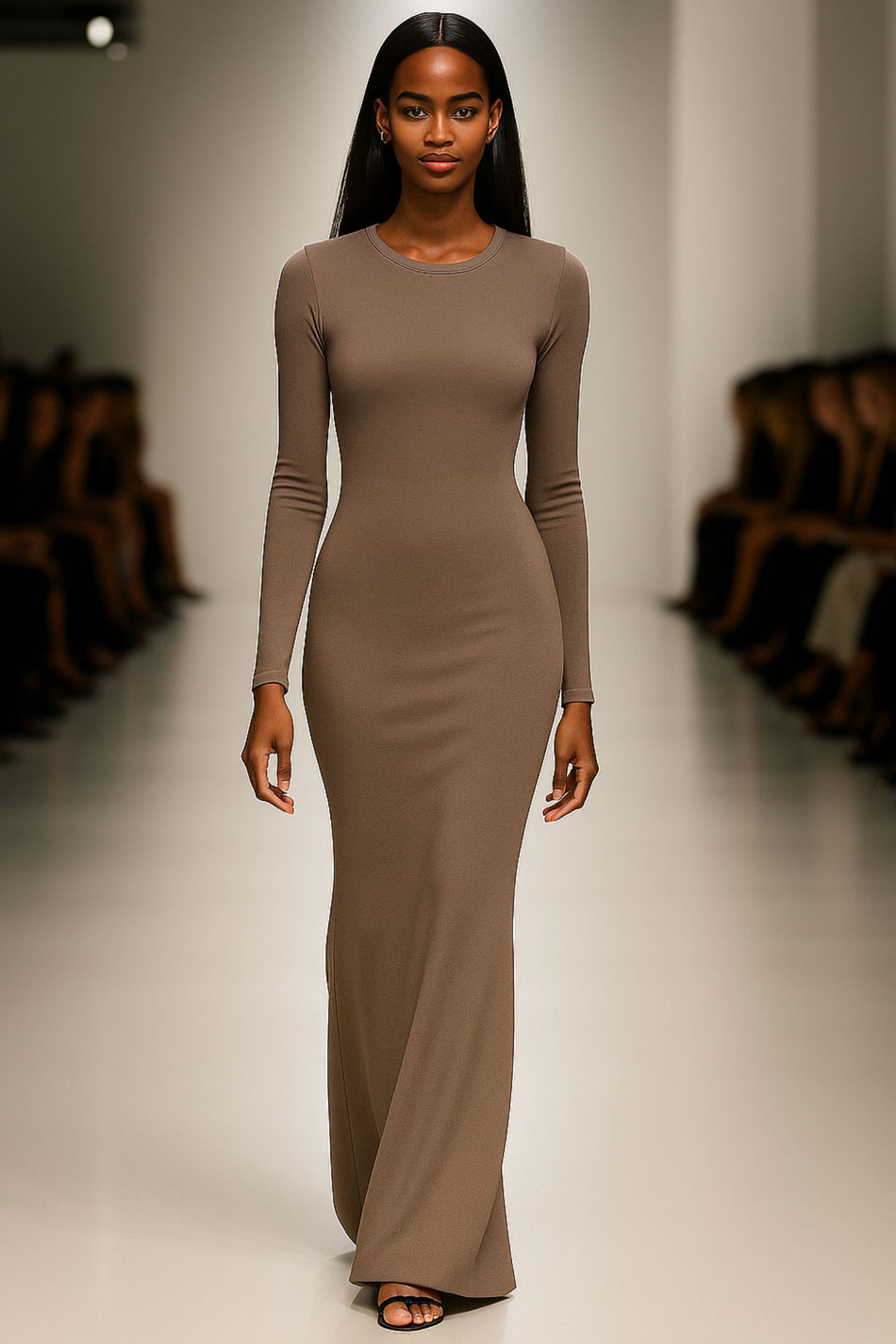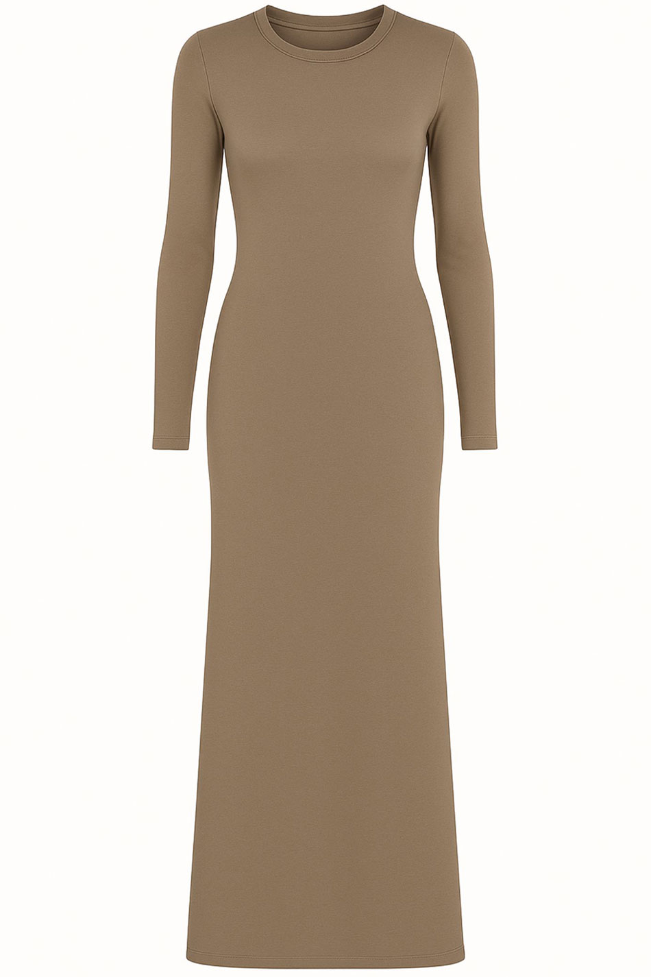 Sukienka długa okrągły dekolt długi rękaw cappuccino to połączenie naturalnego ciepła barwy z wyszukaną prostotą formy. Subtelny odcień cappuccino tej kreacji doskonale komponuje się z jej dopasowanym krojem, który podkreśla linię bioder i talii. Miękka, przyjemna w dotyku dzianina naturalnego pochodzenia, z której uszyta została ta sukienka, gwarantuje komfort jej użytkowania i zapewni elegancki wygląd w każdej sytuacji. Długie rękawy i okrągły dekolt tego modelu tworzą klasyczną całość, a prosty dół dodaje tej sukience uniwersalnego charakteru. Sukienka długa okrągły dekolt długi rękaw cappuccino to synonim wygody i ponadczasowego stylu i doskonale sprawdzi się ona w stylizacjach na wyjątkowe okazje. SYNONIM PONADCZASOWEGO STYLU!