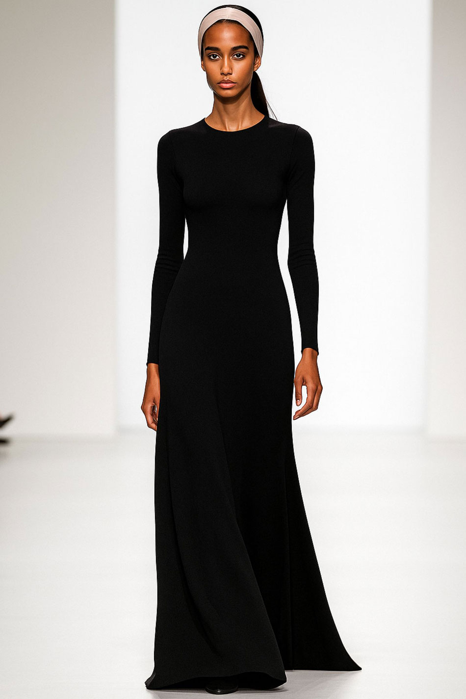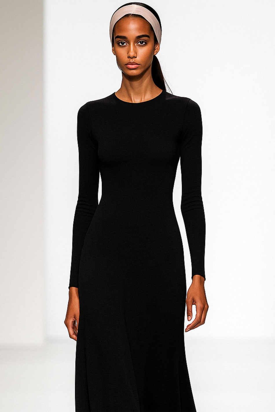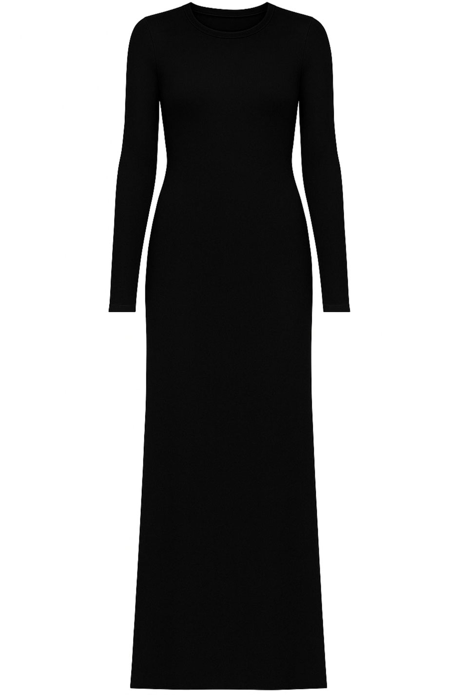 Sukienka długa okrągły dekolt długi rękaw czarna to klasyka, która nigdy nie wychodzi z mody. Czysta forma i dopracowane detale tego modelu czynią z niego podstawę eleganckiej garderoby. Naturalna dzianina o średniej grubości, z której uszyta została ta sukienka, przyjemnie otuli ciało i zapewni pełen komfort noszenia. Dopasowany krój tej kreacji, z delikatnie poszerzanym dołem, podkreśli sylwetkę, a długie rękawy i okrągły dekolt dodadzą stylizacjom harmonii i szyku. Sukienka długa okrągły dekolt długi rękaw czarna idealnie sprawdzi się na wieczorne spotkania, formalne wydarzenia czy wyjątkowe okazje. PEWNOŚĆ STYLU!