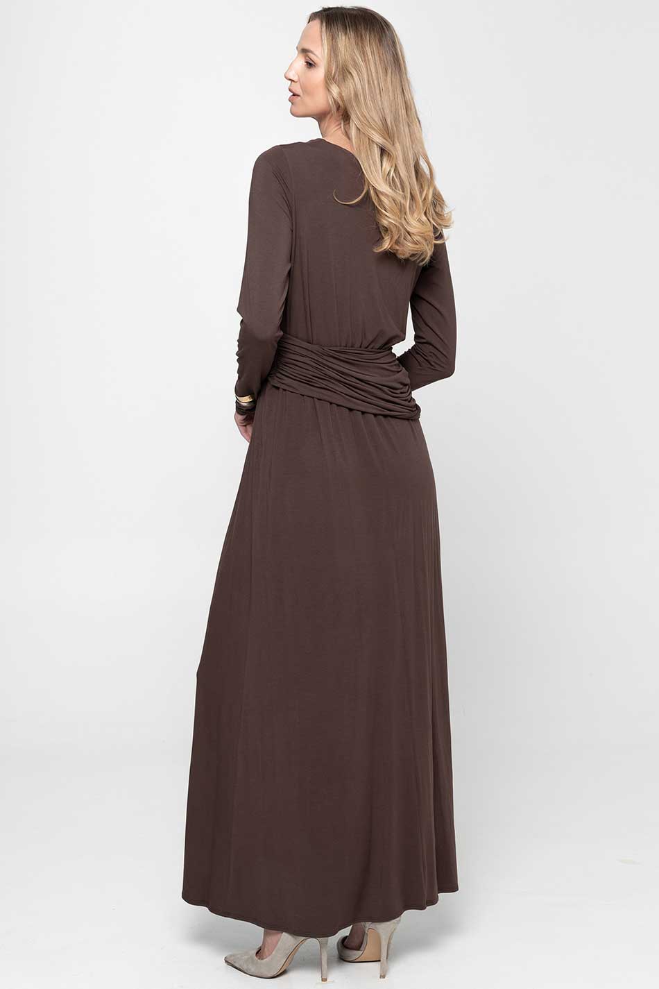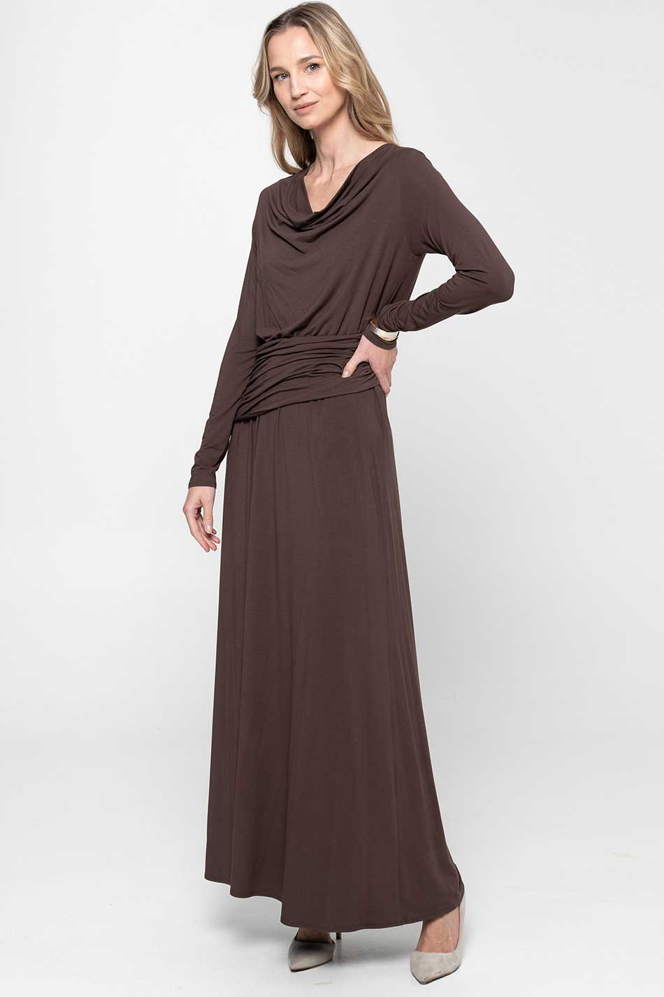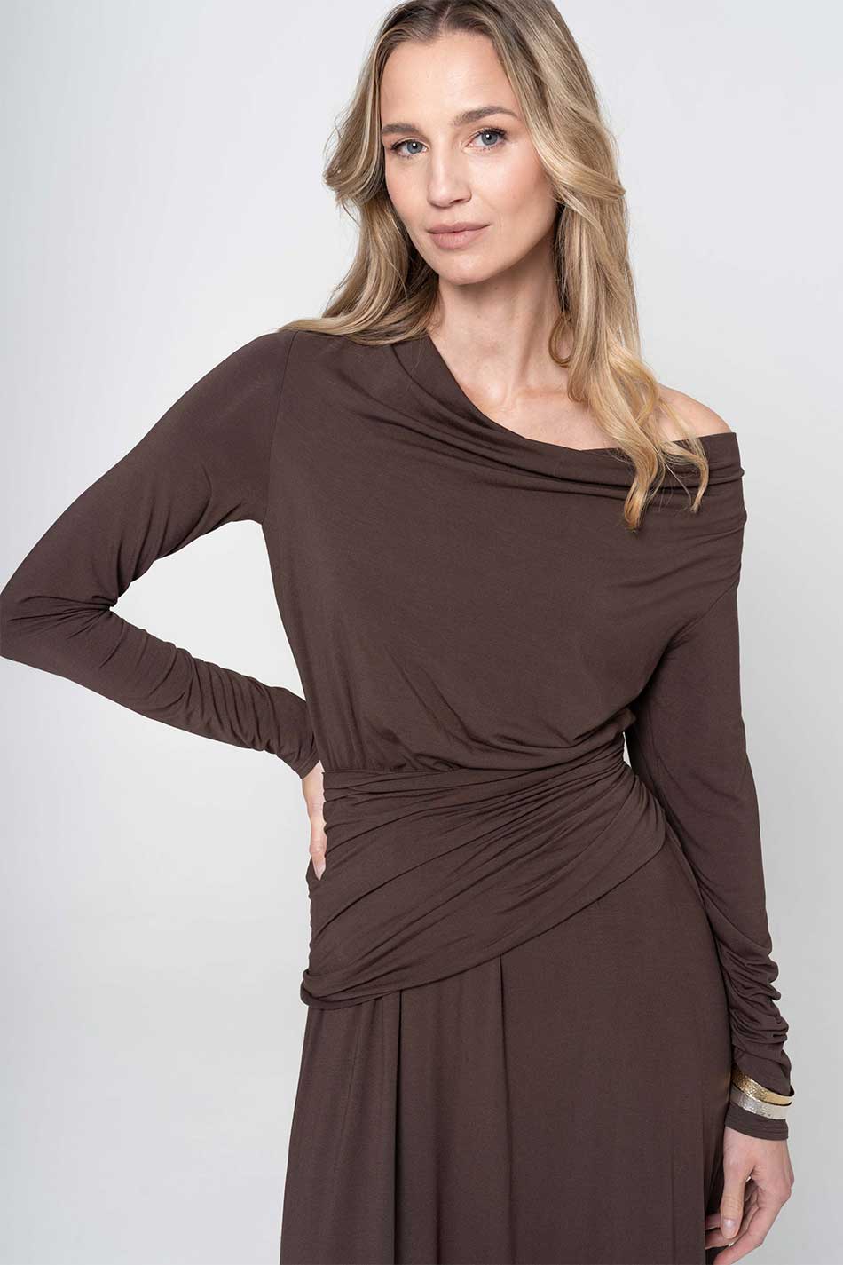 Sukienka drapowana brązowa to wyjątkowa propozycja, która połączy w sobie elegancję, kobiecość i wygodę w najlepszym wydaniu. Jej dopracowany krój subtelnie podkreśli talię dzięki delikatnemu drapowaniu, które ułoży się miękko na sylwetce, tworząc harmonijną linię. Dekolt w kształcie łódki doda całości klasycznego wyrazu, a długie, dopasowane rękawy wysmuklą ramiona, wprowadzając nutę wyrafinowania. Góra tej sukienki została wykonana z dwóch warstw dzianiny, dzięki czemu materiał jest bardziej mięsisty i idealnie kryjący, zachowując przy tym lekkość i płynność w ruchu. Spódnica tego modelu, o lekko luźnym fasonie, nie będzie opinać bioder, a ukryta w pasie guma zapewni idealne dopasowanie i wygodę noszenia. Miękka, elastyczna dzianina modalowa, z której powstała sukienka drapowana brązowa, zachwyci swoją naturalnością i trwałością – nie zmechaci się, nie straci kształtu i pozostanie przyjemna w dotyku nawet po wielu założeniach. Sukienka drapowana brązowa doskonale sprawdzi się zarówno w codziennych stylizacjach, jak i podczas wyjątkowych okazji. WYJĄTKOWA!