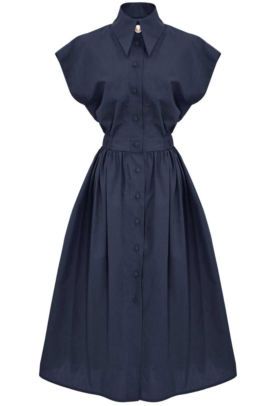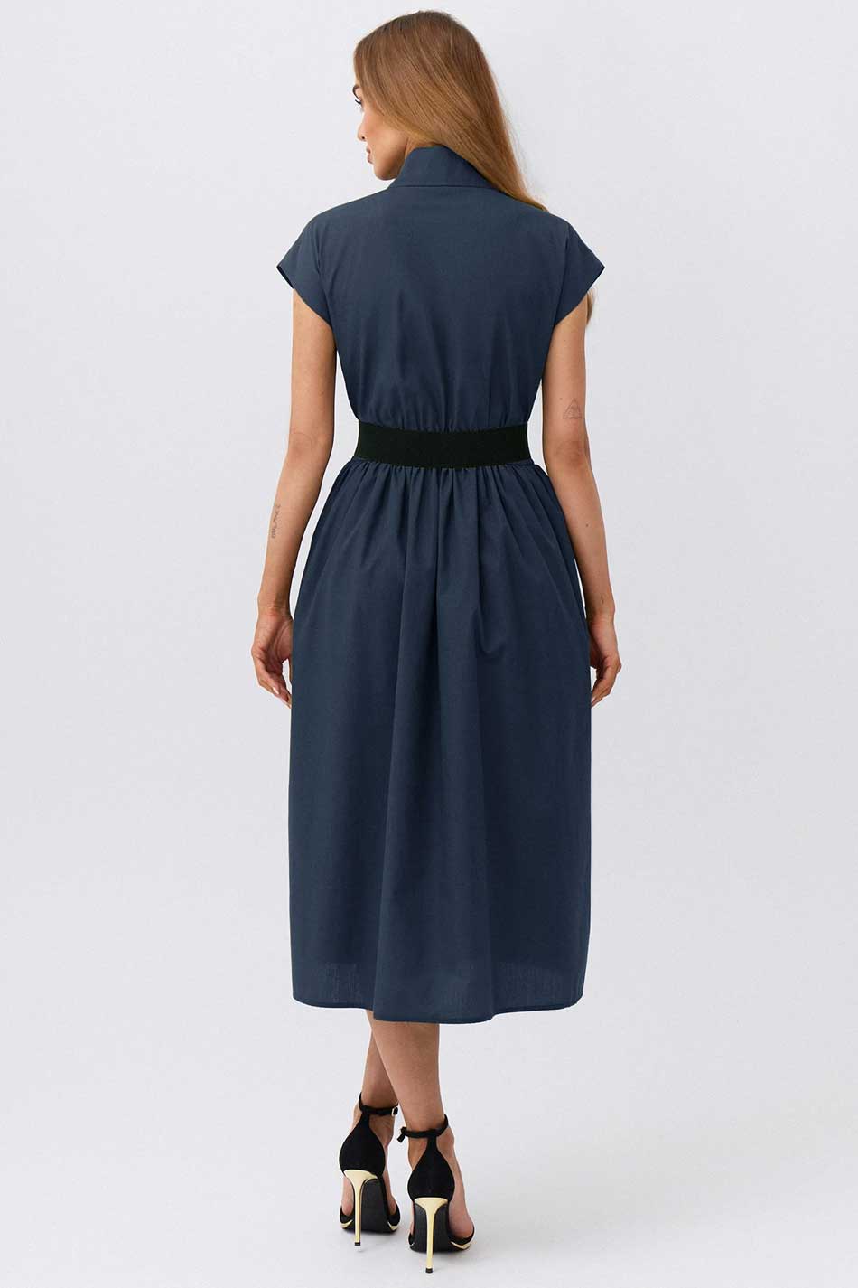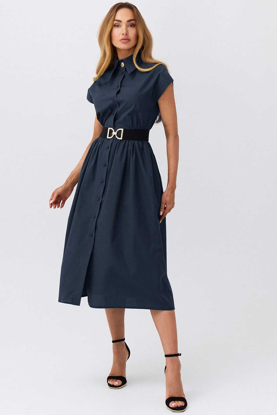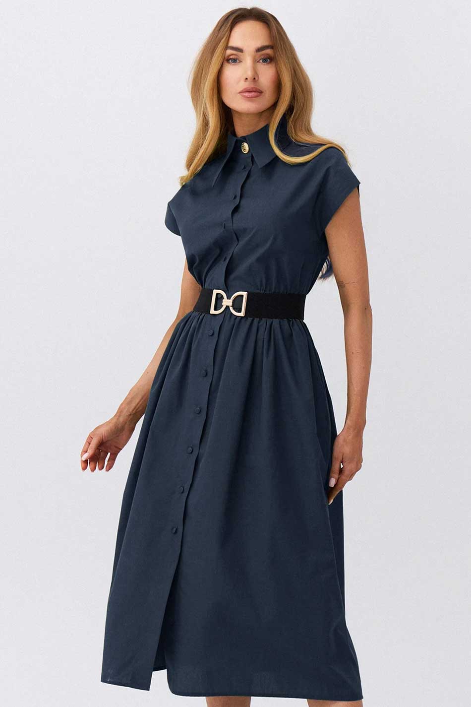 Elegancka sukienka Greta w kolorze granatowym to wyjątkowa propozycja dla kobiet ceniących ponadczasowy styl i dopracowane detale. Model zachwyca prostą, ale niezwykle kobiecą formą, która subtelnie podkreśla sylwetkę i nadaje całości wyrafinowanego charakteru. Sukienka została uszyta z 100% bawełny, która pięknie układa się na ciele, zapewniając komfort noszenia i elegancki wygląd przez cały dzień. Lekko dopasowana góra harmonijnie łączy się z lekko rozkloszowanym dołem, tworząc proporcje podkreślające talię i nadające sylwetce lekkości. Starannie wykończone detale dodają całości subtelnej elegancji: oblekane tkaniną guziki, ozdobny złoty guzik, kieszenie w szwach bocznych, guma w talii dopasuje się do ciała. Kolor granatowy w szlachetnym, głębokim odcieniu podkreśla elegancję i uniwersalny charakter sukienki, sprawiając, że model doskonale sprawdzi się zarówno na wyjątkowe okazje, jak i bardziej formalne wyjścia. To klasyczna alternatywa dla czerni, która z łatwością dopasuje się do różnych stylizacji – wystarczy zmienić dodatki, by nadać jej nowy charakter. WYJĄTKOWO W KAŻDEJ SYTUACJI!
