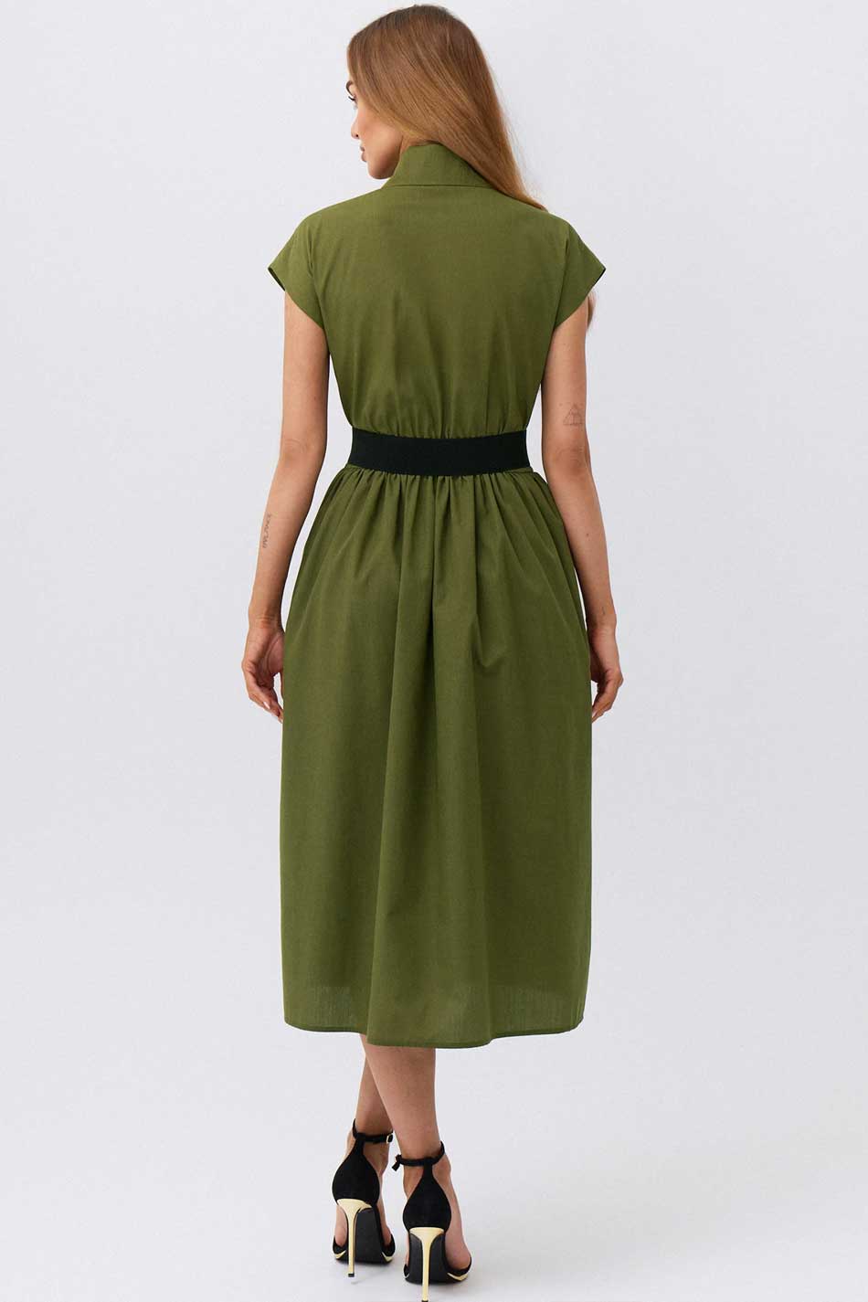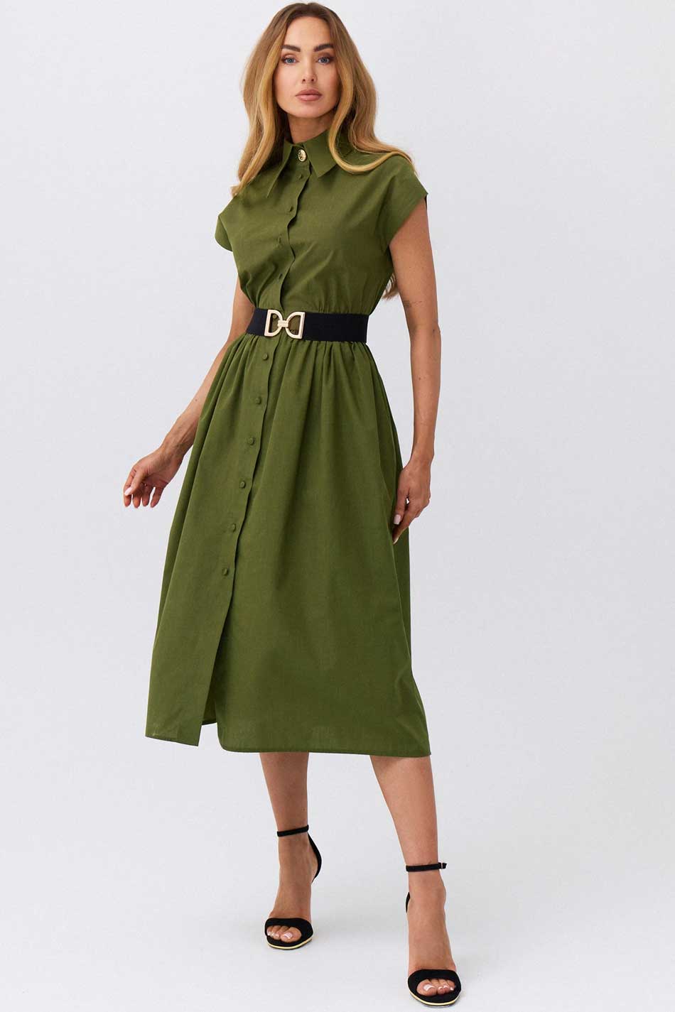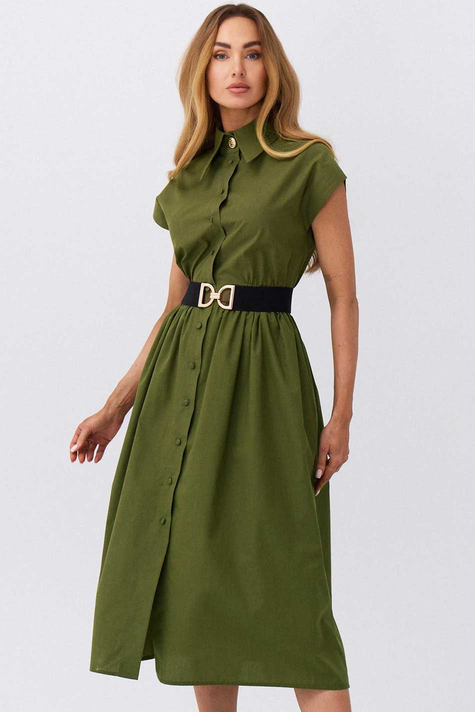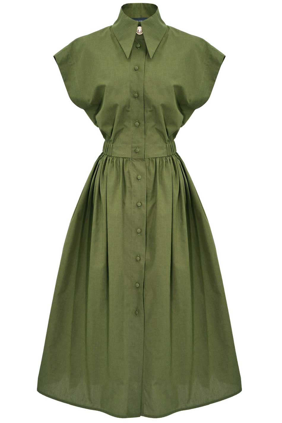 Elegancka sukienka Greta w kolorze zielonym to wyjątkowa propozycja dla kobiet ceniących ponadczasowy styl i dopracowane detale. Model zachwyca prostą, ale niezwykle kobiecą formą, która subtelnie podkreśla sylwetkę i nadaje całości wyrafinowanego charakteru. Sukienka została uszyta z 100% bawełny, która pięknie układa się na ciele, zapewniając komfort noszenia i elegancki wygląd przez cały dzień. Dopasowana góra harmonijnie łączy się z lekko rozkloszowanym dołem, tworząc proporcje podkreślające talię i nadające sylwetce lekkości. Starannie wykończone detale dodają całości subtelnej elegancji: oblekane tkaniną guziki, ozdobny złoty guzik, kieszenie w szwach bocznych, guma w talii dopasuje się do ciała. Zieleń w szlachetnym odcieniu nadaje sukience świeżości i klasy, sprawiając, że model doskonale sprawdzi się zarówno na wyjątkowe okazje, jak i bardziej formalne wyjścia. To uniwersalna propozycja, która z łatwością dopasuje się do różnych stylizacji – wystarczy zmienić dodatki, by nadać jej nowy charakter. Sukienka Greta to połączenie minimalizmu, jakości i kobiecej elegancji – idealna dla kobiet, które chcą wyglądać stylowo i czuć się WYJĄTKOWO W KAŻDEJ SYTUACJI.