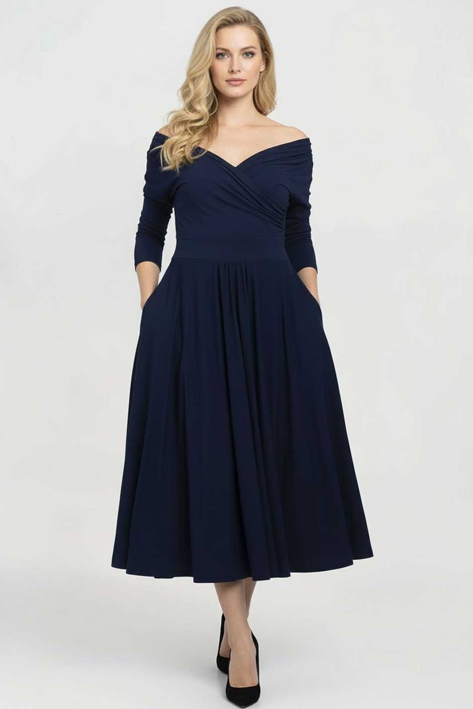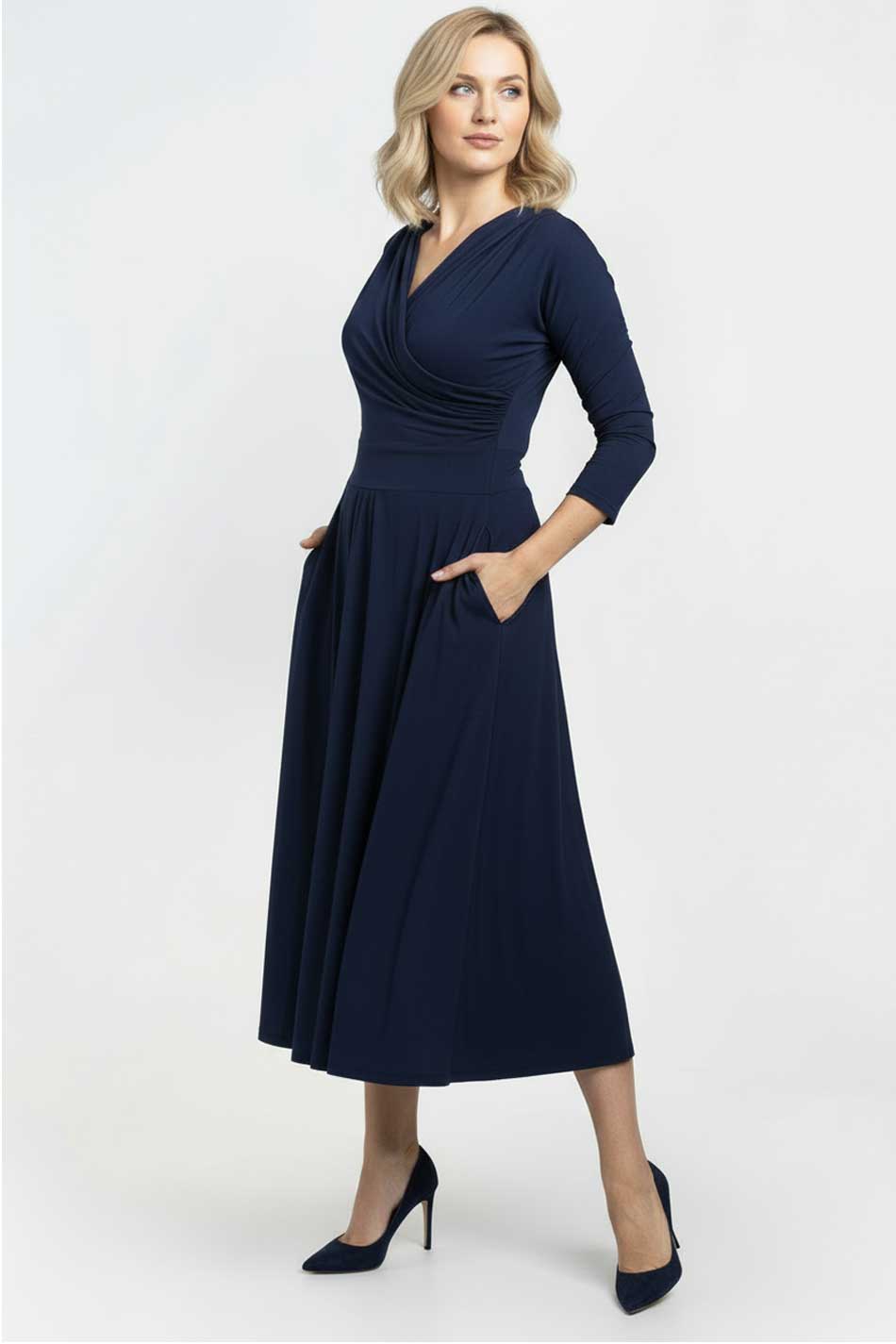 Wspaniała sukienka kopertowa dwustronna midi Kate granatowa marki YOU by Tokarska to produkt absolutnie wyjątkowy. Kreacja ta wykonana została z najwyższej jakości, polskiej dzianiny o gramaturze 220g, która gwarantuje komfort jej noszenia i trwałość. W produkcji tej sukienki użyto także wysokiej jakości, polskich nici, zapobiegając pękaniu szwów i zapewniając solidność konstrukcji. Sukienka kopertowa dwustronna midi Kate granatowa ma unikalny krój z dekoltem, który można nosić tył na przód. Dekolt z przodu jest na zakładkę i można swobodnie regulować jego głębokość. Dekolt łódka z tyłu może być dekoltem z przodu i wspaniale się prezentować. A "przedni" dekolt na zakładkę zmienia się z tyłu w piękne V z lekką wodą. Kreacja ta posiada dwie warstwy materiału zarówno z przodu, jak i z tyłu, które modelują sylwetkę i skutecznie ukrywają odznaczanie bielizny, a marszczenia na przodzie i tyle wysmuklają sylwetkę i dodają jej zmysłowości. Góra sukienki kopertowej dwustronnej midi Kate granatowej połączona jest ze spódnicą podwójnym pasem, który wspaniale podkreśla kobiecość tego projektu. Dodatkowo, kreacja ta posiada głębokie kieszenie, które są nie tylko praktyczne, ale również dodają jej charakteru i luzu. Długość midi tej sukienki sprawia, że nadaje się ona na różne okazje bo świetnie prezentuje się zarówno ze szpilkami, jak i z balerinkami, kozakami, sneakersami, mokasynami czy nawet kowbojkami. Ta wspaniała sukienka powinna uzupełnić garderobę każdej, ceniącej znakomity styl, pani. WYJĄTKOWA!