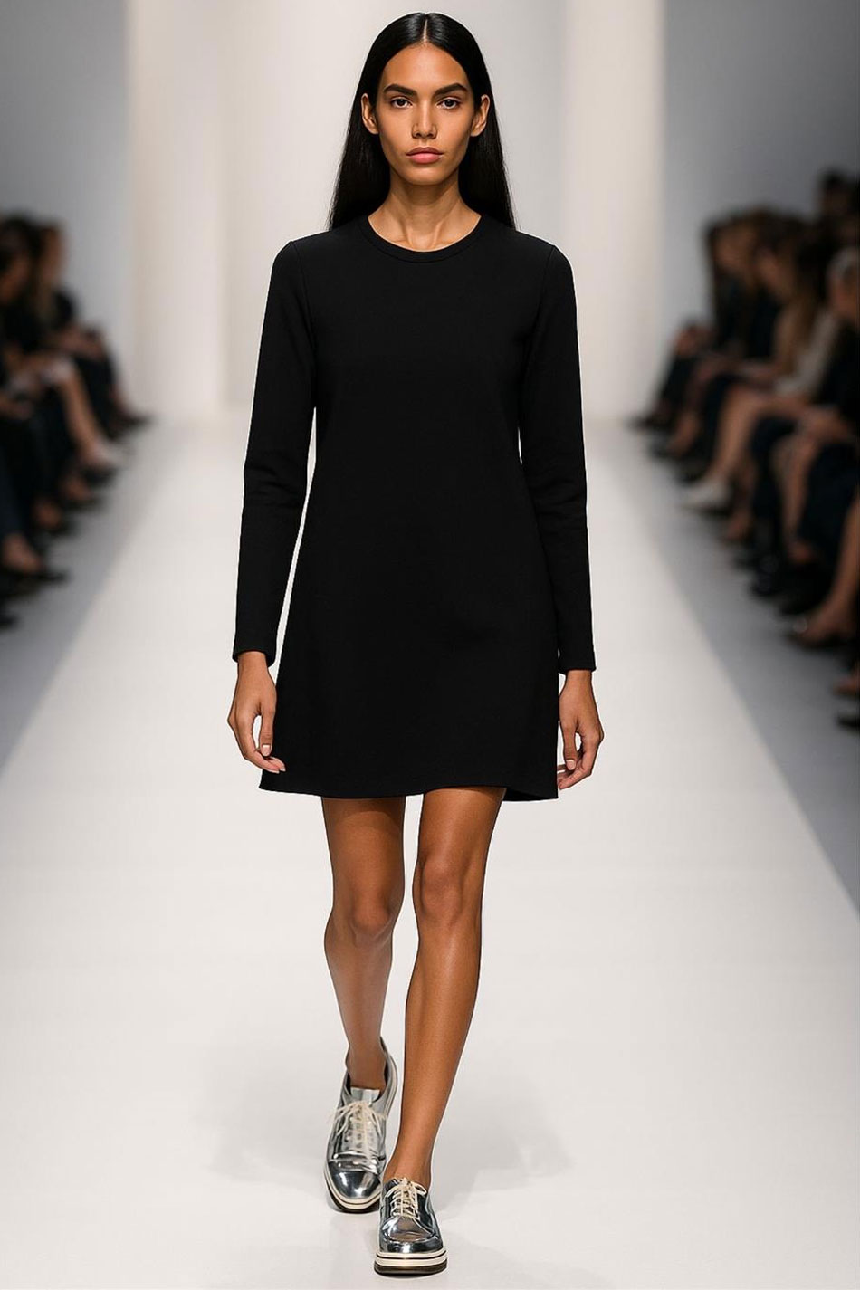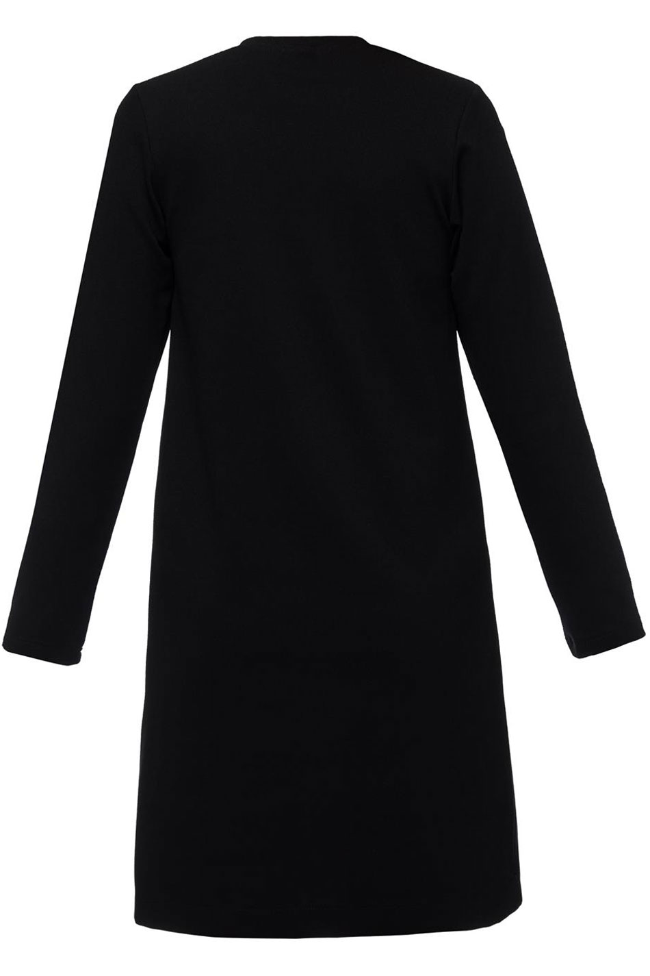 Sukienka linia A mini okrągły dekolt długi rękaw czarna to niezwykle wygodna propozycja, która powinna stanowić fundament każdej, kobiecej garderoby. Jej trapezowaty krój subtelnie zamaskuje ewentualne niedoskonałości sylwetki, jednocześnie zapewniając pełną swobodę ruchów w każdej sytuacji, a jej okrągły dekolt oraz długie rękawy podkreślają klasyczny charakter tego modelu. Sukienka ta pozbawiona jest zapięć i podszewki, dzięki czemu użytkuje się ją bardzo komfortowo. Kreacja ta w całości wykonana została z naturalnej, przewiewnej dzianiny, która pozwala skórze oddychać przez cały dzień. Sukienka linia A mini okrągły dekolt długi rękaw czarna świetnie sprawdzi się w różnych outfitach, tym bardziej, że można ją zestawić zarówno z eleganckimi czółenkami, jak i sportowym obuwiem, tworząc uniwersalne zestawy. PONADCZASOWA KLASYKA!