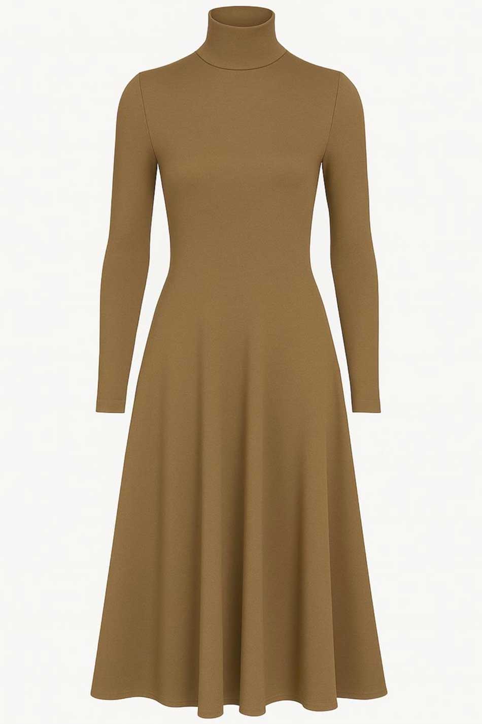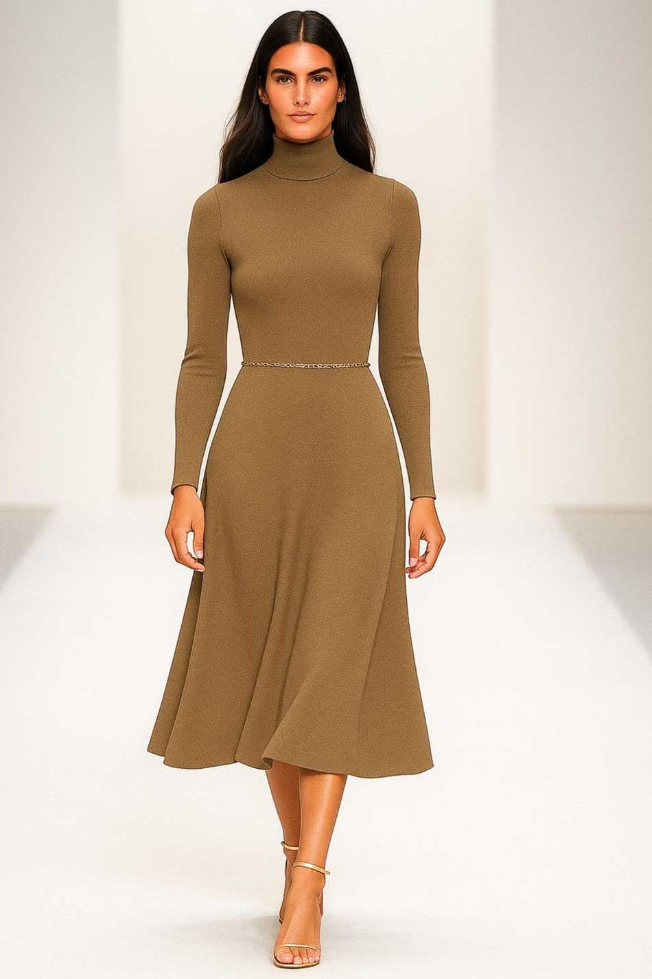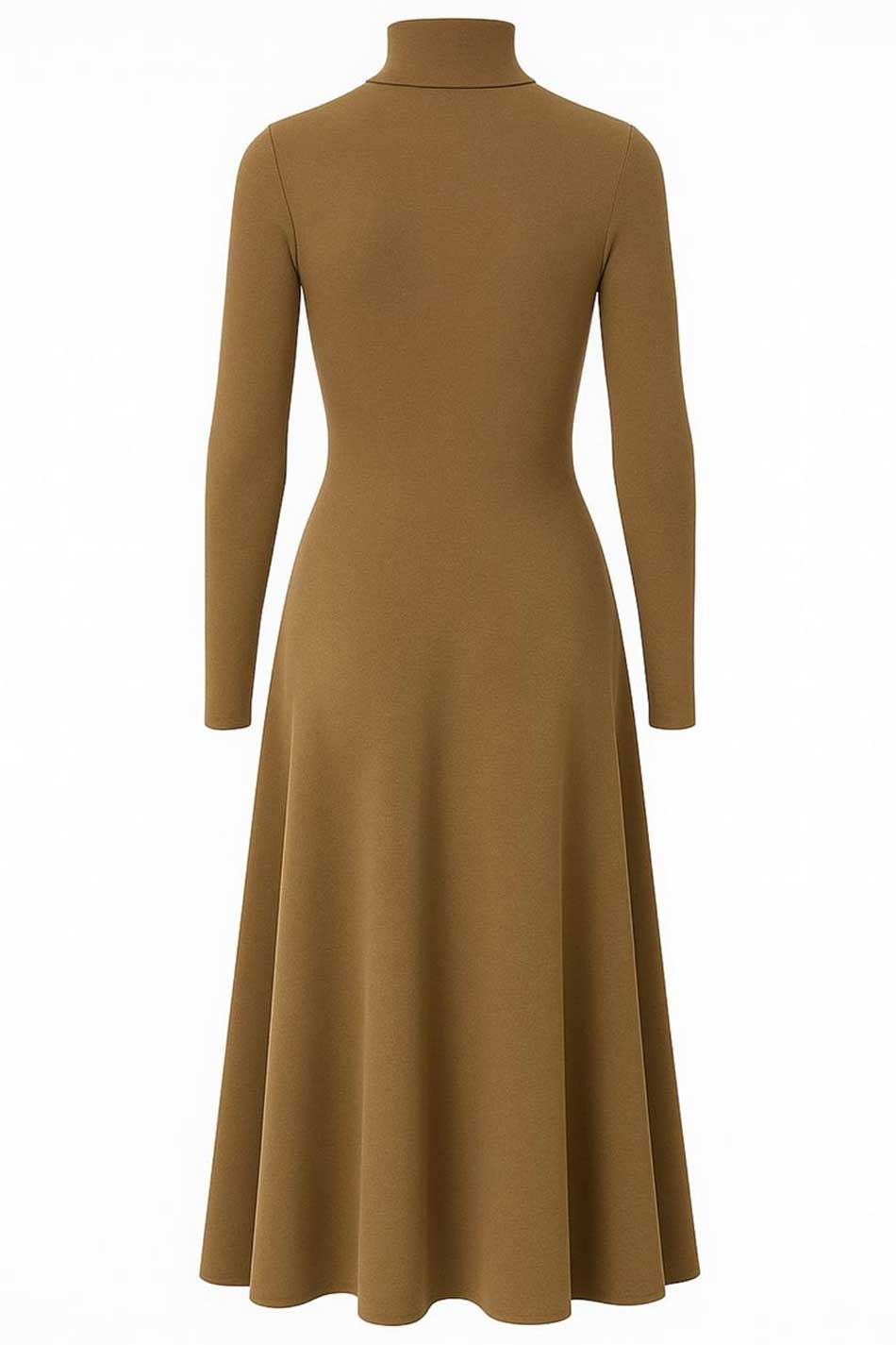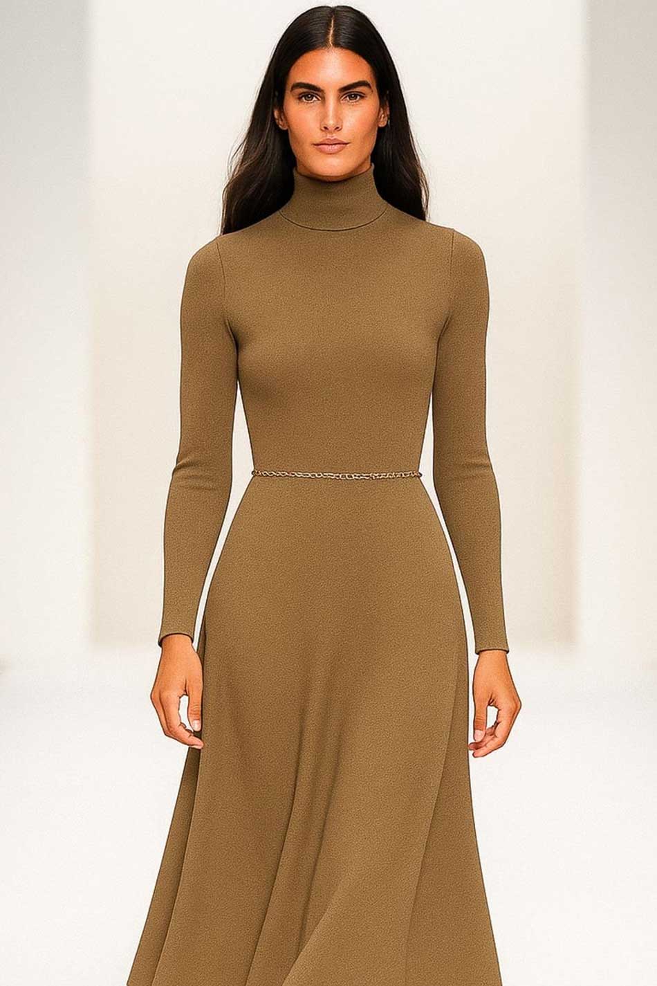 Sukienka midi dekolt golf długi rękaw cappuccino wyróżnia się elegancją zaklętą w ciepłym, wyrafinowanym odcieniu i wygodą, którą gwarantuje jej perfekcyjne wykonanie. Dopasowana linia góry tego modelu pięknie komponuje się z delikatnie rozszerzanym dołem, dzięki czemu kreacja ta zachowuje lekkość i subtelną dynamikę. Golf tej sukienki podkreśla jej klasyczną formę i nadaje całości spokojnego, butikowego charakteru. Długie rękawy tego projektu utrzymują harmonijne proporcje, a brak zapięć sprawia, że model ten zyskuje dodatkową wygodę. Dzianina, z której uszyta została ta kreacja jest jakościowa, miękka, kryjąca i przyjazna skórze, co zapewnia wysoki komfort jej użytkowania. Sukienka midi dekolt golf długi rękaw cappuccino to doskonała propozycja do stylizacji warstwowych oraz jako samodzielny, elegancki look. W "SZLACHETNYM" TONIE!
