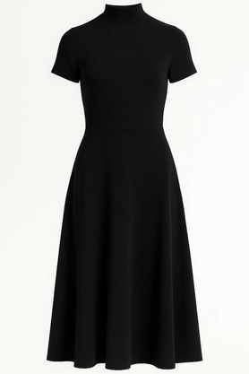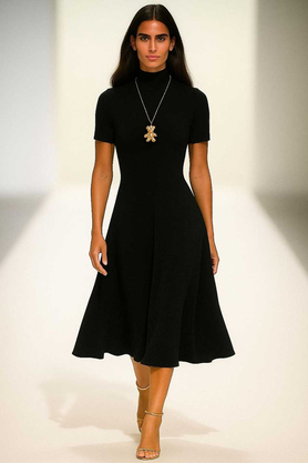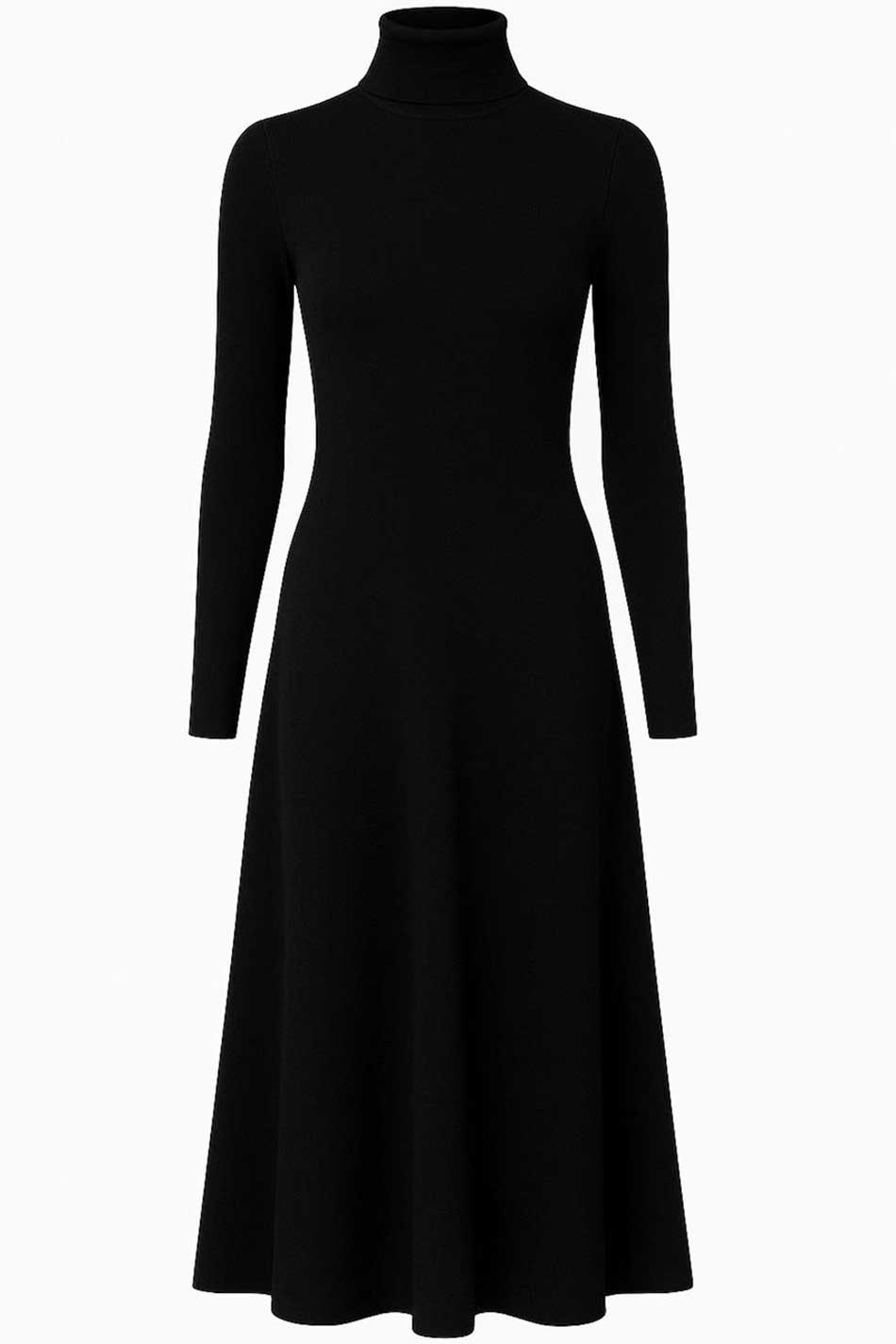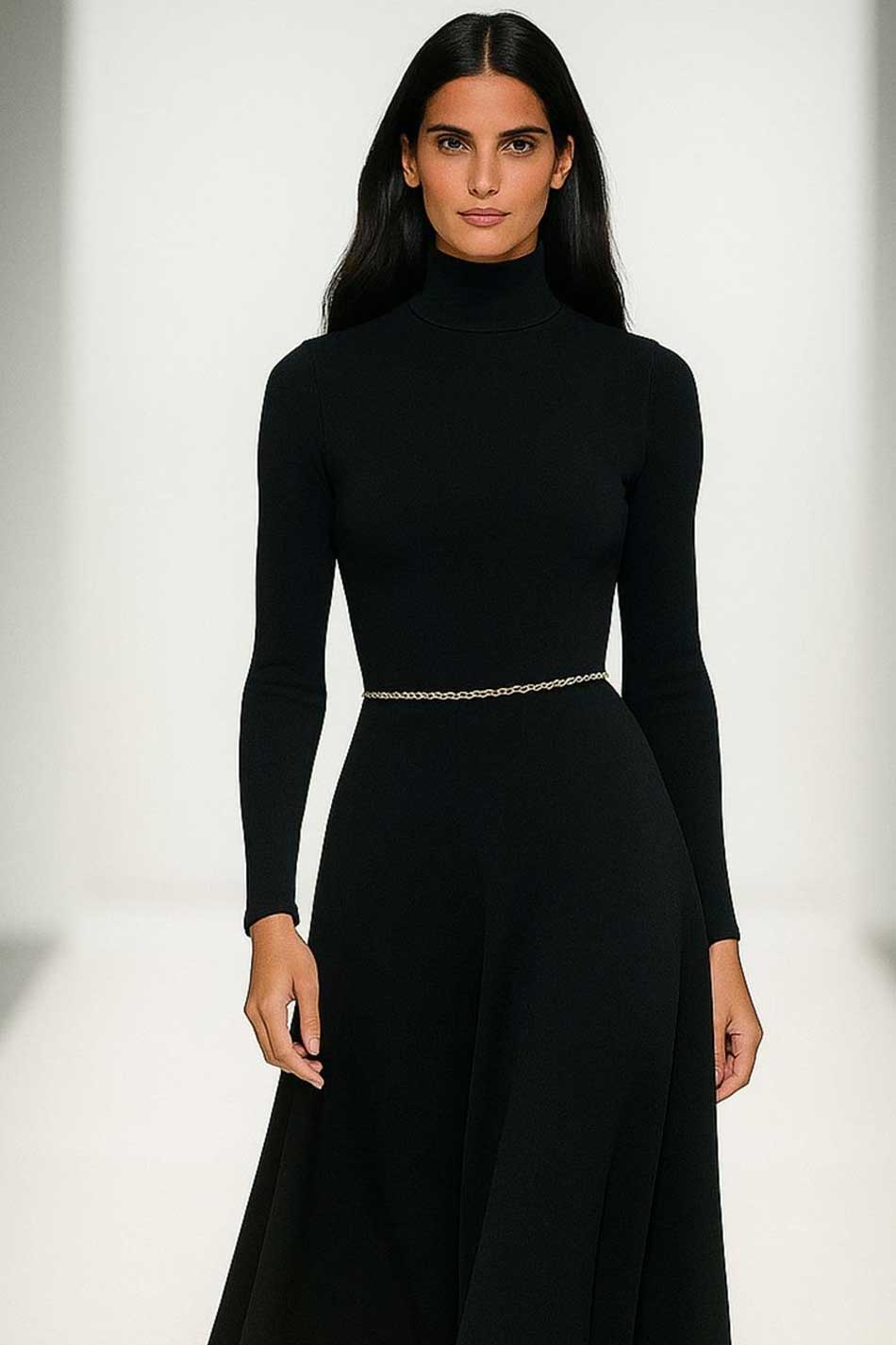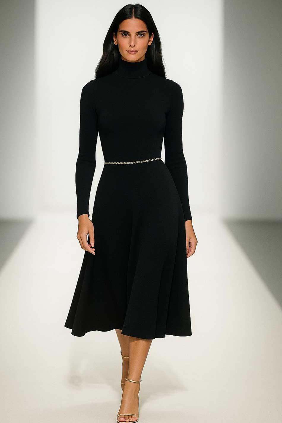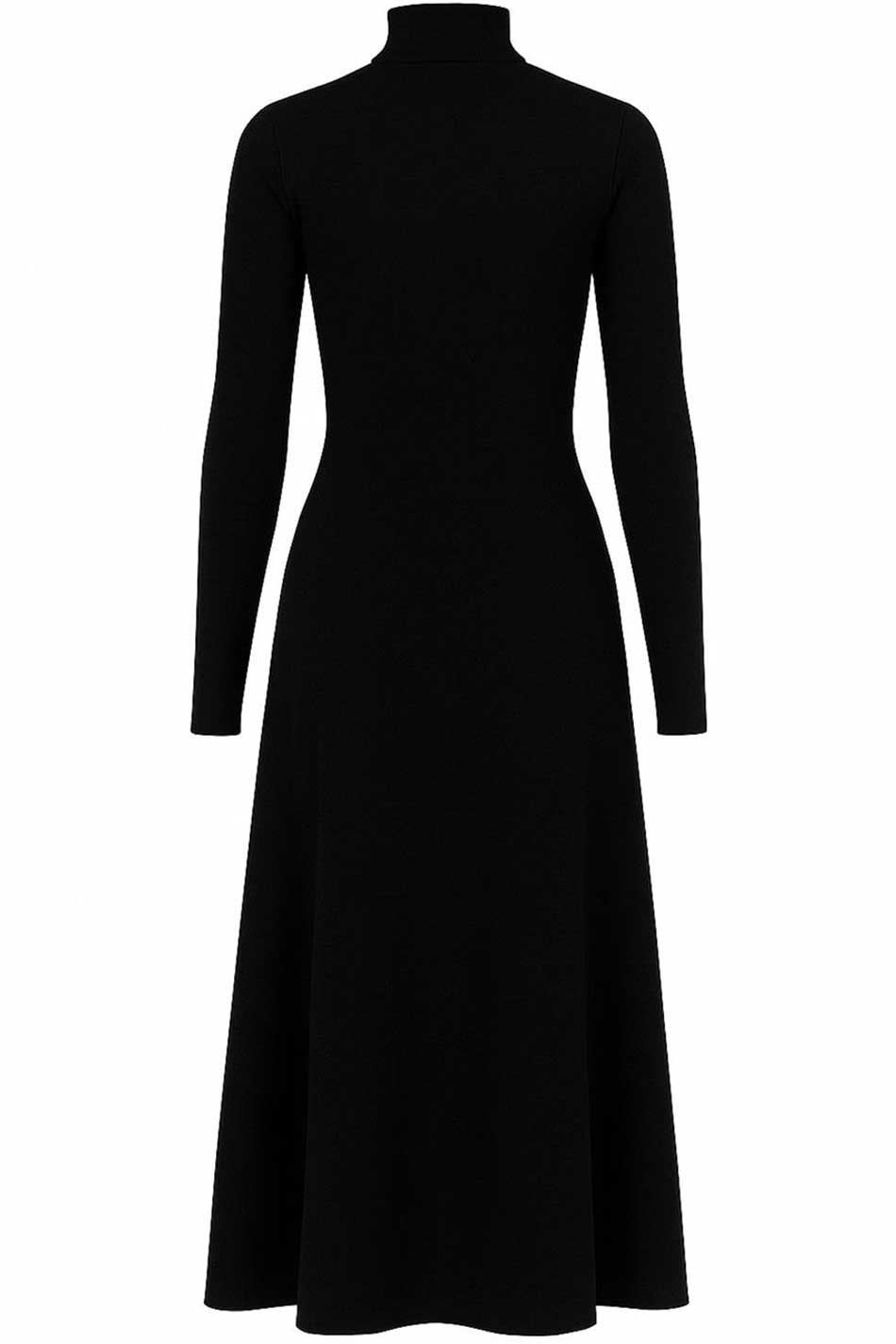 Sukienka midi dekolt golf długi rękaw czarna to klasyk w nowoczesnym, butikowym wydaniu. Głęboka czerń tego modelu podkreśla jego elegancję, a miękka, elastyczna dzianina, z której został uszyty, dopasowuje się do sylwetki, zapewniając wyjątkowy komfort noszenia. Góra tej kreacji utrzymana jest w minimalistycznej formie z dopasowaną linią, natomiast jej dół delikatnie się rozszerza, co nada lekkości i płynności podczas ruchu. Golf stanowi kluczowy element tej konstrukcji i stworzy efektowny, klasyczny kontur wokół szyi. Długie rękawy tego projektu dopełniają proporcji, a brak zapięć pozwala utrzymać nowoczesną, czystą linię stylu. Sukienka midi dekolt golf długi rękaw czarna to uniwersalna baza modowa na lata. BAZA MODOWA NA LATA!