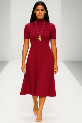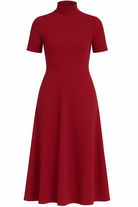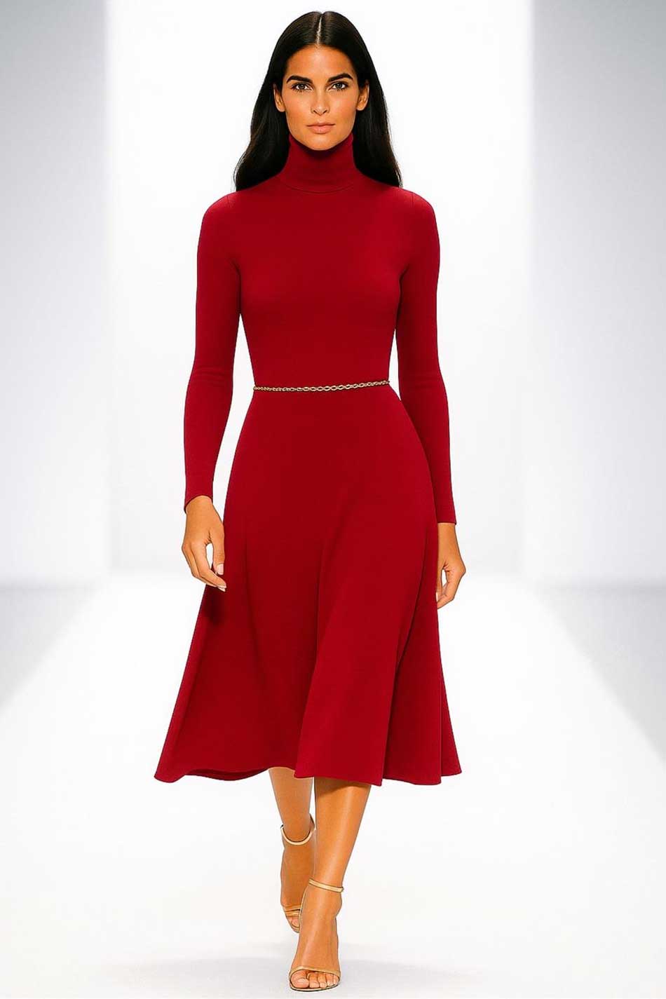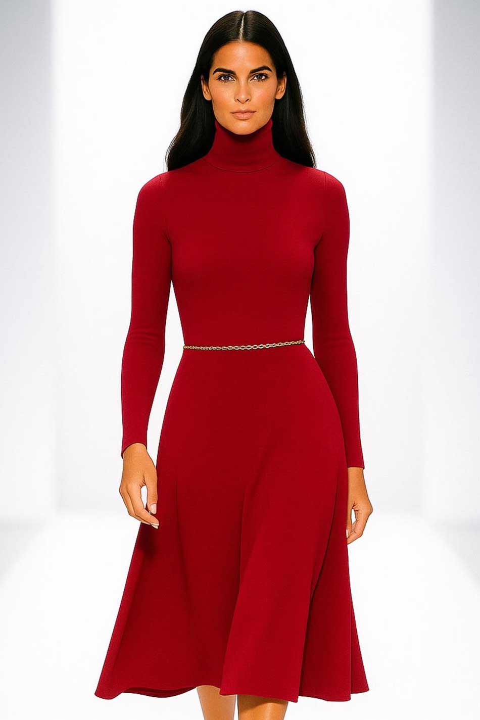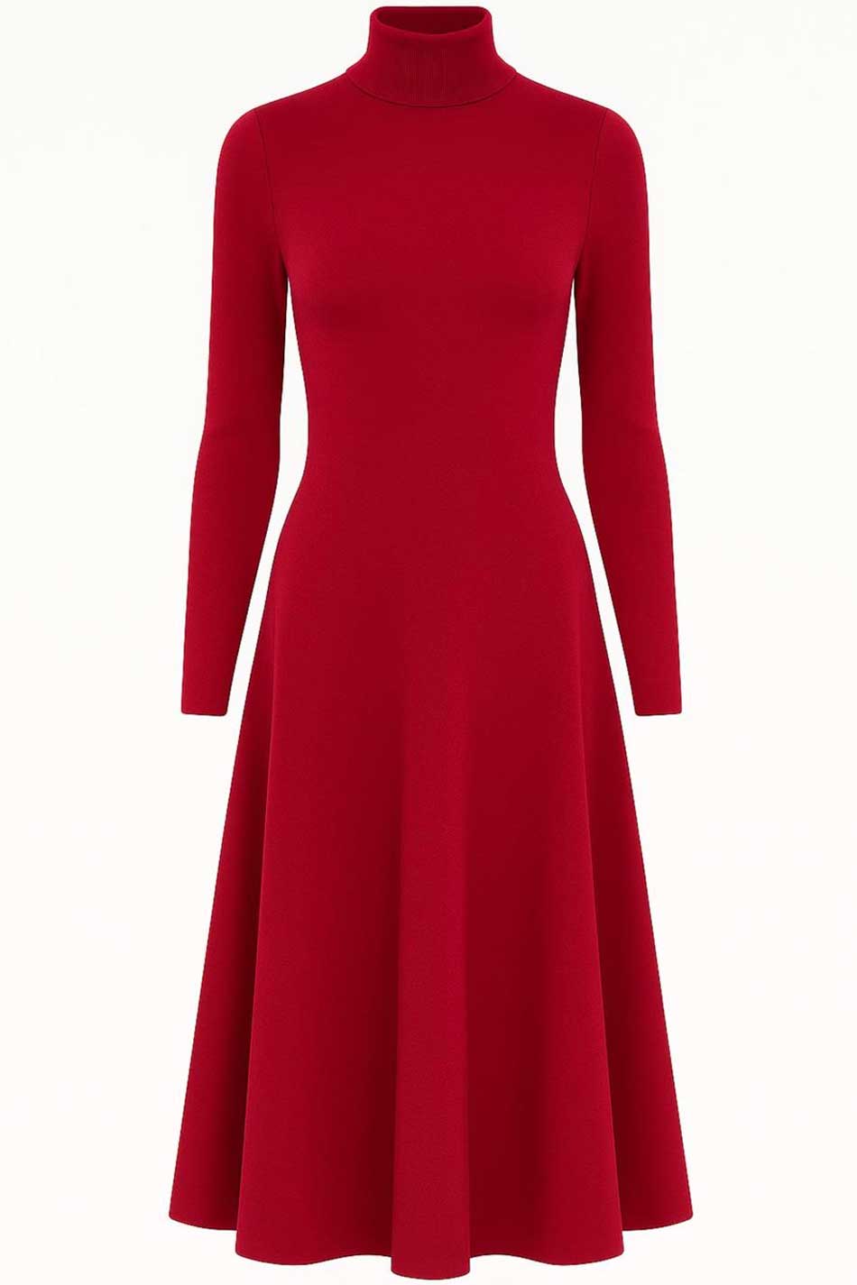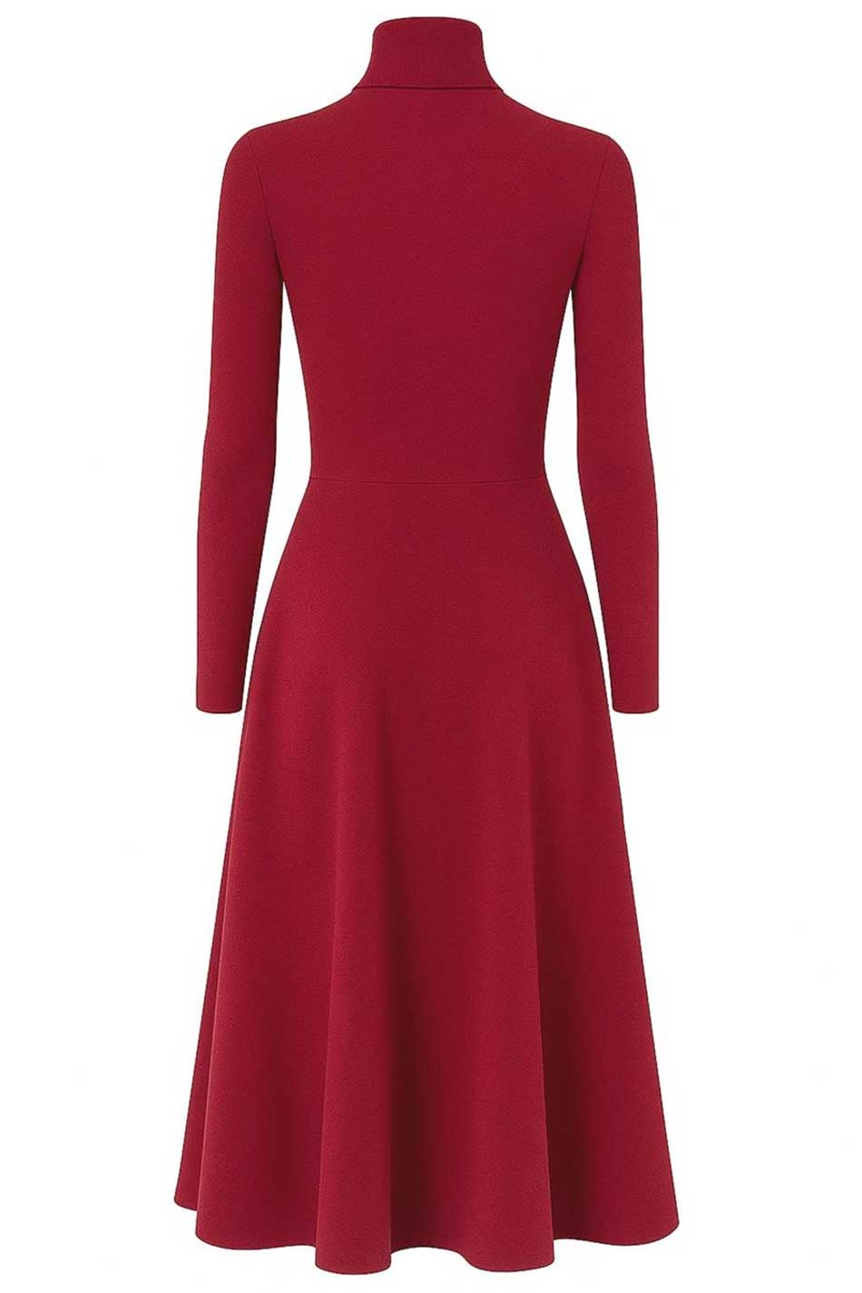 Sukienka midi dekolt golf długi rękaw czerwona prezentuje wyjątkowy charakter, łącząc intensywną barwę z klasycznym, nowoczesnym krojem. Wysokiej jakości, miękka dzianina, z której uszyta została ta sukienka gwarantuje komfort noszenia oraz świetne dopasowanie, a jej elastyczność pozwoli zachować idealny wygląd nawet przez cały dzień. Dopasowana część górna tej kreacji stworzy elegancki kontur, natomiast lekko rozkloszowany dół doda subtelnej lekkości każdemu outfitowi. Golf tego modelu efektownie podkreśli górę sylwetki, a długie rękawy wzmocnią jego minimalistyczną linię. Sukienka midi dekolt golf długi rękaw czerwona nie ma zapięć, co gwarantuje wygodę jej użytkowania, a jednocześnie pozwala zachować nowoczesną prostotę. Model ten doskonale sprawdzi się podczas wielu okazji, od codziennych po bardziej "wyraziste". WYRAZISTY AKCENT!