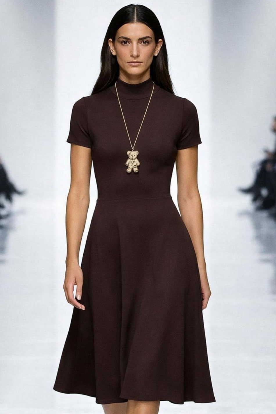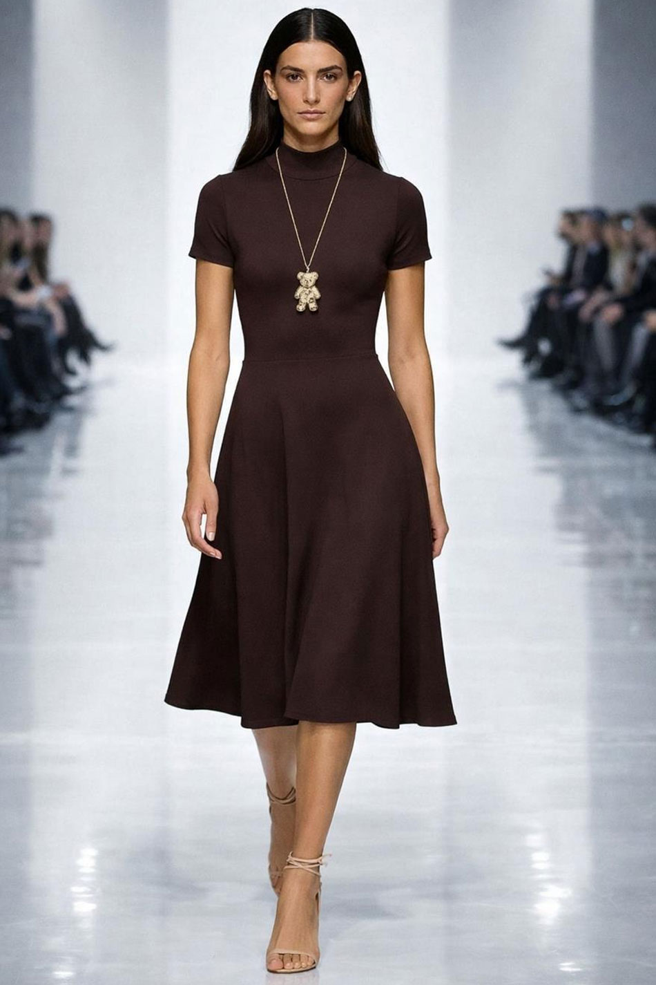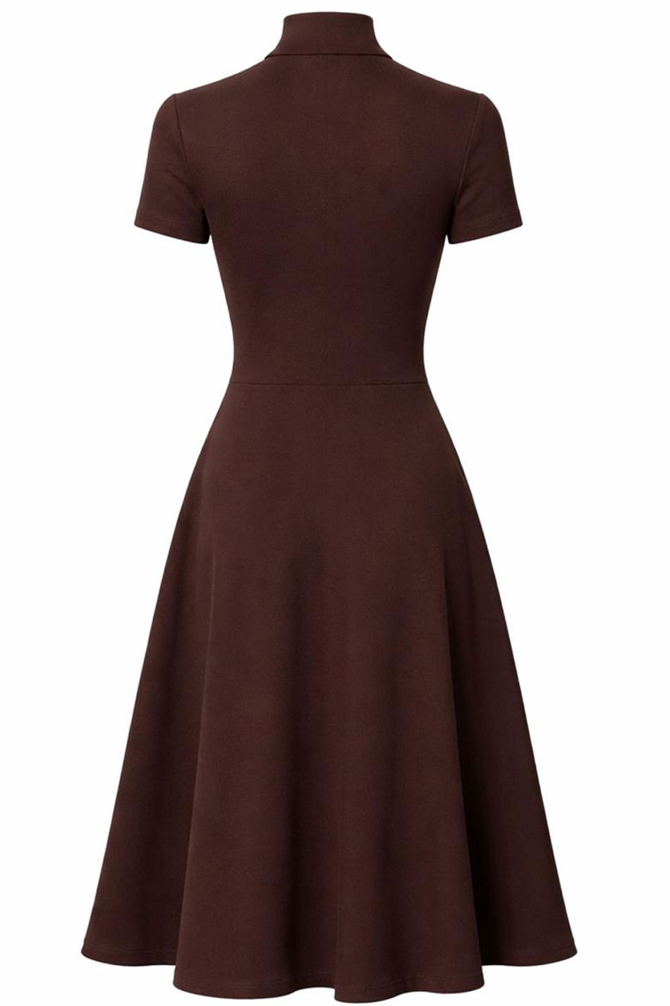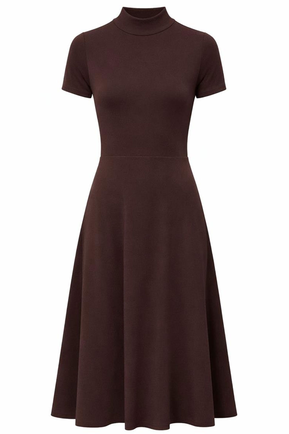 Sukienka midi dekolt golf krótki rękaw brązowa to stylowa i komfortowa propozycja w ciepłym, stonowanym odcieniu, który doskonale wpisuje się w ponadczasowe trendy. Jej minimalistyczna forma sprawia, że będzie stanowiła ona idealną bazę do wielu różnorodnych stylizacji – od codziennych po bardziej dopracowane. Model ten wykonany został z wysokiej jakości, elastycznej dzianiny o przyjemnej w dotyku strukturze, która dobrze dopasowuje się do sylwetki i zapewni wygodę nawet przez cały dzień. Góra tej sukienki jest dopasowana i wykończona golfem, co nadaje jej eleganckiego, nieco bardziej wyrafinowanego charakteru, a jej krótkie rękawy równoważą całość, dodając lekkości i uniwersalności. Dół tej kreacji delikatnie rozszerza się, tworząc swobodną linię, która nie będzie krępowała ruchów i subtelnie wymodeluje sylwetkę, a jej długość midi doda każdemu outfitowi odrobinę elegancji. Sukienka midi dekolt golf krótki rękaw brązowa to doskonały wybór dla kobiet ceniących wygodę, jakość i ponadczasowy styl. PONADCZASOWA!