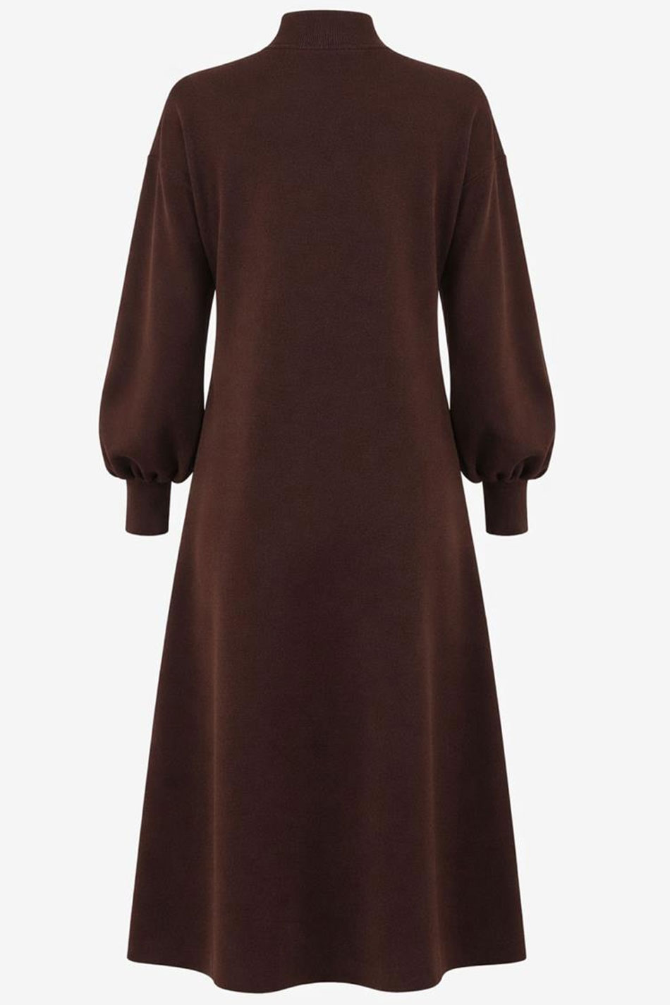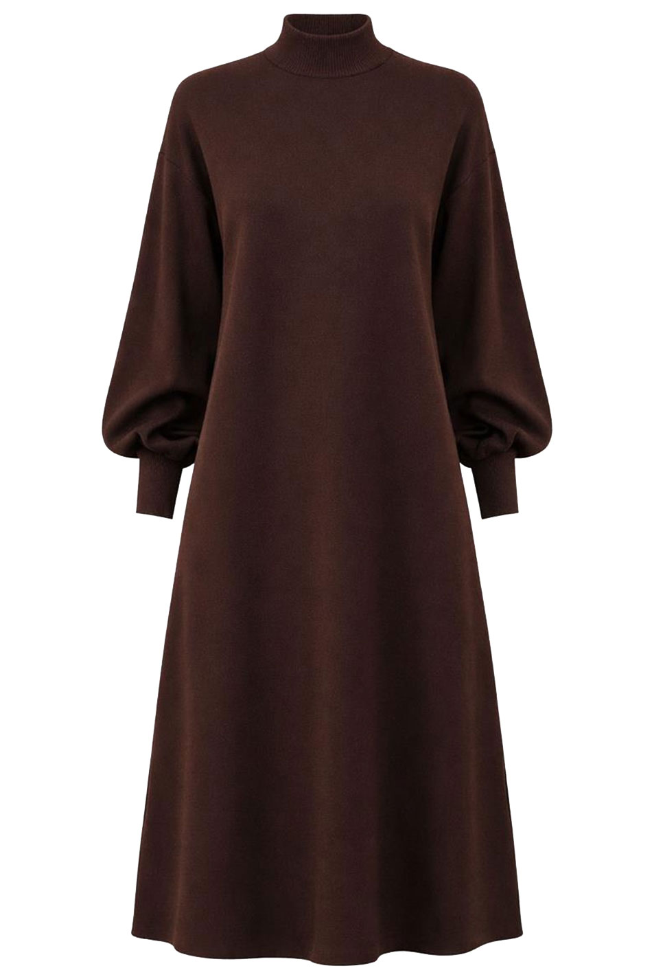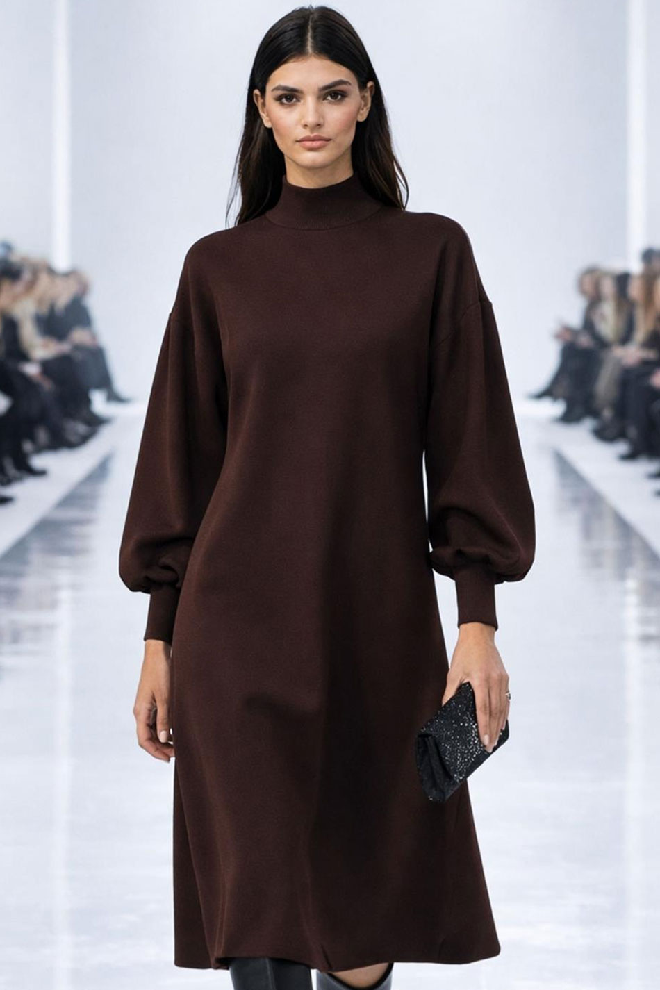 Sukienka midi dekolt półgolf długi bufiasty rękaw brązowa to stylowa propozycja, która łączy elegancję z komfortem noszenia. Ciepły, brązowy odcień nadaje tej kreacji przytulnego, a jednocześnie szlachetnego charakteru, idealnie wpisując się w ponadczasową paletę barw. Fason tej sukienki ma swobodną, lekko rozkloszowaną linię, która miękko ułoży się na sylwetce i zapewni wygodę przez cały dzień. Długość midi dodaje temu modelowi elegancji i sprawi, że zaprezentuje się odpowiednio zarówno w codziennych, jak i bardziej formalnych stylizacjach. Dekolt typu półgolf w tej sukience subtelnie podkreśl linię szyi i wprowadzi do każdego outfitu nutę wyrafinowania. Najbardziej charakterystycznym elementem tej kreacji są długie, bufiaste rękawy zakończone mankietami, które nadają jej modowego wyrazu. Model ten wykonany został z wysokiej jakości, przyjemnej dla skóry tkaniny, która jest przewiewna i komfortowa w noszeniu. Sukienka midi półgolf brązowa doskonale sprawdzi się w pracy, na spotkaniach, jak i podczas bardziej eleganckich wyjść, oferując styl, wygodę i ponadczasową formę. STYLOWA!