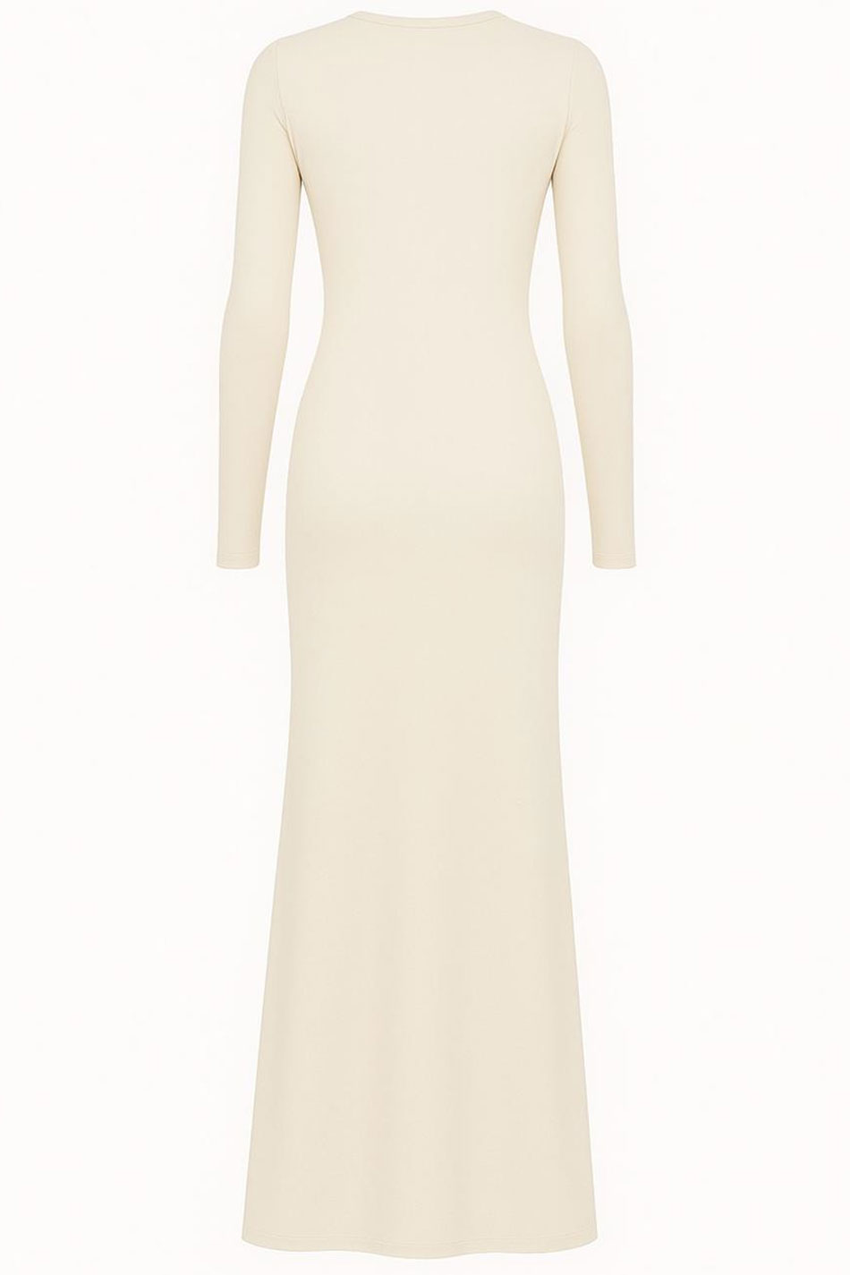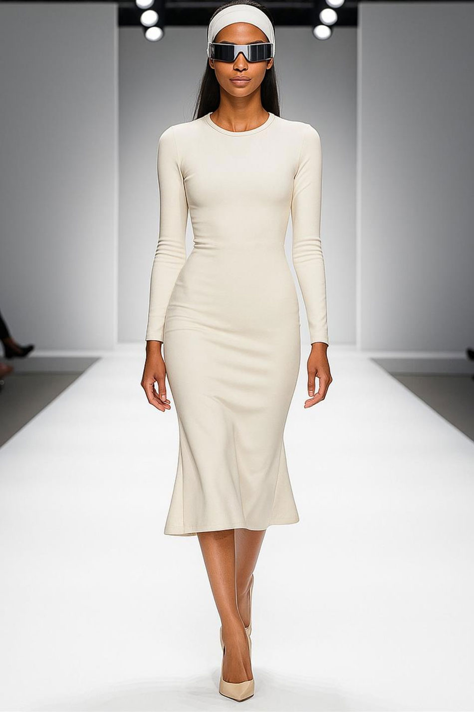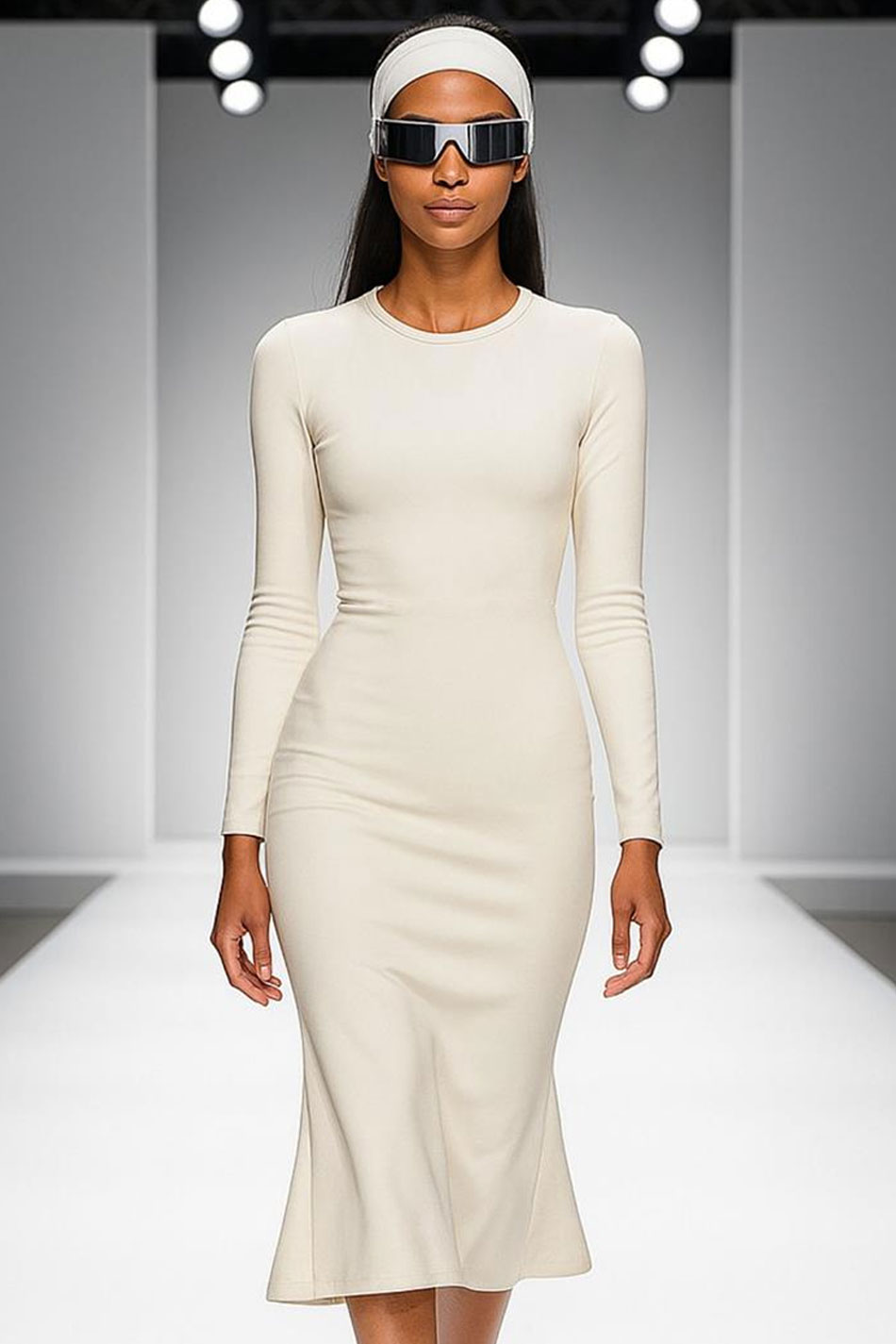 Sukienka midi okrągły dekolt długi rękaw ecru to model, który łączy prostotę kroju z wyjątkowym wyrafinowaniem. Miękka, kryjąca dzianina, z której uszyta została ta sukienka pięknie układa się na sylwetce, podkreślając jej naturalne linie, a przy tym zapewniając pełen komfort ruchu. Klasyczny, okrągły dekolt i długie rękawy tej kreacji tworzą harmonijną całość, idealną do wielu stylizacji – od codziennych po wieczorowe. Jasny odcień ecru dodaje temu modelowi lekkości i świeżości, czyniąc tą sukienkę idealną bazą dla dodatków w złocie, srebrze czy intensywnych barwach. Sukienka midi okrągły dekolt długi rękaw ecru to ponadczasowa propozycja, która zachwyca prostotą i klasą. ELEGANCJA W NAJCZYSTSZEJ FORMIE!