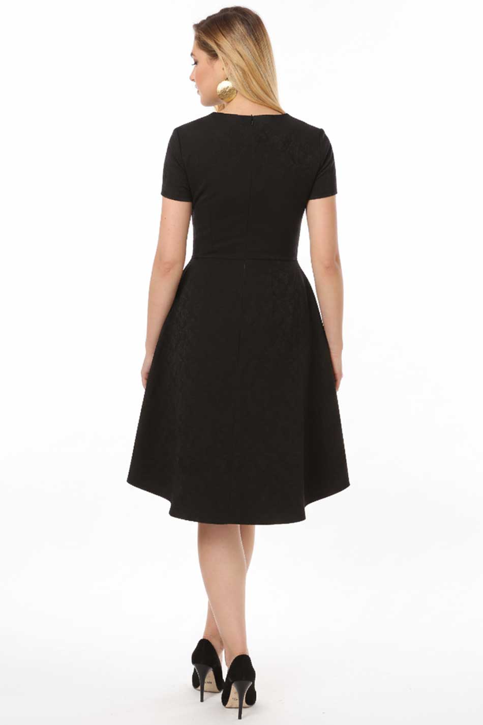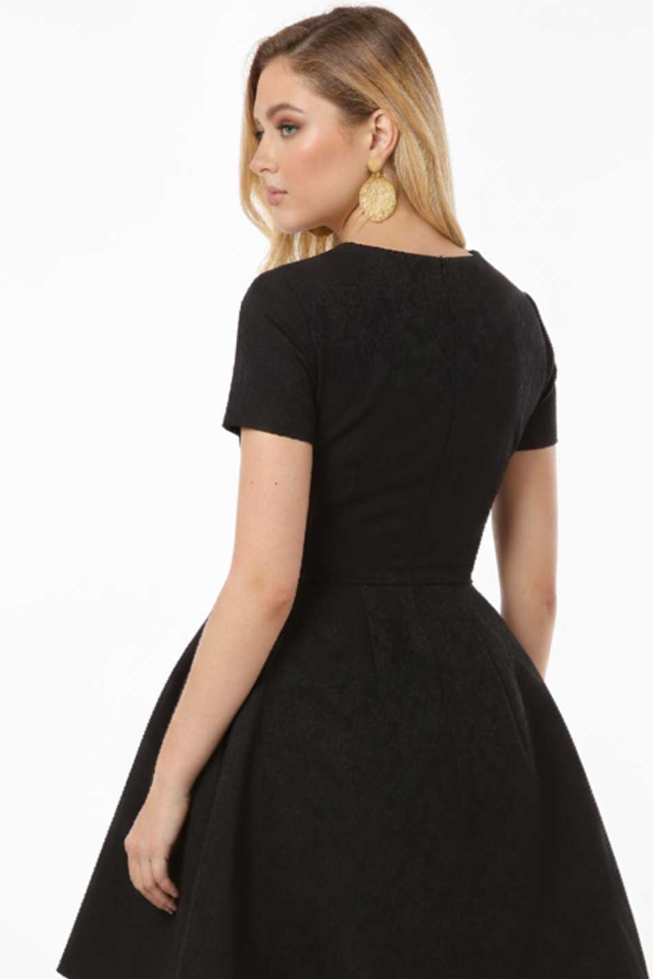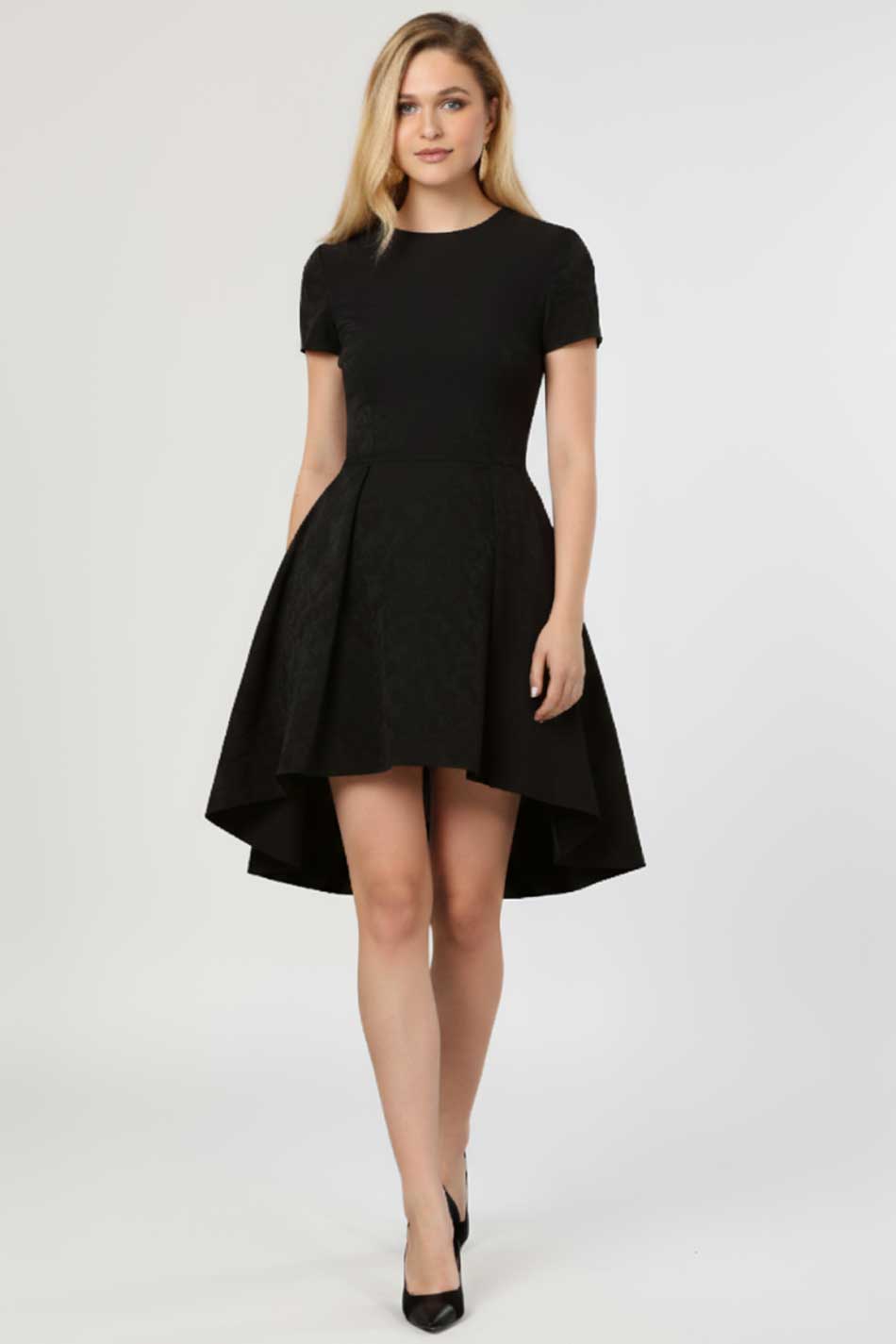 Elegancka i wyjątkowa sukienka mini uszyta z czarnej, bawełnianej tkaniny żakardowej o subtelnym, przestrzennym, kwiatowym wzorze. Plastyczny materiał doskonale układa się na sylwetce, jest miękki i przyjemny w dotyku, a wiskozowa podszewka zapewnia komfort noszenia. Asymetryczny fason, z krótszym przodem i dłuższym tyłem, nadaje sukience nowoczesnego charakteru. Prosta, dopasowana góra z krótkim rękawem i zabudowanym dekoltem podkreśla elegancję, a rozkloszowany dół z zakładkami z przodu i zaszewkami z tyłu dodaje lekkości i dynamiki. Sukienka wykończona jest zamkniętą konstrukcją spodnią, a kryty zamek z tyłu zapewnia idealne dopasowanie. To doskonały wybór na przyjęcia, wieczorne wyjścia i wyjątkowe okazje – ponadczasowa klasa i elegancja w najlepszym wydaniu! KLASA I ELEGANCJA!