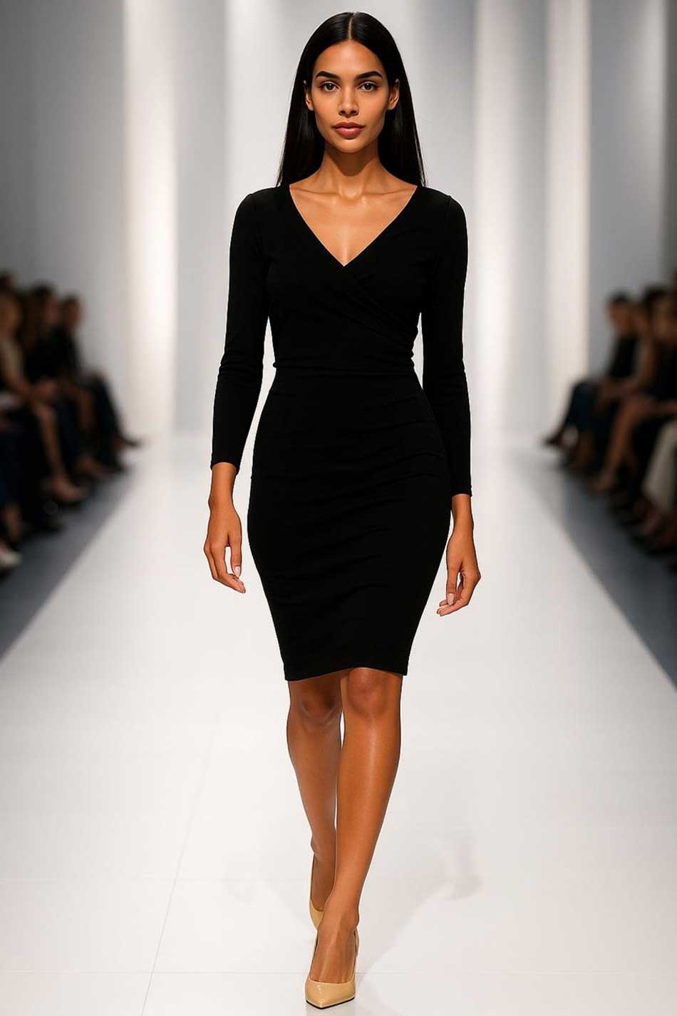 Przepiękna sukienka o ołówkowym kroju wykonana z wysokiej jakości tkaniny przepuszczającej powietrze w kolorze czarnym. Obcisły fason oraz dekolt w szpic pięknie podkreśla kobiece kształty, długość midi dodaje kilku centymetrów, a długie rękawy wyszczuplają ramiona i ręce. NA CO DZIEŃ I OD ŚWIĘTA!