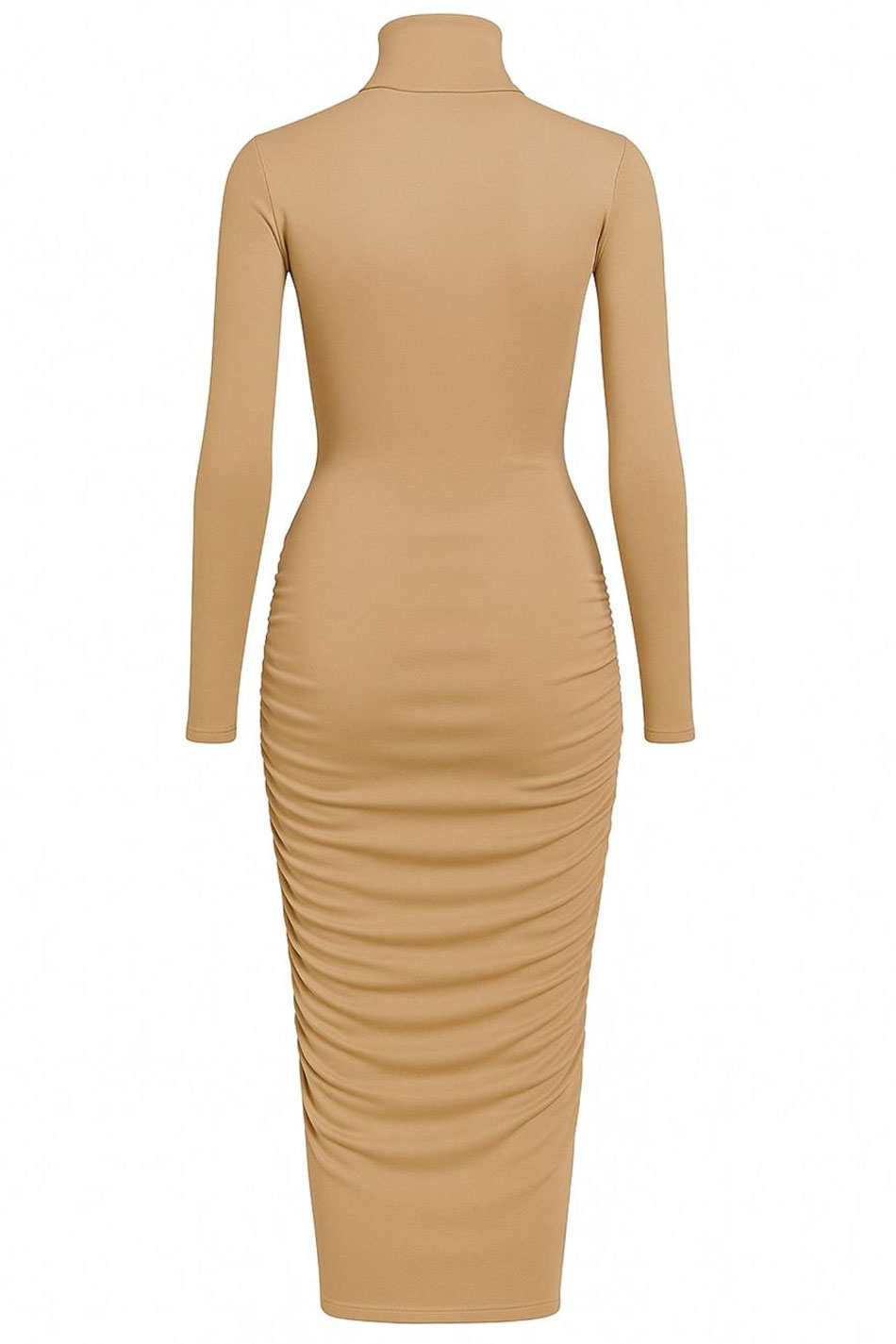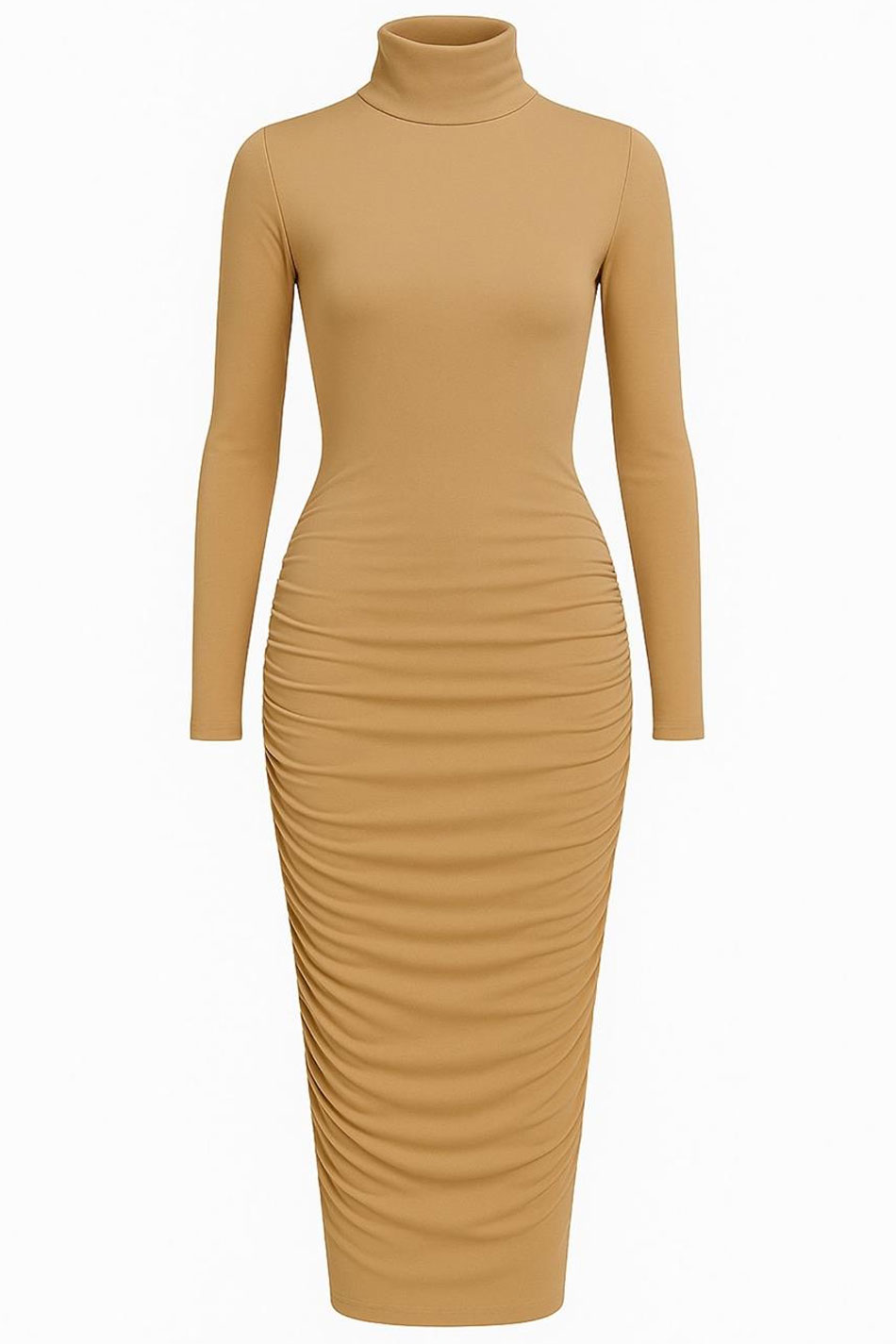 Sukienka ołówkowa długa dekolt golf długi rękaw karmelowa to wyjątkowy model, w którym naturalne ciepło odcienia łączy się z prostotą kroju i najwyższą jakością wykonania. Elastyczna dzianina, o miękkiej, otulającej strukturze z której wykonana została ta kreacja, idealnie dopasuje się do ciała, podkreślając jego kształty bez uczucia skrępowania. Dekolt golf tej sukienki i jej długie rękawy nadają całości harmonii i wyważonej elegancji. Karmelowy ton tego modelu wprowadzi do każdej stylizacji "nutę przytulności", a jego długość sprawia, że będzie on wyglądał niezwykle stylowo zarówno z botkami, jak i eleganckimi szpilkami. Sukienka ołówkowa długa dekolt golf długi rękaw karmelowa to zdecydowanie najlepsza propozycja zarówno na co dzień, jak i na specjalne okazje. ZNAKOMITA!