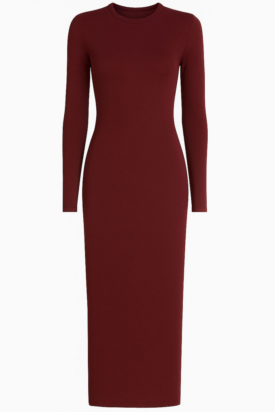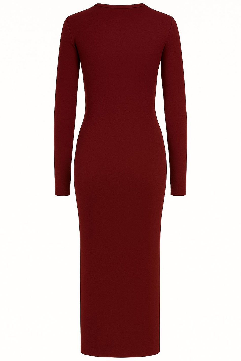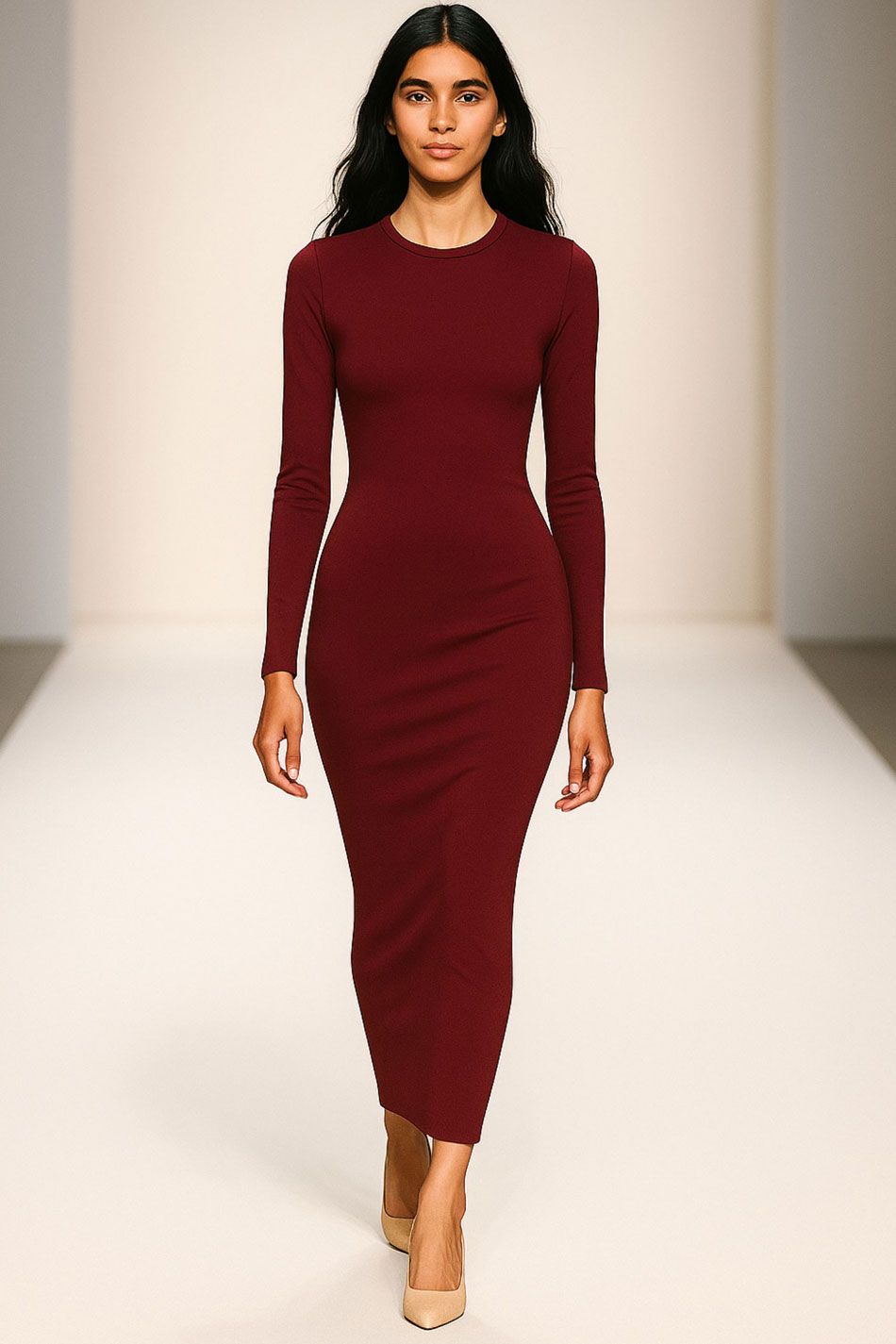 Sukienka ołówkowa długa okrągły dekolt długi rękaw burgund to esencja zmysłowej elegancji. Jej głęboki kolor, w połączeniu z dopracowanym fasonem, tworzy efekt luksusu i subtelnej klasy. Dzianina o naturalnym składzie i średniej grubości, z której została uszyta ta sukienka, perfekcyjnie otuli ciało, zapewni wygodę i idealne dopasowanie. Ołówkowy krój tej kreacji pozwala na piękne modelowanie sylwetki, a okrągły dekolt na łagodne podkreślenie linii szyi. Długie rękawy w połączeniu z dopasowanym dołem nadadzą całości proporcji i lekkości. Sukienka ołówkowa długa okrągły dekolt długi rękaw burgund będzie najlepszym wyborem zarówno na uroczyste kolacje, jak i spotkania koktajlowe, czy wieczorne wyjścia. ESENCJA ZMYSŁOWEJ ELEGANCJI!
