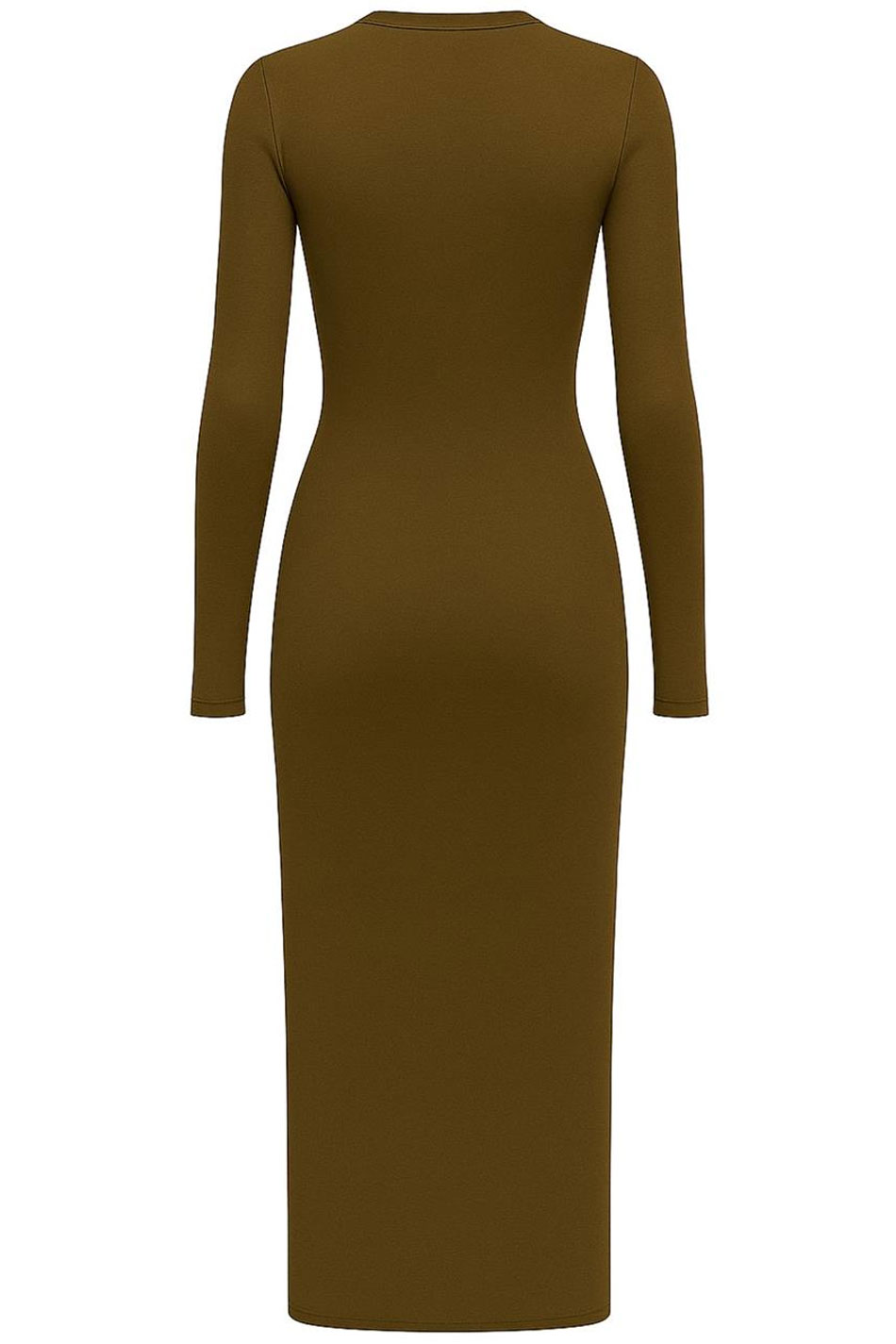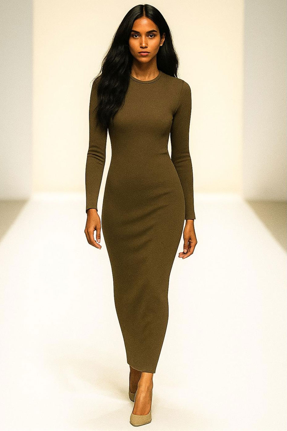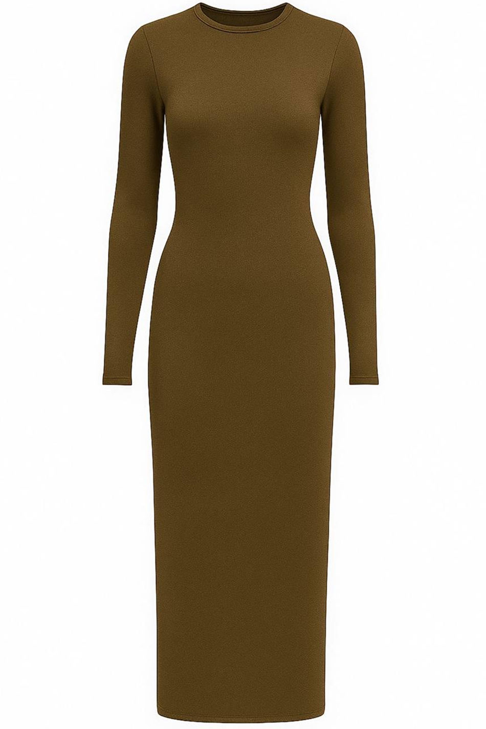Sukienka ołówkowa długa okrągły dekolt długi rękaw khaki wyróżnia się naturalnym, ziemistym tonem, który znakomicie podkreśli urodę każdej kobiety. Dzianina, z której został wykonany ten model, jest elastyczna, miękka i przyjemna w dotyku i gwarantuje komfort noszenia oraz idealne dopasowanie do sylwetki. Ołówkowy fason tej sukienki pozwala na wysmuklenie ciała i delikatne podkreślenie talii, a okrągły dekolt na wprowadzenie równowagi w minimalistycznej formie. Długie rękawy nadają całości elegancji, a prosty dół pozwala na łatwe zestawienie tej kreacji z różnymi dodatkami. Sukienka ołówkowa długa okrągły dekolt długi rękaw khaki doskonale sprawdzi się zarówno w codziennych stylizacjach, jak i bardziej oficjalnych sytuacjach. INTRYGUJĄCA!