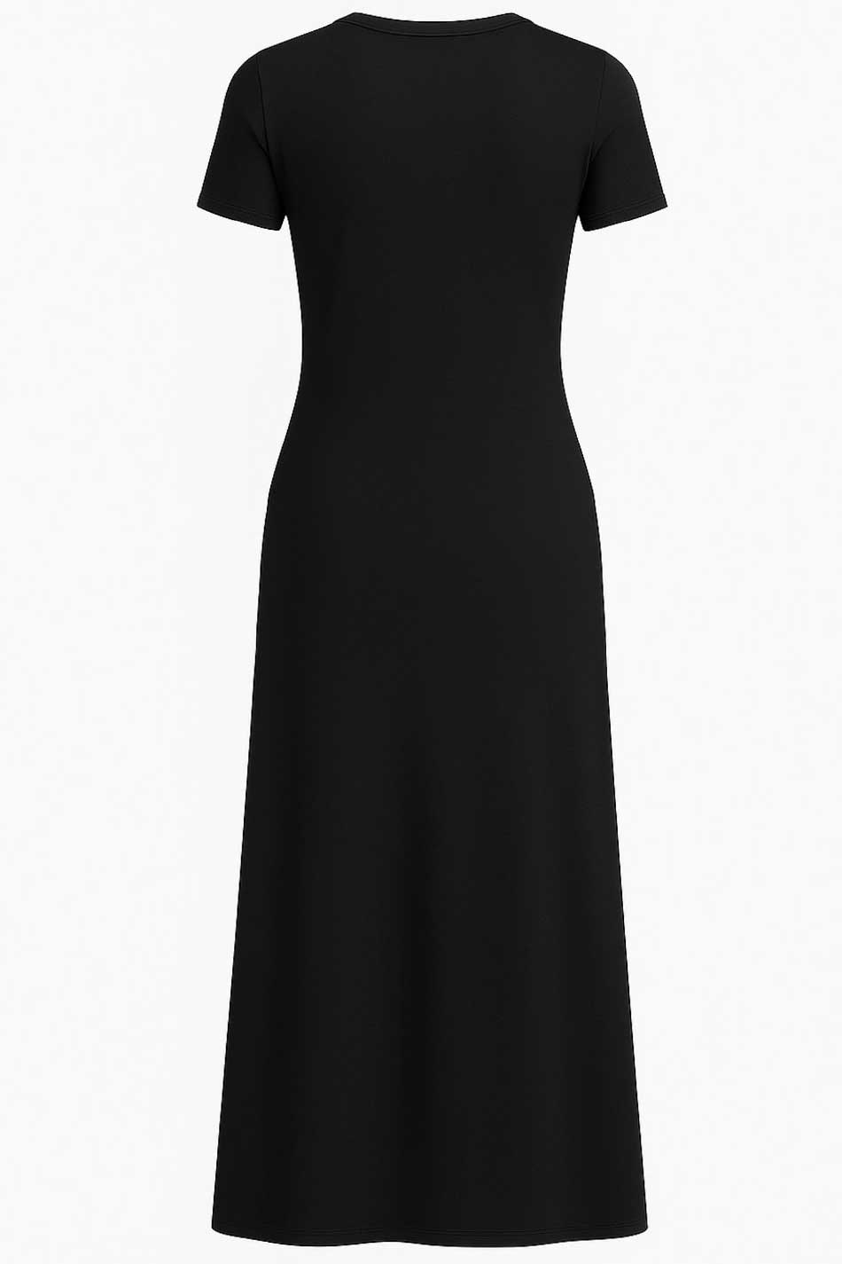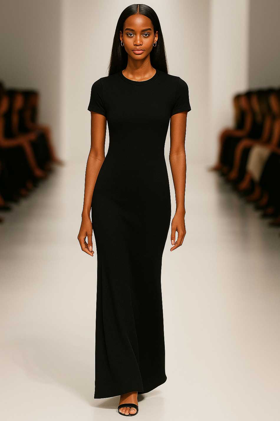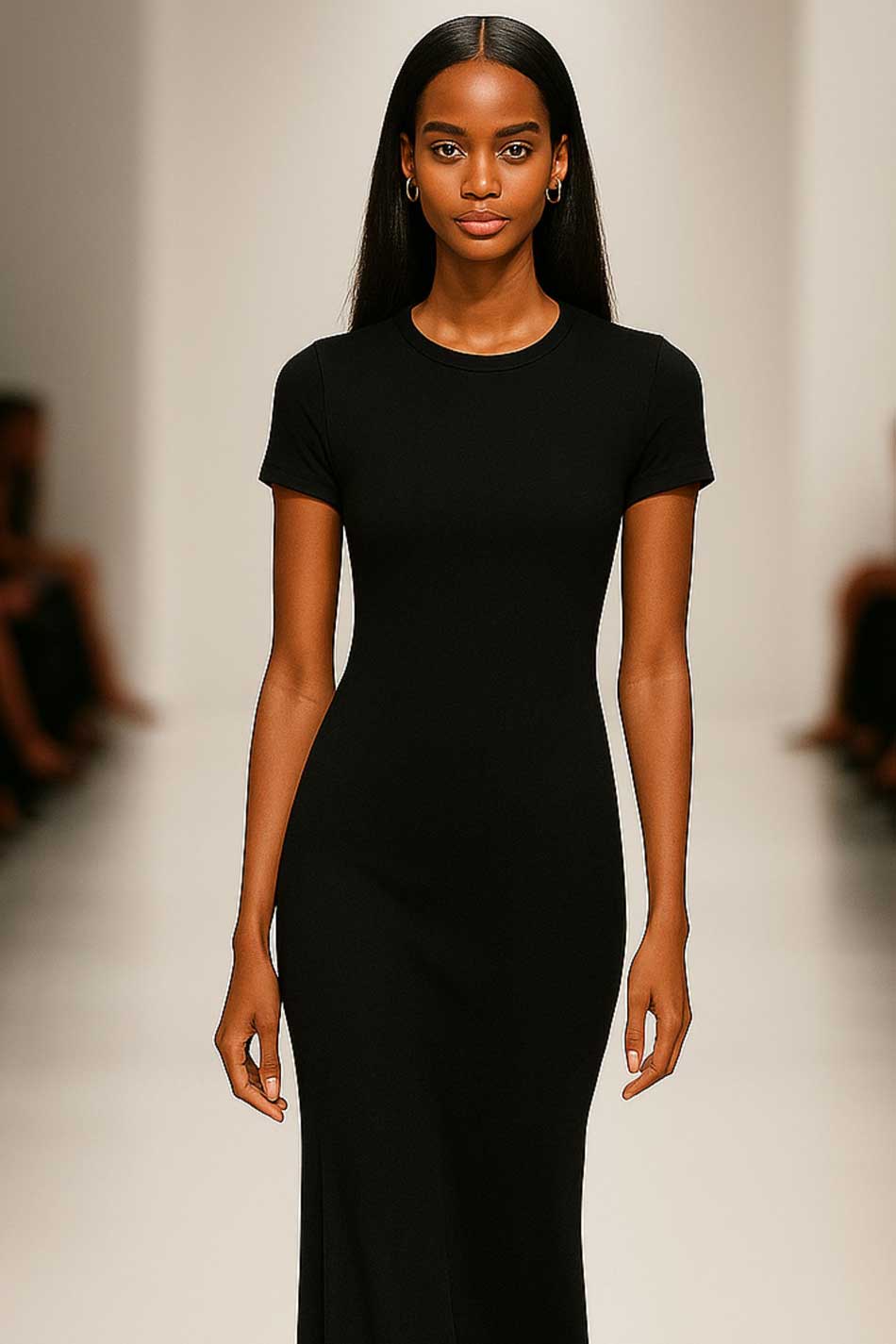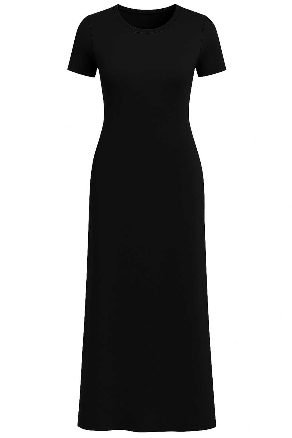 Sukienka ołówkowa długa okrągły dekolt krótki rękaw czarna to klasyk, który nigdy nie wychodzi z mody. Głęboka czerń w połączeniu z prostym, dopasowanym krojem tej sukienki sprawia, że model ten doskonale pasuje na wiele okazji i znakomicie podkreśla sylwetkę. Wykonana z naturalnej jakościowej dzianiny, sukienka ołówkowa długa okrągły dekolt krótki rękaw czarna jest elastyczna, kryjąca i komfortowa w noszeniu. Okrągły dekolt oraz krótkie rękawy nadają całości eleganckiej prostoty, a prosty dół podkreśla ponadczasowy charakter fasonu. Sukienka ołówkowa długa okrągły dekolt krótki rękaw czarna świetnie sprawdzi się zarówno w minimalistycznych zestawach, jak i w połączeniu z wyrazistymi dodatkami. ZAWSZE MODNA!