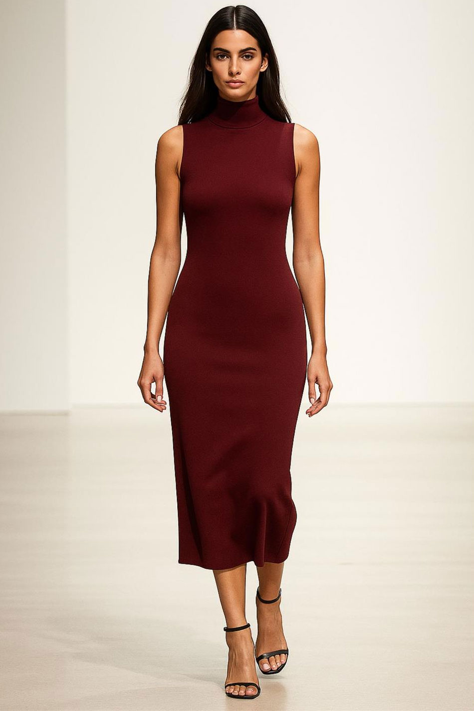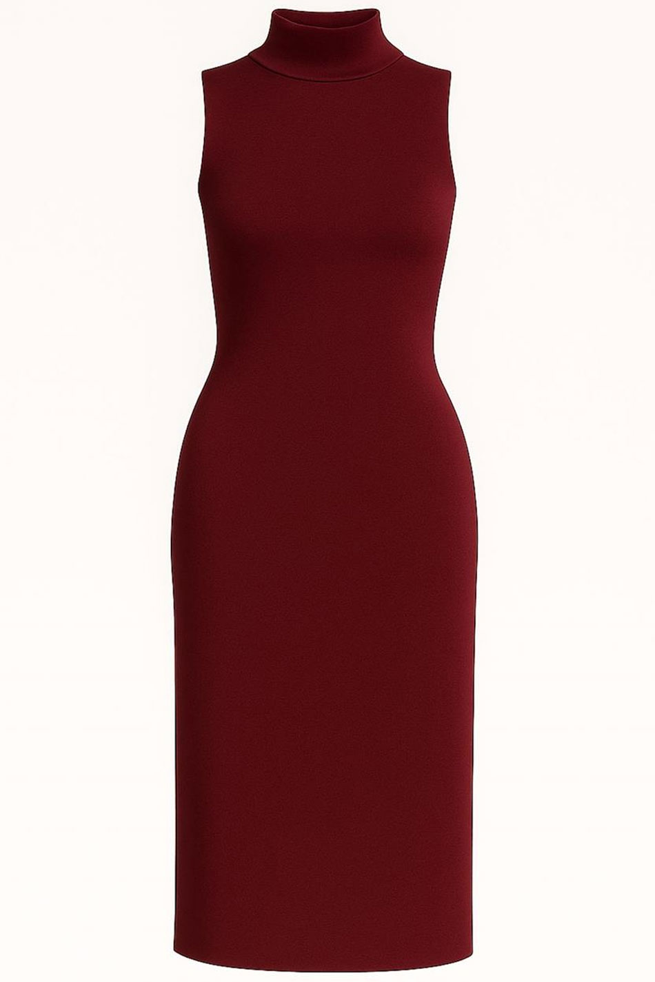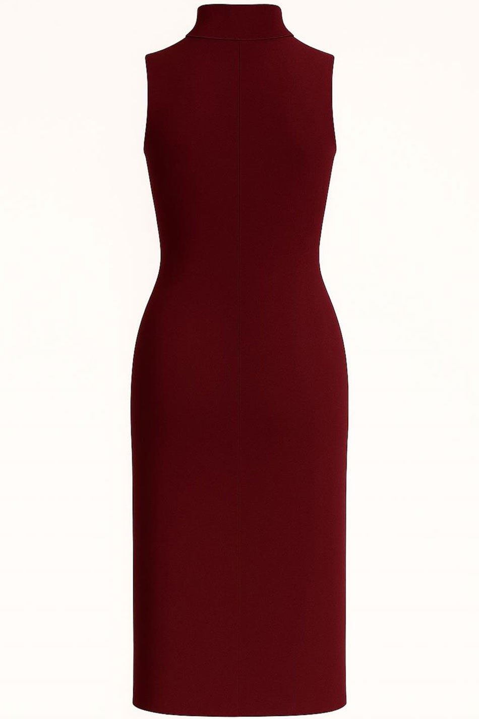 Sukienka ołówkowa midi dekolt golf burgund to model stworzony z myślą o kobietach ceniących klasykę w zmysłowym wydaniu. Odcień burgundu tej sukienki podkreśla elegancję i doda głębi każdej stylizacji, a jej dopasowany, ołówkowy krój pięknie wymodeluje sylwetkę. Kreacja ta uszyta została z wysokiej jakości dzianiny od polskiego producenta – elastycznej, miękkiej i przyjemnej w dotyku, która dopasowuje się do ciała, nie tracąc kształtu. Golfowy dekolt tej sukienki subtelnie otuli szyję, nadając całości ciepła i szykownego charakteru. Brak rękawów i zapięć sprawia, że model ten będzie wyjątkowo komfortowy i praktyczny w noszeniu. Sukienka ołówkowa midi dekolt golf burgund to idealna baza pod marynarkę lub płaszcz do wielu stylizacji na różne okazje. KOBIECA I SZLACHETNA!