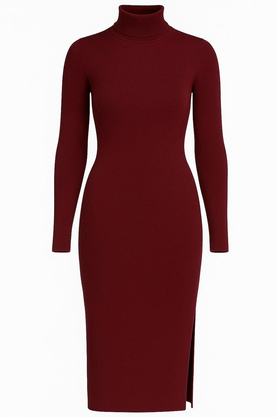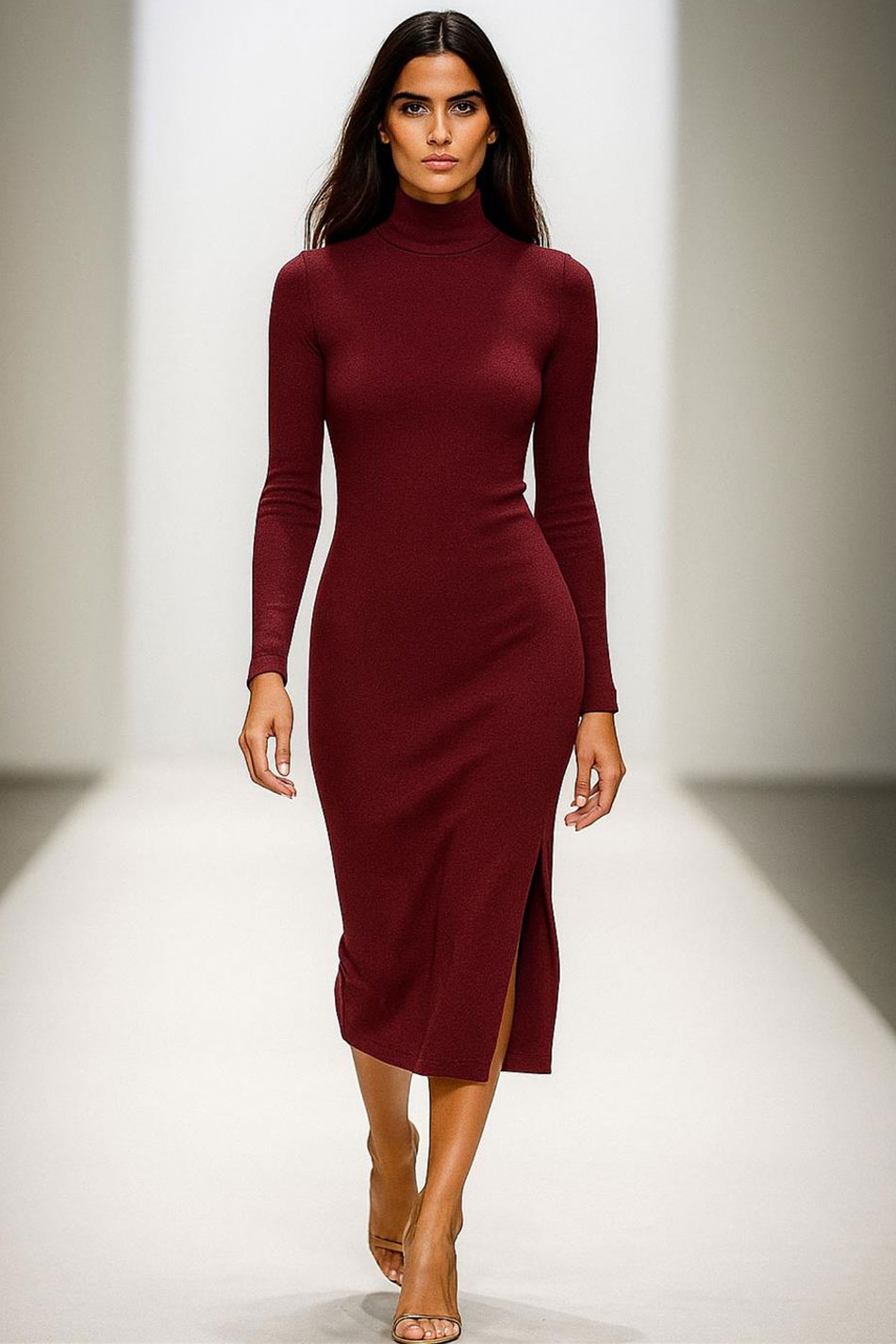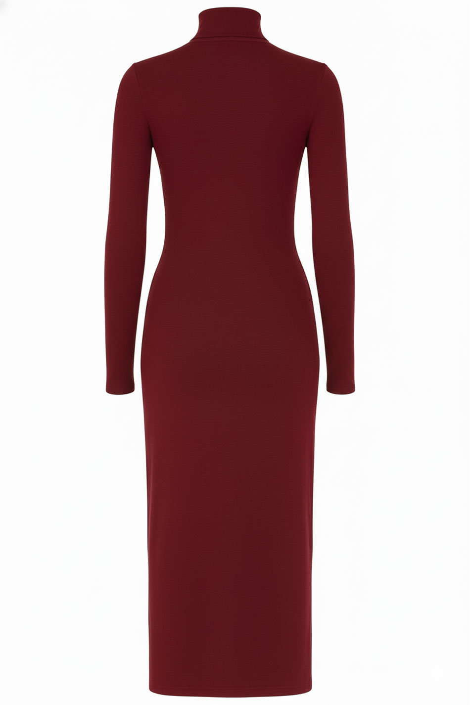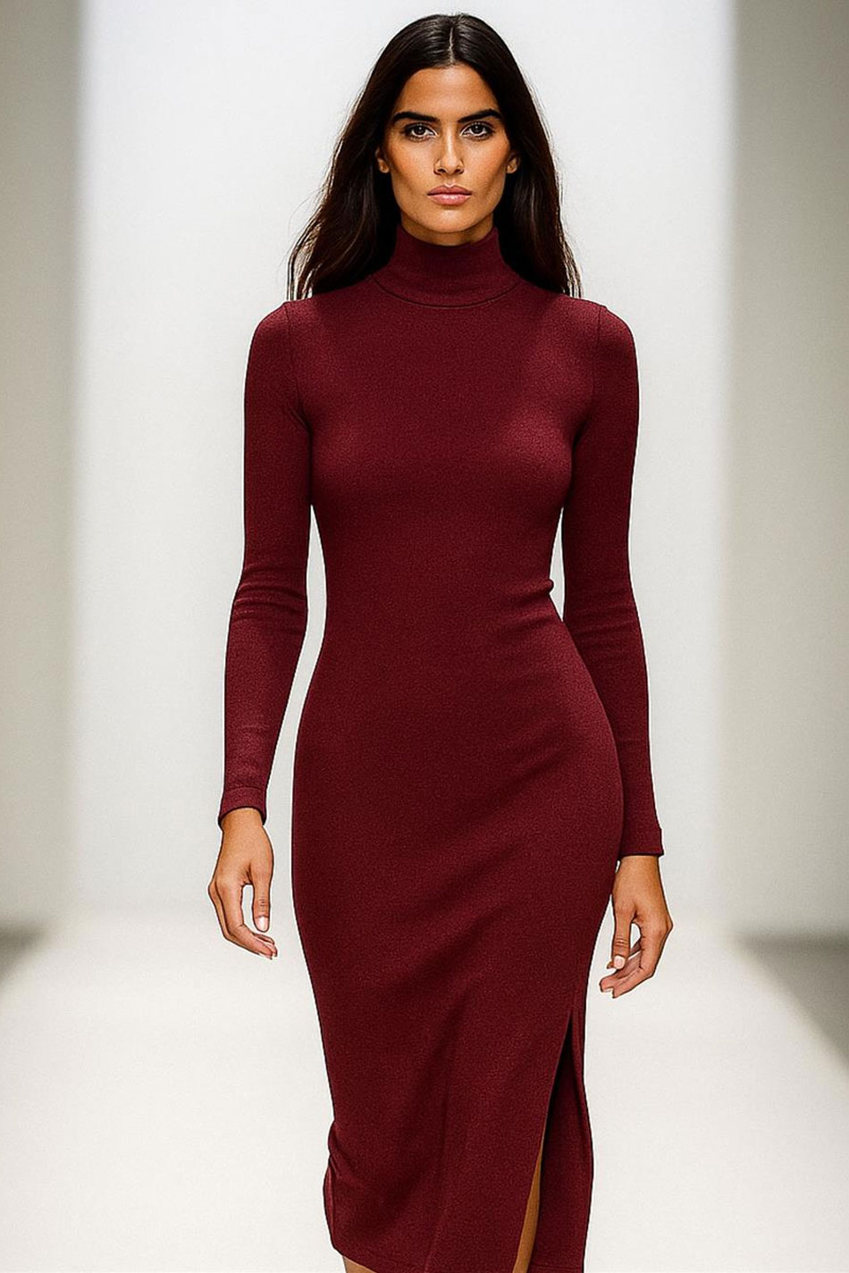 Sukienka ołówkowa midi dekolt golf długi rękaw burgund przyciąga uwagę elegancją i głębią barwy. Jej dopasowany krój znakomicie podkreśli sylwetkę, a miękka, średniej grubości dzianina, z której została uszyta, zapewni wygodę i nienaganny wygląd nawet przez cały dzień, czy wieczór. Golf tej kreacji dodaje jej wyrafinowania, a rozporek z boku wprowadza lekki, ale bardzo kobiecy akcent. Odcień burgundu emanuje ciepłem i pewnością siebie i doskonale sprawdzi się w stylizacjach zarówno na chłodniejsze, jak i cieplejsze dni. Sukienka ołówkowa midi dekolt golf długi rękaw burgund zaprezentuje się idealnie w różnych zestawach i z pewnością będzie ona idealnym wybór dla kobiet, które lubią wyglądać elegancko bez wysiłku. ELEGANCJA BEZ WYSIŁKU!