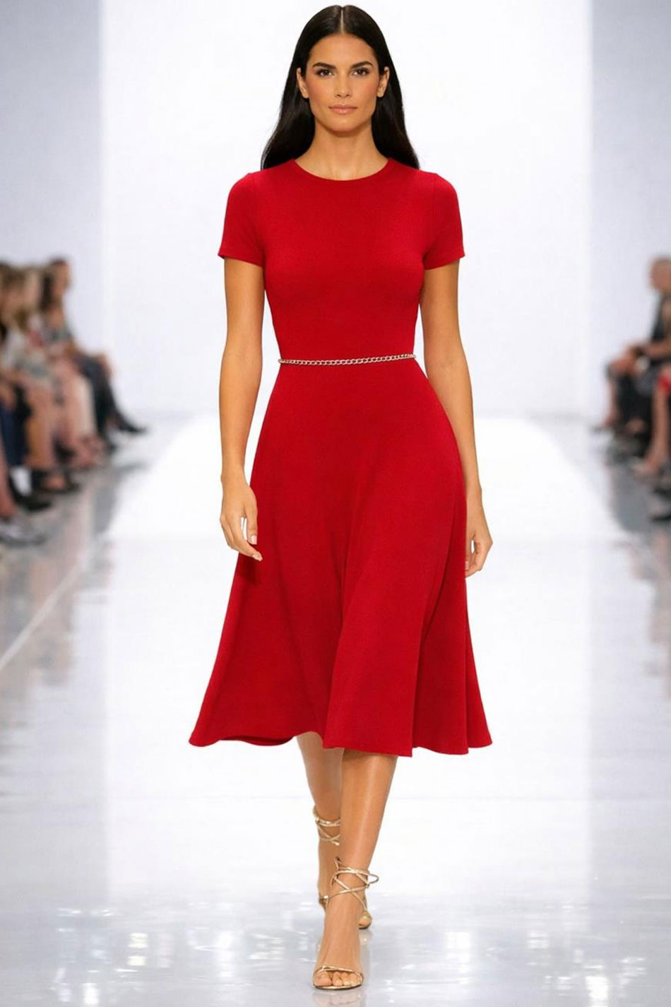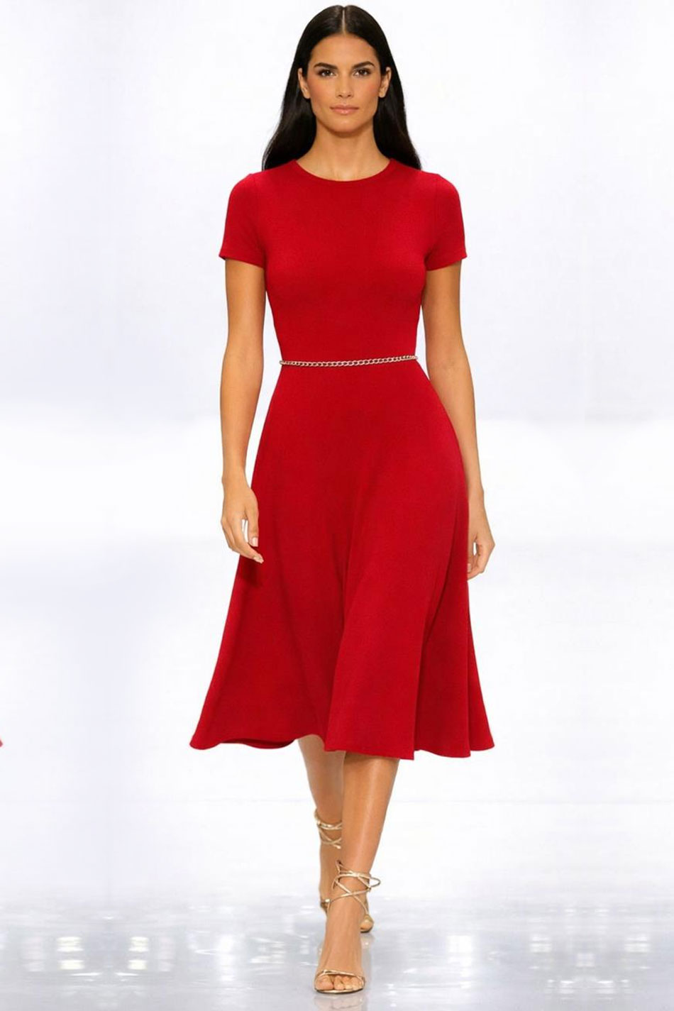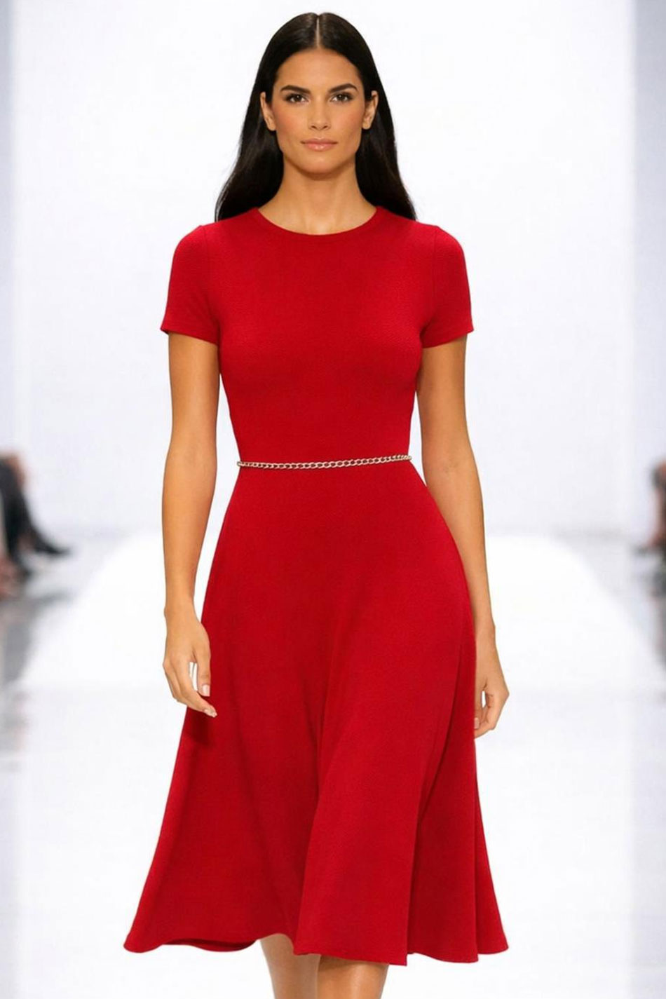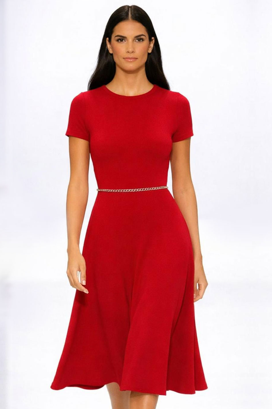 Sukienka ołówkowa midi okrągły dekolt krótki rękaw czerwona stanowi esencję kobiecej klasyki w nowoczesnym wydaniu. Kreacja ta uszyta została z najwyższej jakości, elastycznej dzianiny o średniej grubości, która jest niezwykle miękka w dotyku, w pełni kryjąca oraz odporna na odkształcenia podczas codziennego użytkowania. Krój tej sukienki, dopasowany do figury, w zestawieniu z długością midi oraz klasycznym, okrągłym dekoltem tworzy model pełny klasy i profesjonalizmu. Brak zapięć sprawia, że zakładanie i zdejmowanie sukienki ołówkowej midi okrągły dekolt krótki rękaw czerwonej jest szybkie i wygodne, a gładka faktura materiału czyni ją doskonałą bazą pod wszelkiego rodzaju okrycia wierzchnie. Krótkie rękawy nadają całości lekkości, dzięki czemu model ten będzie trafnym wyborem na wiosenne przyjęcia, koktajlowe wyjścia oraz jako element codziennego stroju. Sukienka ołówkowa midi okrągły dekolt krótki rękaw czerwona to idealna propozycja dla każdej, ceniącej minimalizm i wysoką jakość wykonania, kobiety. PRZEŚWIETNA!