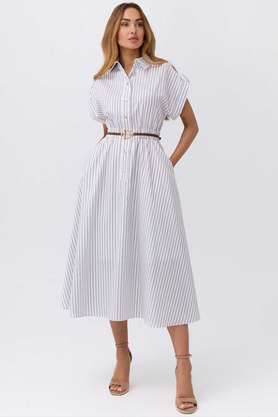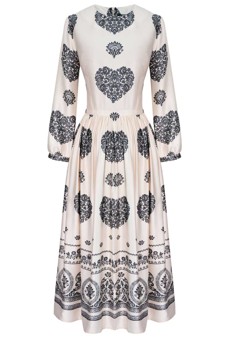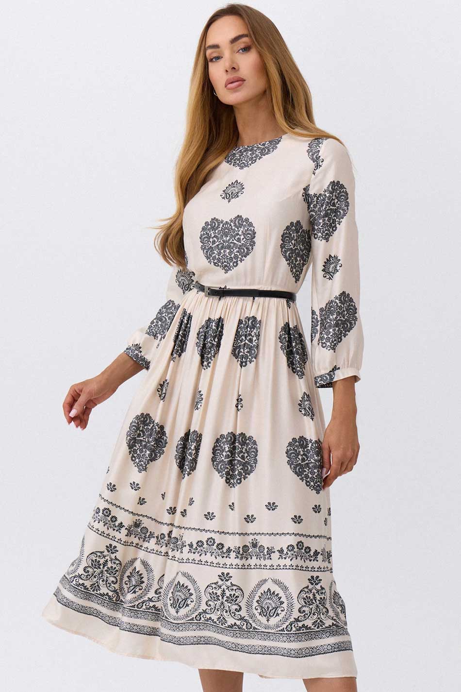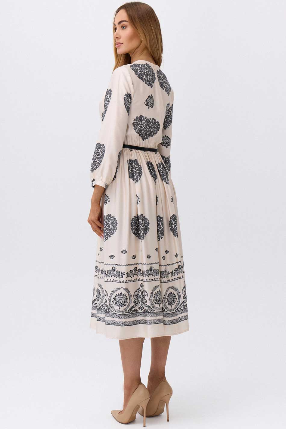 Sukienka Paola śmietankowa to subtelna i niezwykle stylowa propozycja, która zachwyca jasną, elegancką kolorystyką przełamaną kontrastowymi, czarnymi wzorami. Jej delikatny odcień śmietanki nadaje całości lekkości i świeżości, jednocześnie stanowiąc idealne tło dla wyrazistych, ornamentalnych zdobień inspirowanych stylem etnicznym. Sukienka ta zaprojektowana została tak, aby zapewnić maksymalny komfort i swobodę noszenia – dopasowana talia, podkreślona cienkim paskiem, idealnie wyeksponuje kobiecą sylwetkę, a lekko rozkloszowany dół będzie pięknie pracował w ruchu. Góra tego modelu jest bardziej zabudowana, z klasycznym, okrągłym dekoltem, co nadaje sukience Paola śmietankowej eleganckiego i harmonijnego charakteru. Długie rękawy, o lekko bufiastym wykończeniu, dodają tej kreacji modowego wyrazu i subtelnej lekkości. Na tle śmietankowej tkaniny, z której wykonana została ta sukienka, wyróżniają się czarne, dekoracyjne wzory – charakterystyczne motywy o organicznych, roślinnych formach rozmieszczone w centralnych partiach tego modelu oraz szeroki pas zdobionym bogatym ornamentem w stylu retro na dole. Sukienka Paola śmietankowa wykonana została z wysokiej jakości wiskozy więc zagwarantuje przewiewność oraz komfort noszenia nawet przez cały dzień oraz doskonale sprawdzi się zarówno w codziennych stylizacjach, jak i podczas bardziej wyjątkowych okazji, łącząc w sobie elegancję, wygodę i unikalny design. MEGA STYLOWA!
