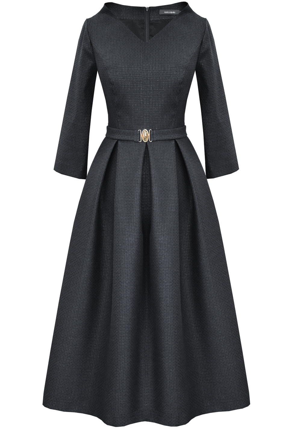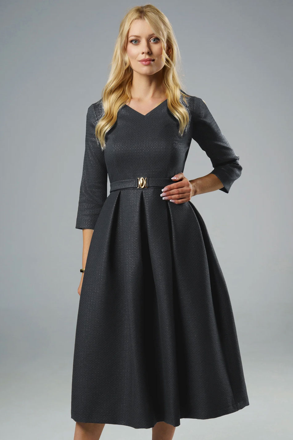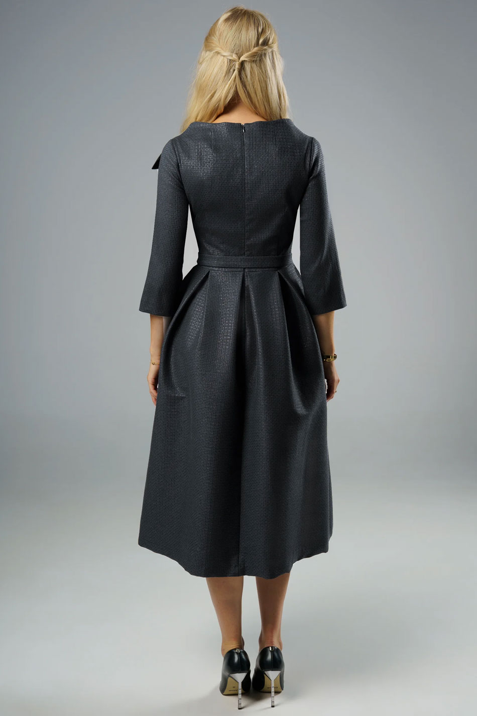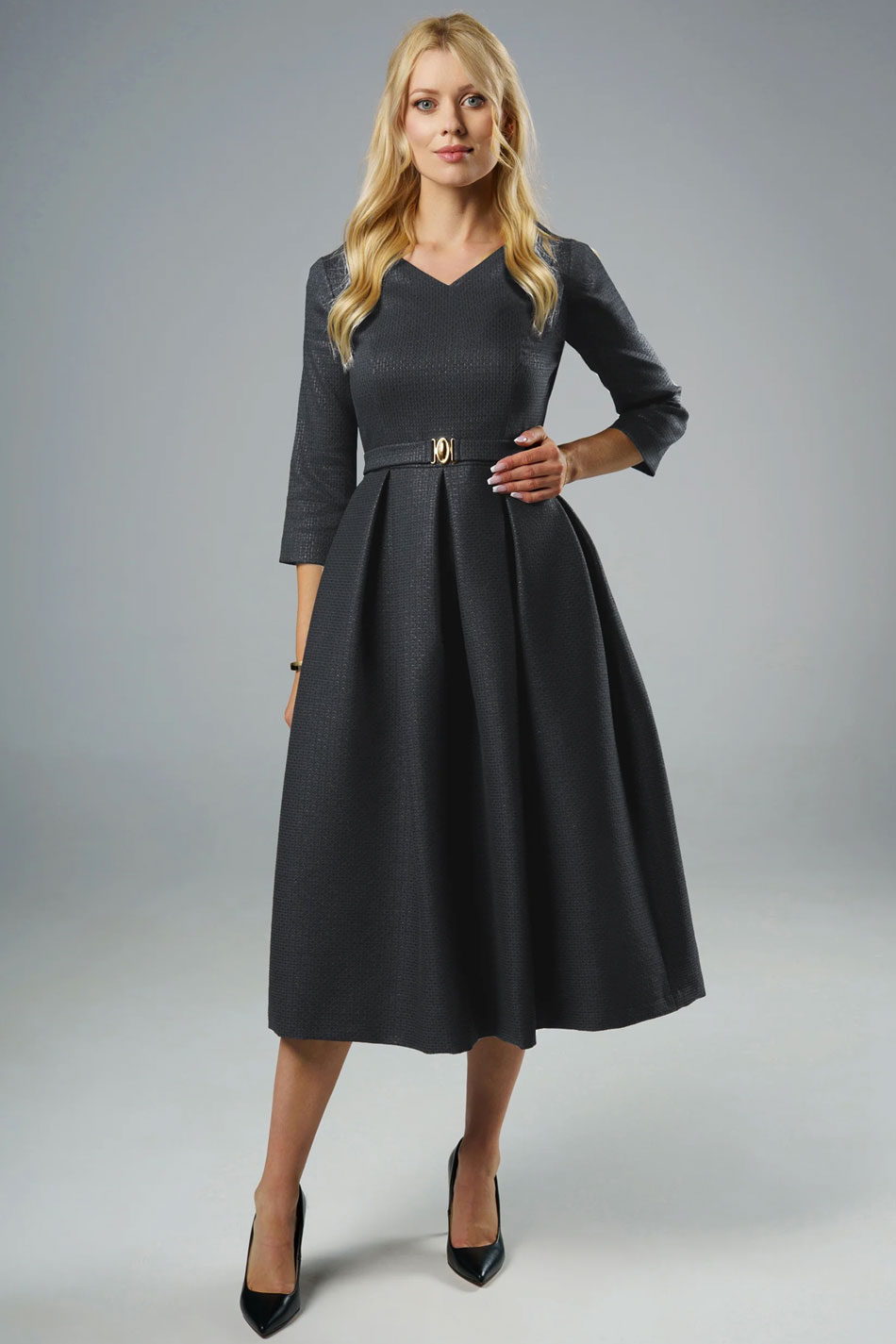 Sukienka Saida grafitowa to połączenie subtelnej nowoczesności z klasycznym krawiectwem. Suknia ta powstała z włoskiej, żakardowej, elastycznej tafty ze srebrną nitką, której lekki połysk i delikatna faktura tworzą efekt szlachetnego minimalizmu. Fason tego modelu, z dopasowaną górą i rozkloszowanym dołem, pozwala na pięknie modelowanie sylwetki, podkreślenie linii talii i nadaje całości lekkości. Pasek sukienki Saida grafitowej, z ozdobną, złotą klamrą, stanowi elegancki detal, który dodaje tej kreacji wyrafinowanego charakteru. Całość odszyta jest na wiskozowej podszewce, co gwarantuje komfort noszenia tej sukienki i sprawia, że doskonale układa się ona w ruchu. Sukienka Saida grafitowa to model, który łączy wygodę z elegancją – idealny na wieczorne spotkania, uroczystości i inne wyjątkowe okazje. "SZLACHETNA"!